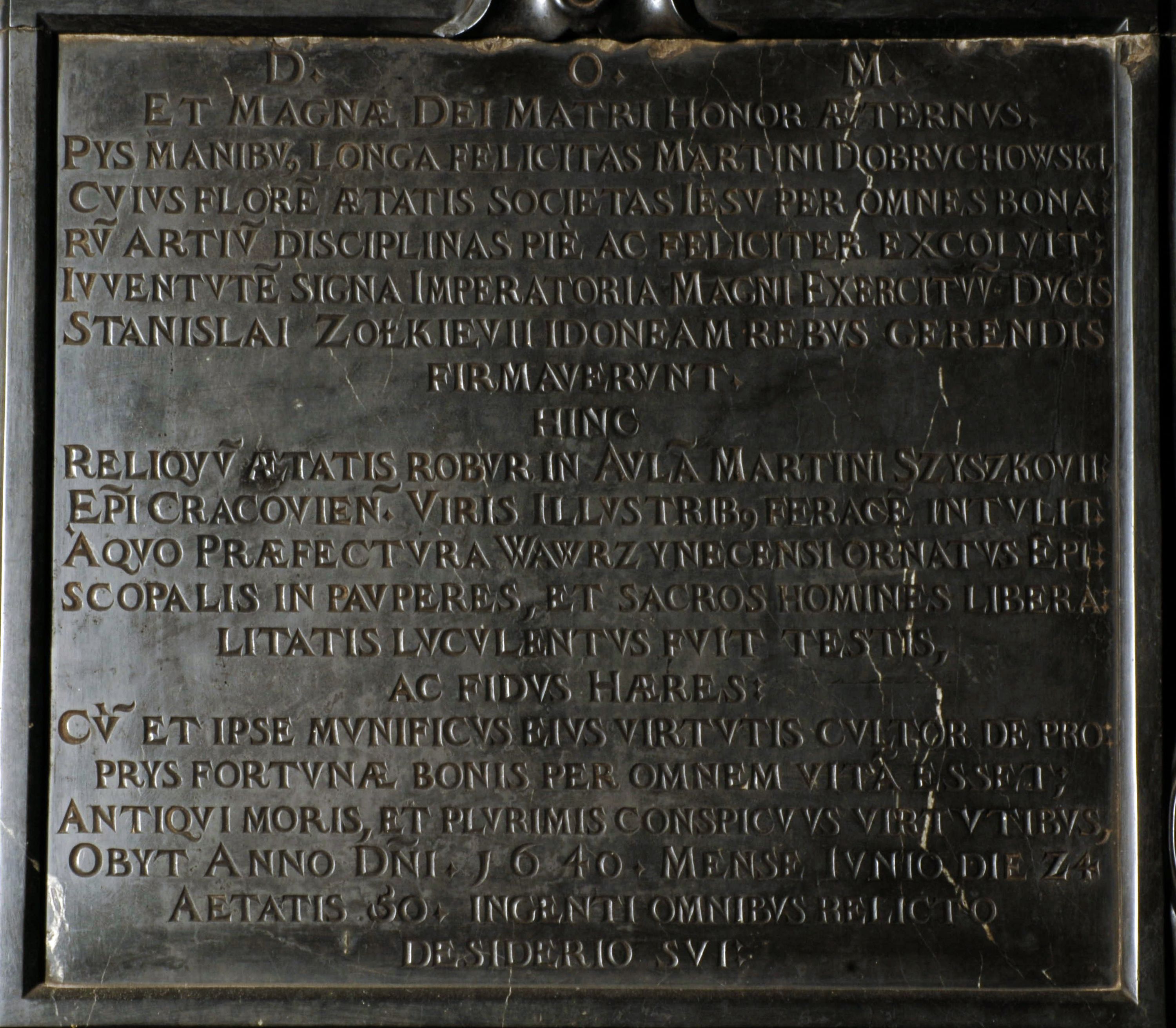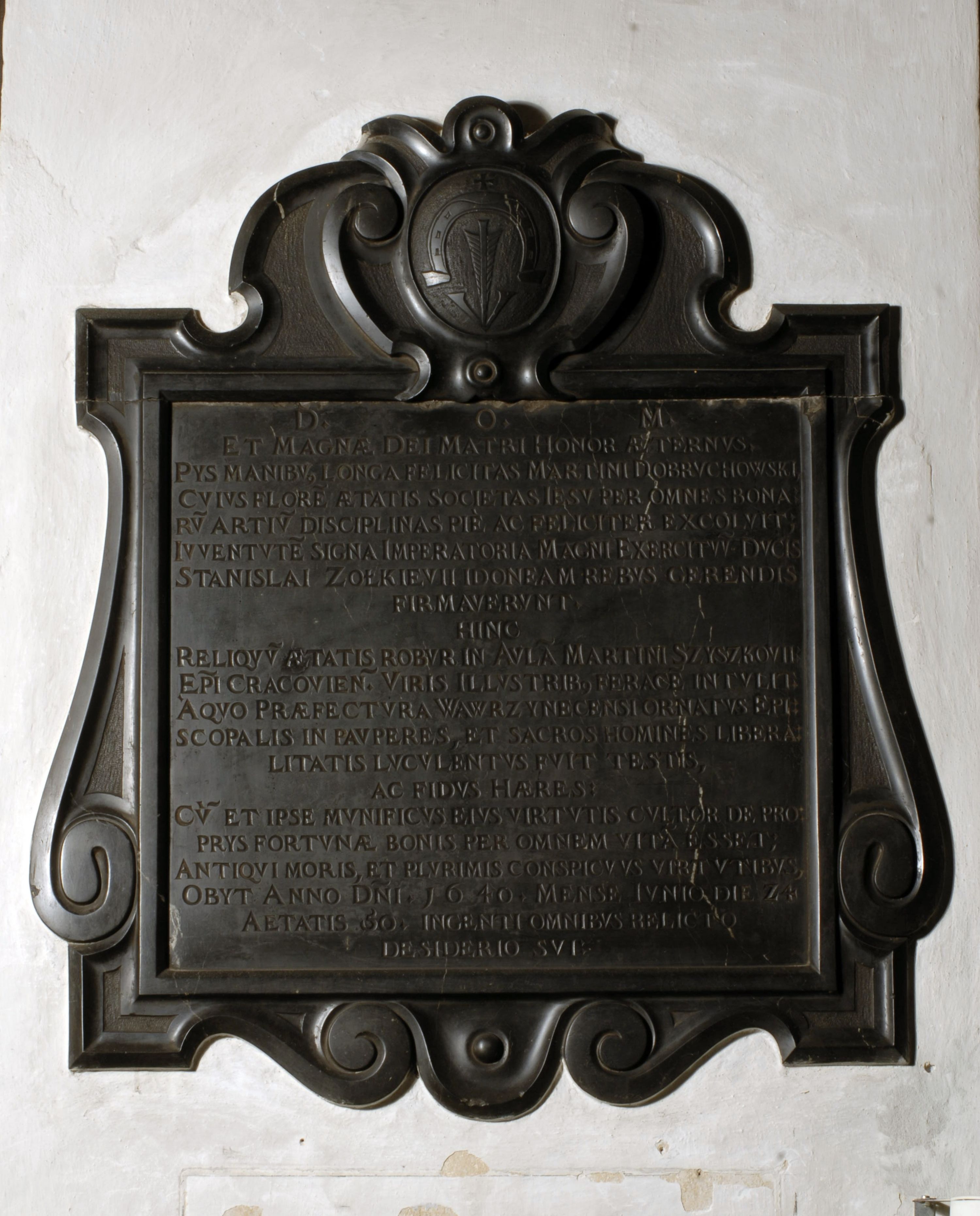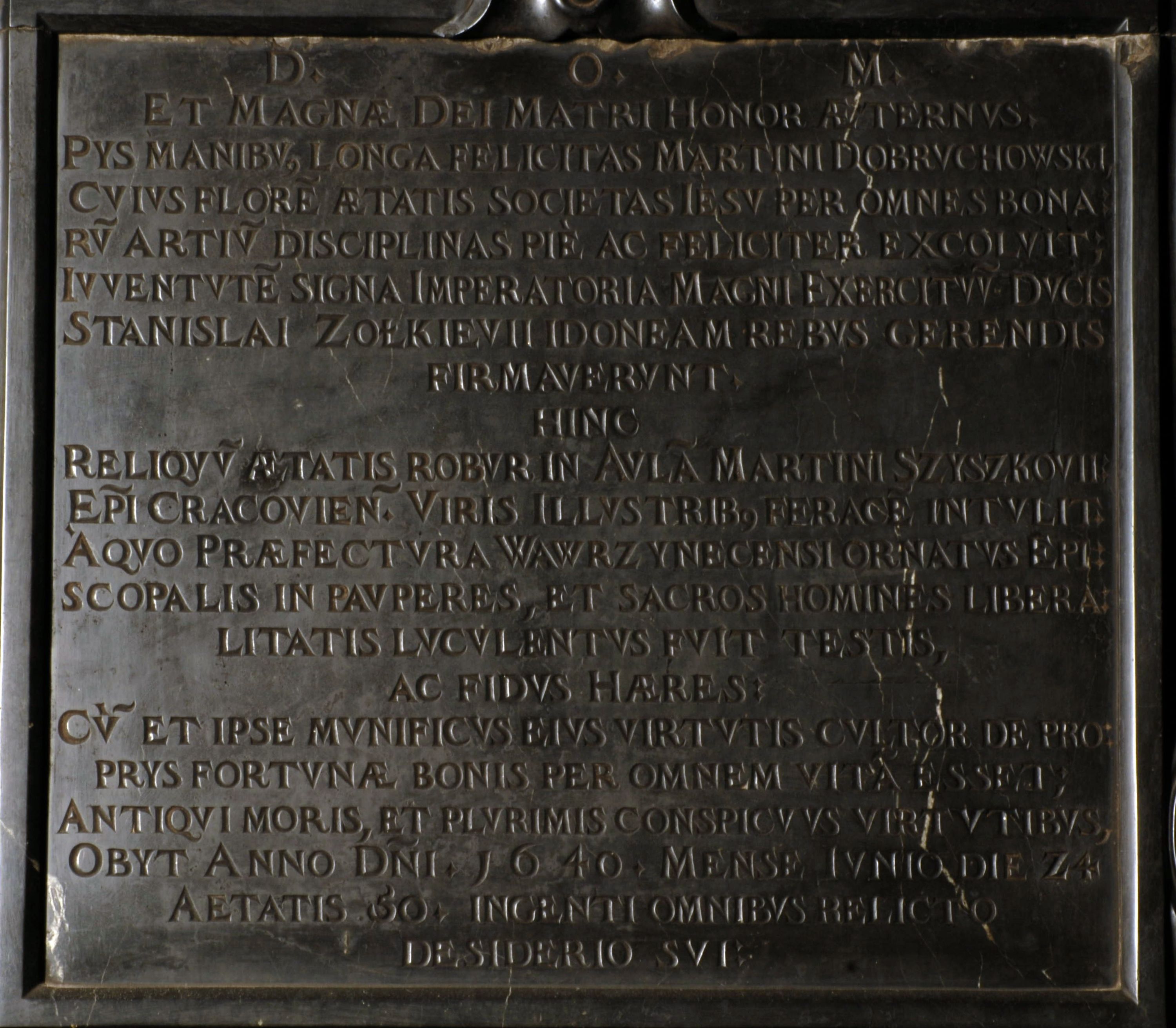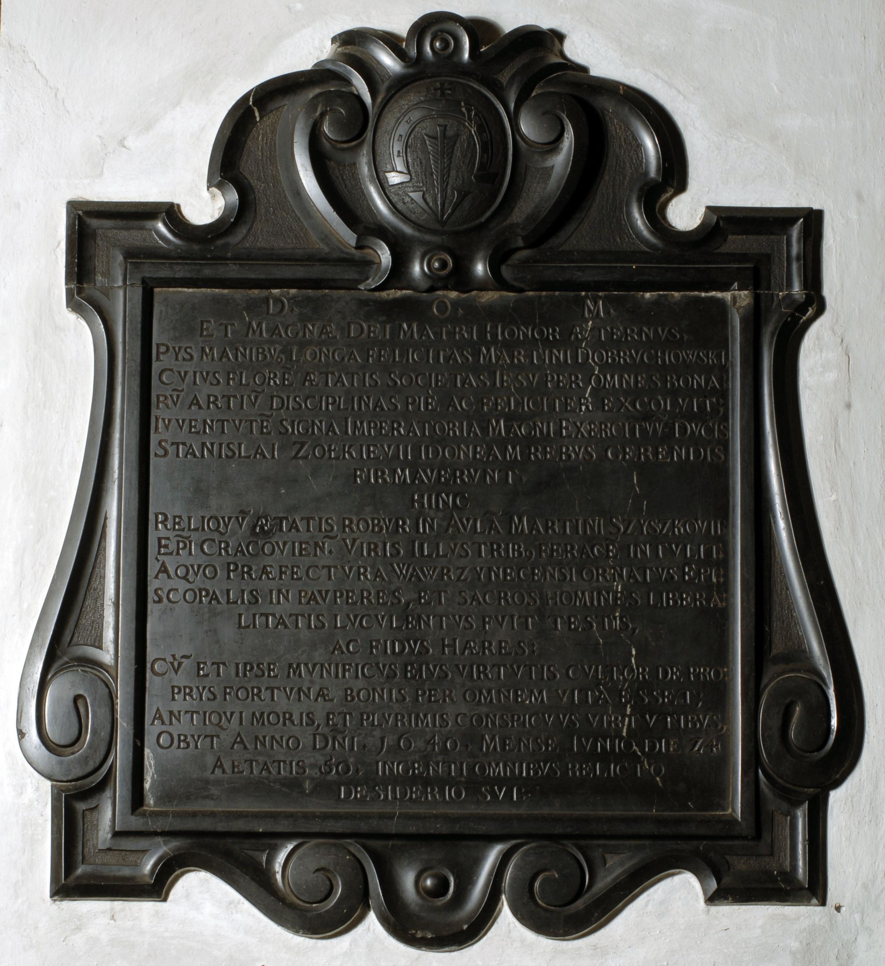 The epitaph plaque of father Marcin Dobruchowski, a soldier of Stanisław Żółkiewski and a courtier of Cracovian bishop Marcin Szyszkowski, was probably made of Dębnik marble (a material extremely popular in Polish art of the Baroque era) in the workshop in Dębnik or Cracow, after his death in 1640.