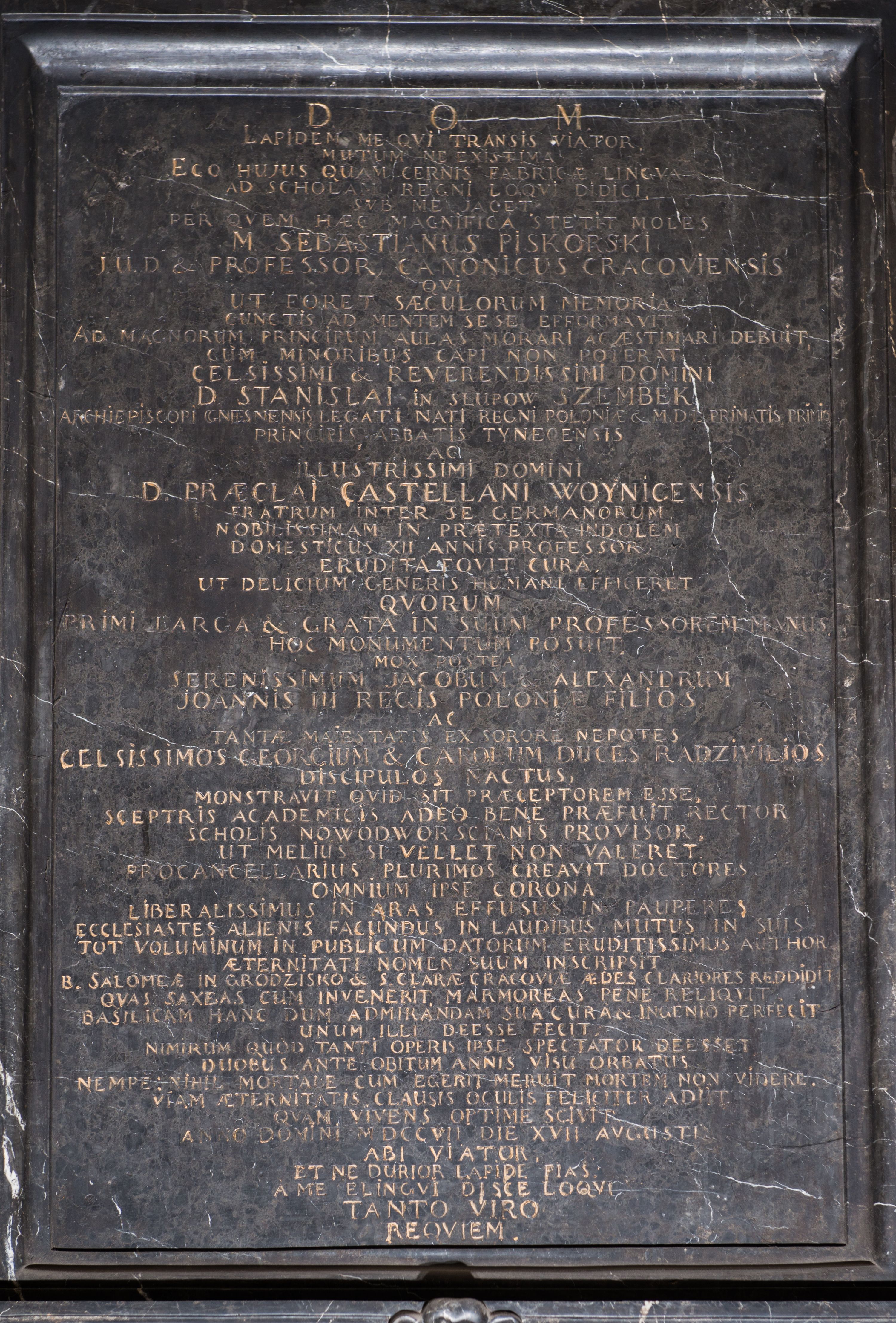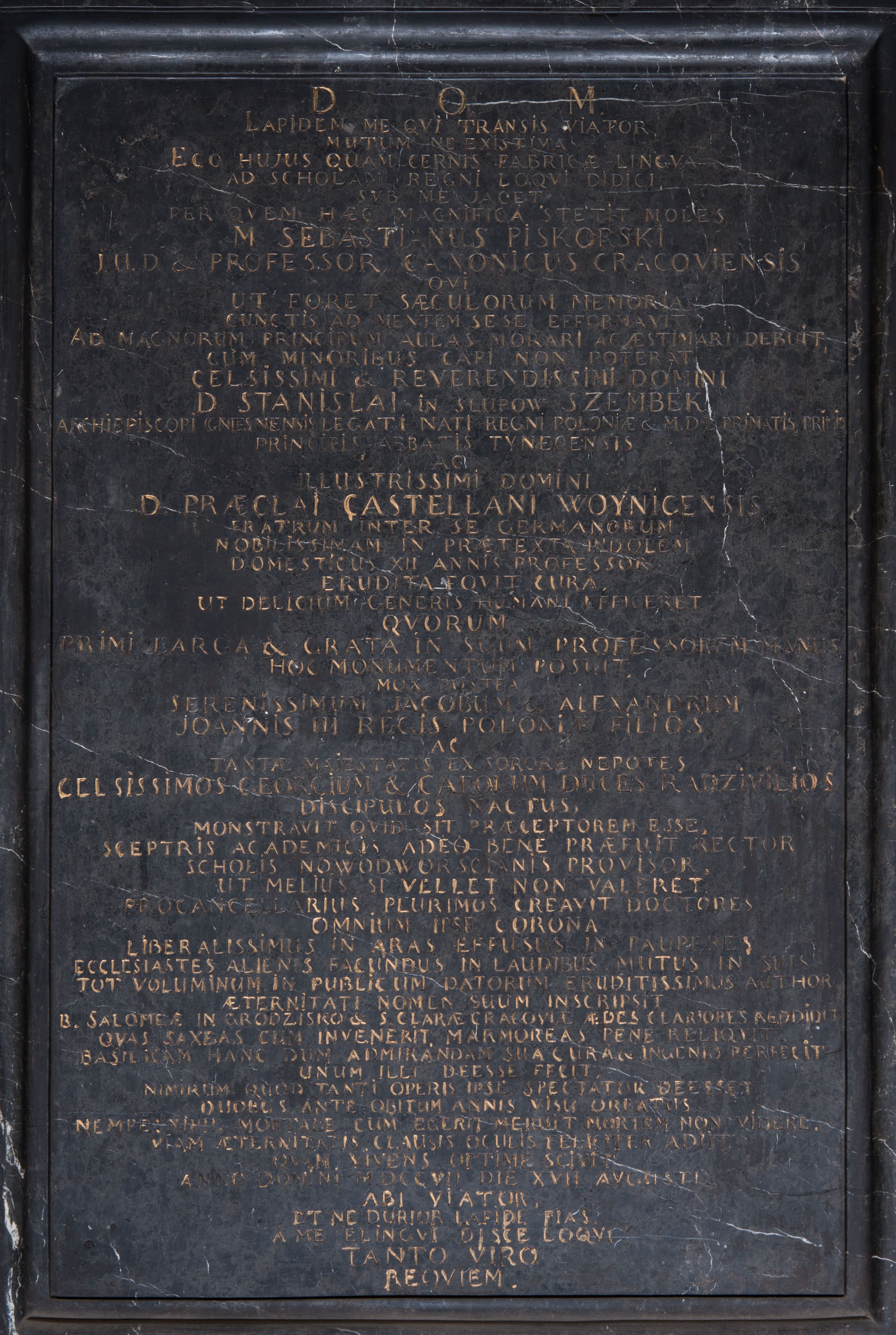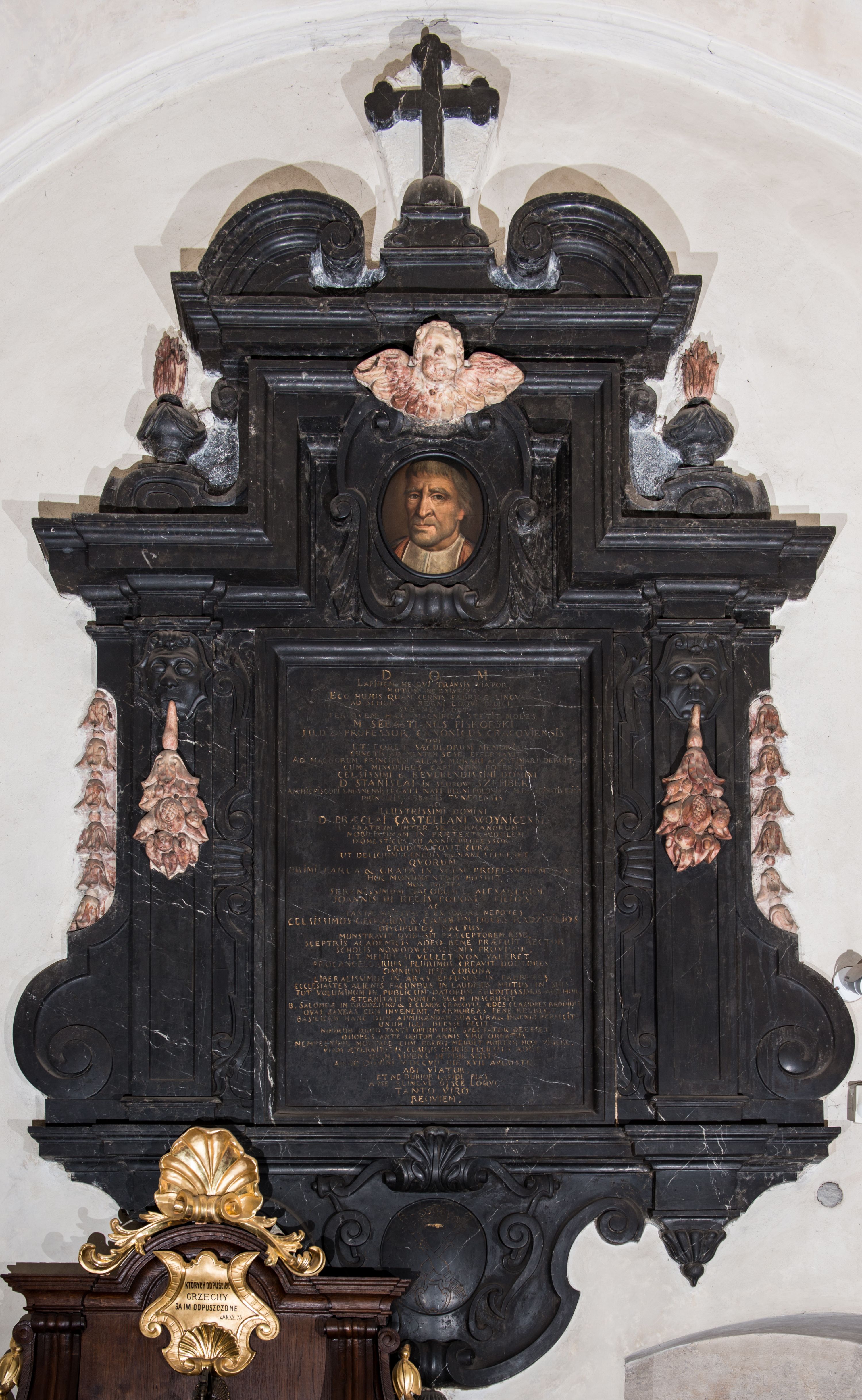 The epitaph plaque of distinguished for the church father Sebastian Piskorski (a construction foreman of the temple) was funded by his alumni – Stanisław Szembek, Archbishop of Gniezno and Primate of Poland, and Przecław Szembek, Castellan of Wojnicki – and made in 1721-1722 by the stonemason in Dębnik, Wojciech Maciejowski.