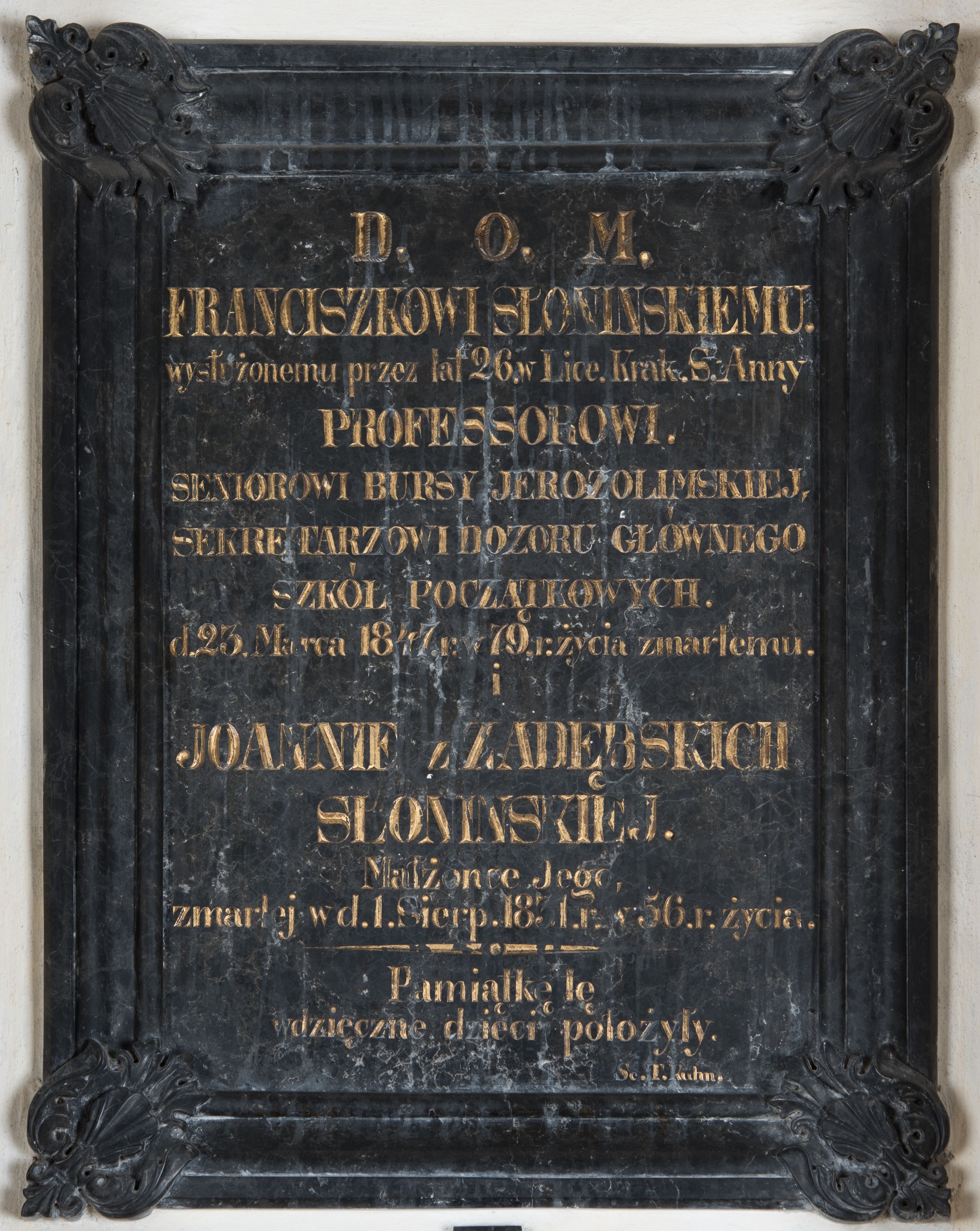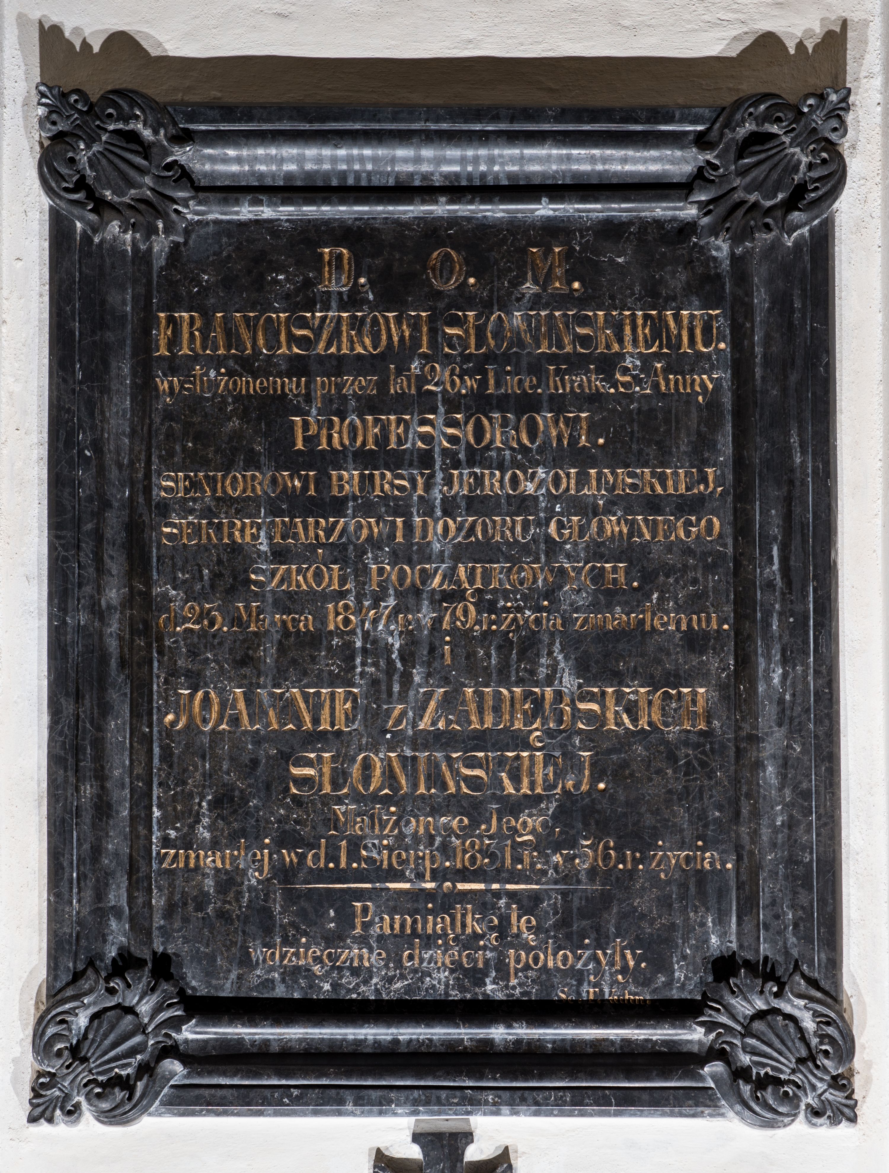 The epitaph plaque of Franciszek Słoniński (a professor at St. Anne High School) and his wife Joanna (née Zadębska), characterised by a simple form, was funded on the initiative of children, probably after 1847.