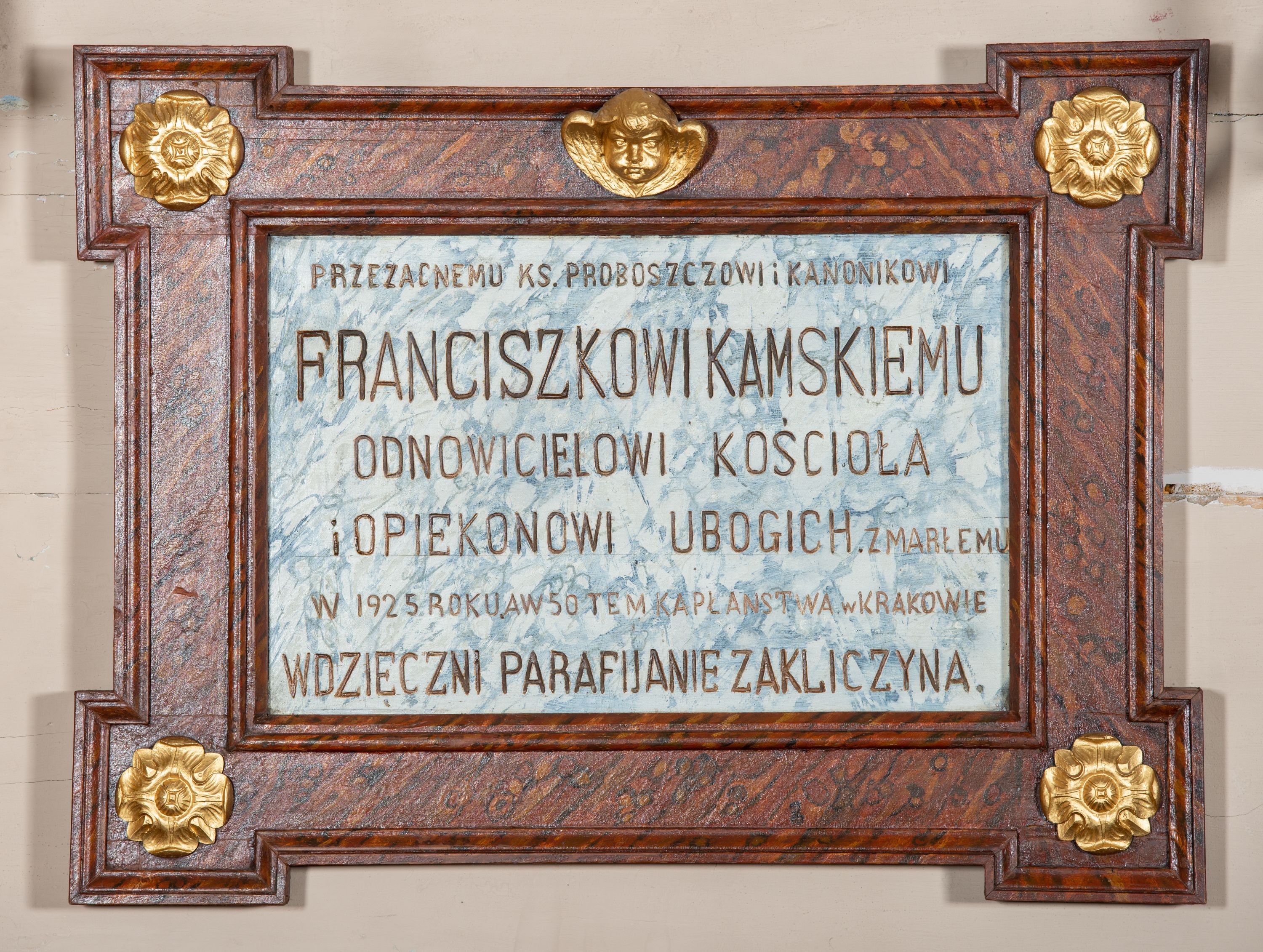 The epitaph is dedicated to father Franciszek Kamski, parish priest of the parish in Zakliczyn in the years 1883-1900. Father Kamski came to Zakliczyn in 1882. Among other things, during his ministration, the church was renovated and stained glass windows ordered for the chancel and nave windows, and probably the interior was also repainted. He died on 15 November 1925.