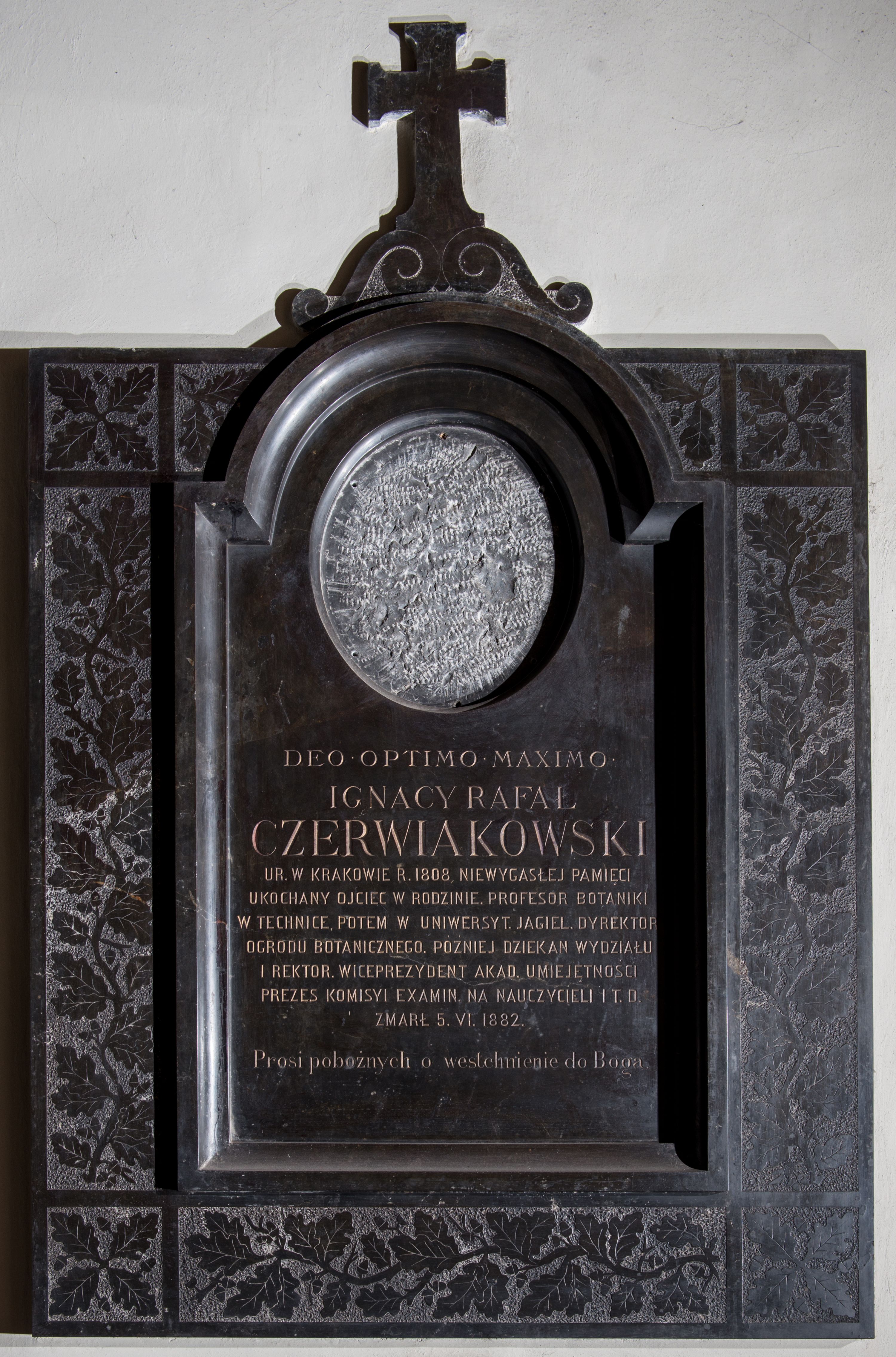 The epitaph plaque of Ignacy Rafał Czerwiakowski, a distinguished botanist, director of the Cracow Botanical Garden and a rector who deceased in 1882, was made of Dębnik marble. It is not excluded that the motif of leaf bunches in a frame, so characteristic of works from the 17th century and created in stone workshops in Dębnik, was deliberately introduced in this work to emphasise the professor's interests and merits.