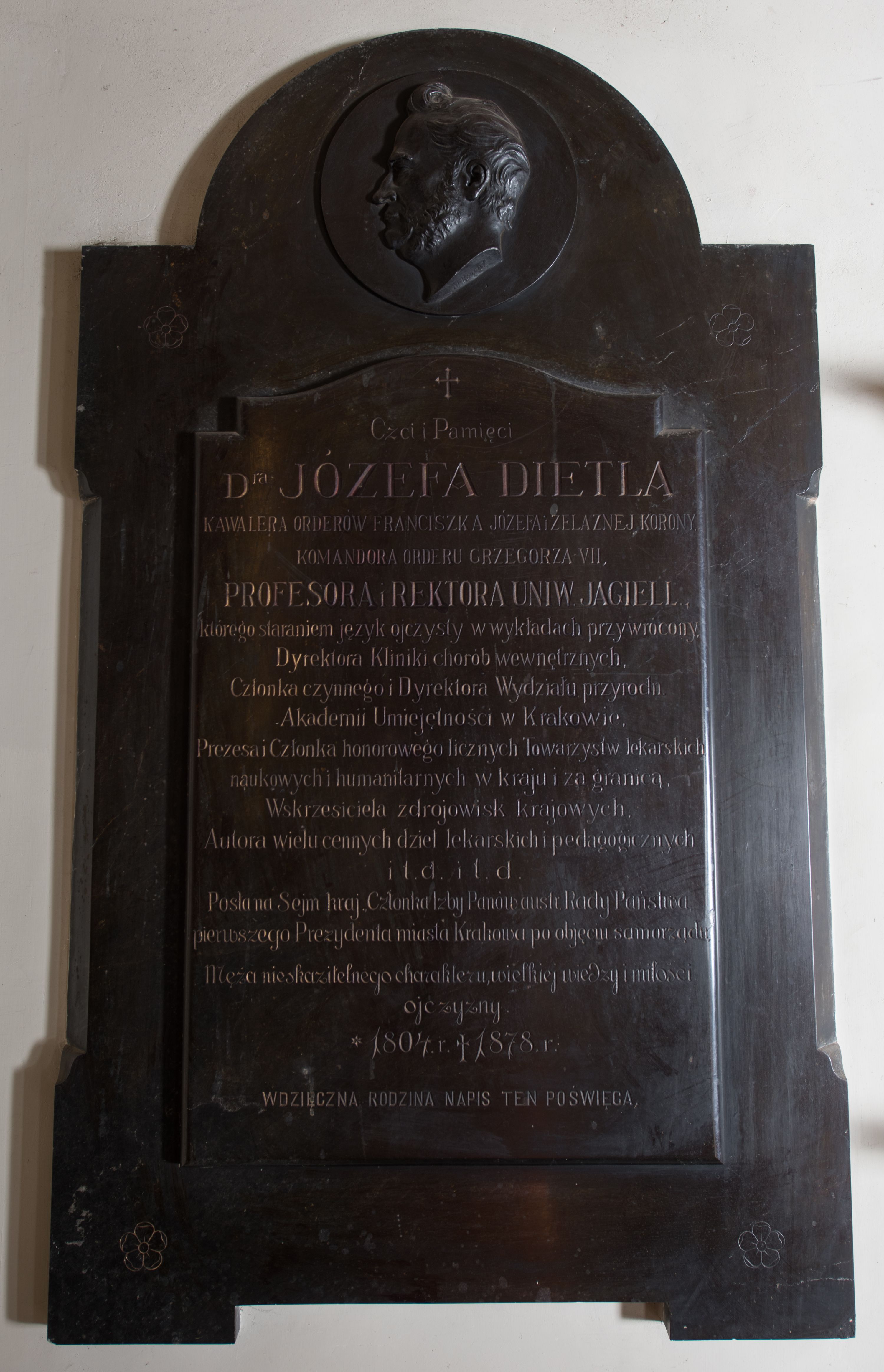 The epitaph plaque of Józef Dietl – a rector of the Jagiellonian University who deceased in 1878 – funded by family members. A bust was made by Michał Korpal – a famous Cracovian sculptor, portraitist, author of a number of works at the Rakowicki Cemetery.