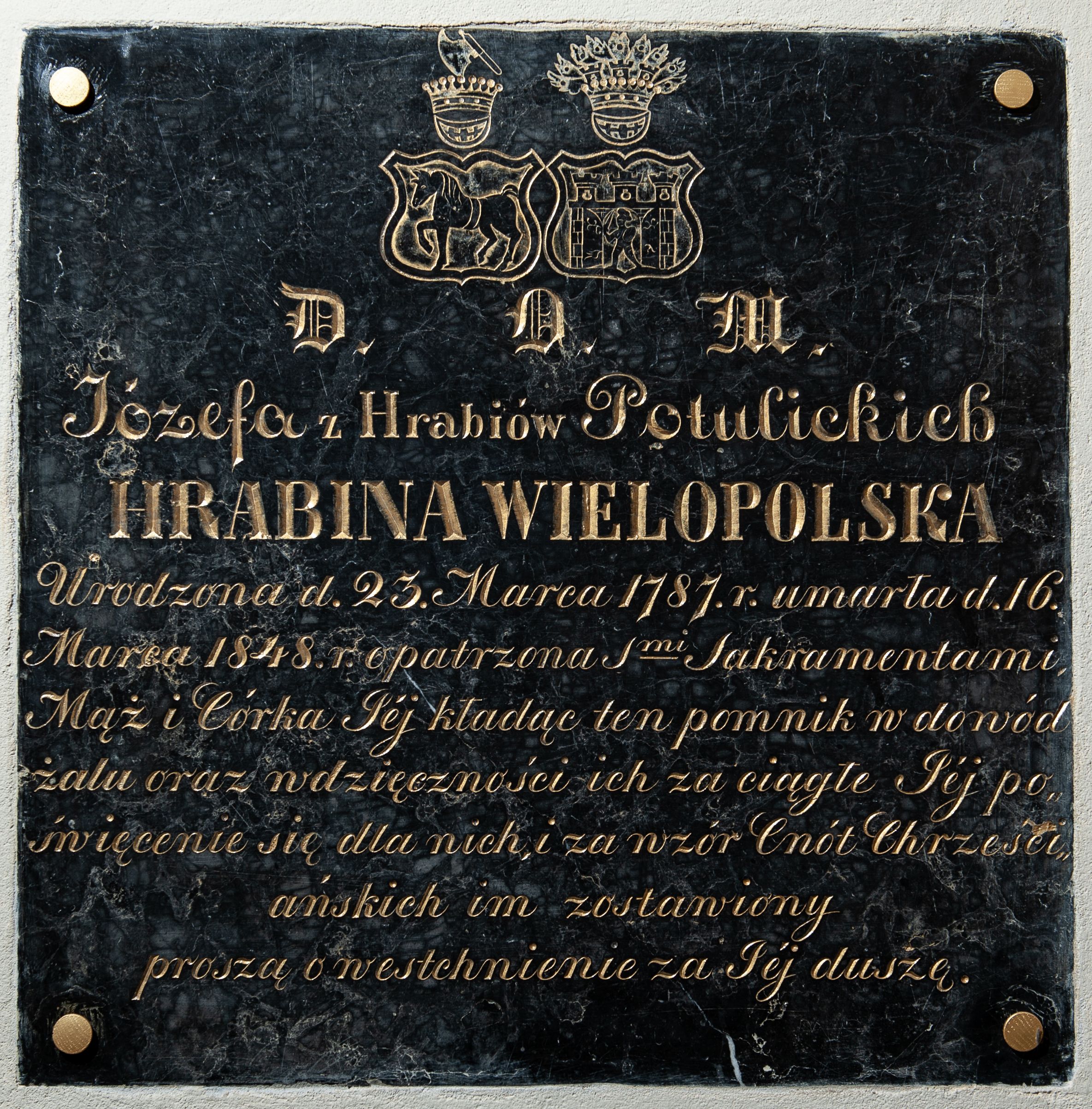 The epitaph plaque (1848) commemorating Countess Józefa (née Potulicka) Wielopolska was made of black Dębnik marble.