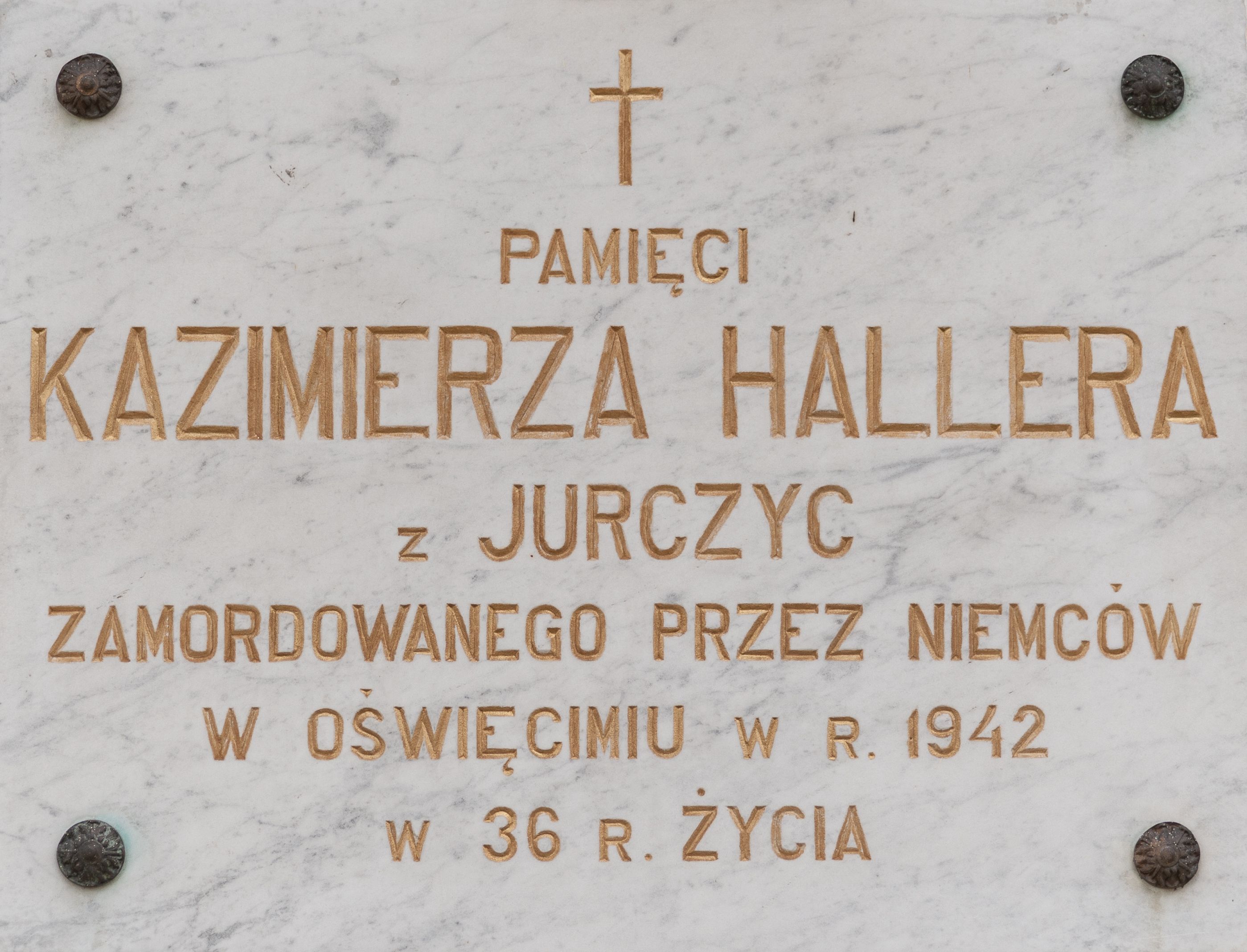 The epitaph plaque commemorates Kazimiez Haller - the son of Karol Haller who was the brother of general Józef Haller - murdered on 7 May 1942 in the concentration camp during World War II.