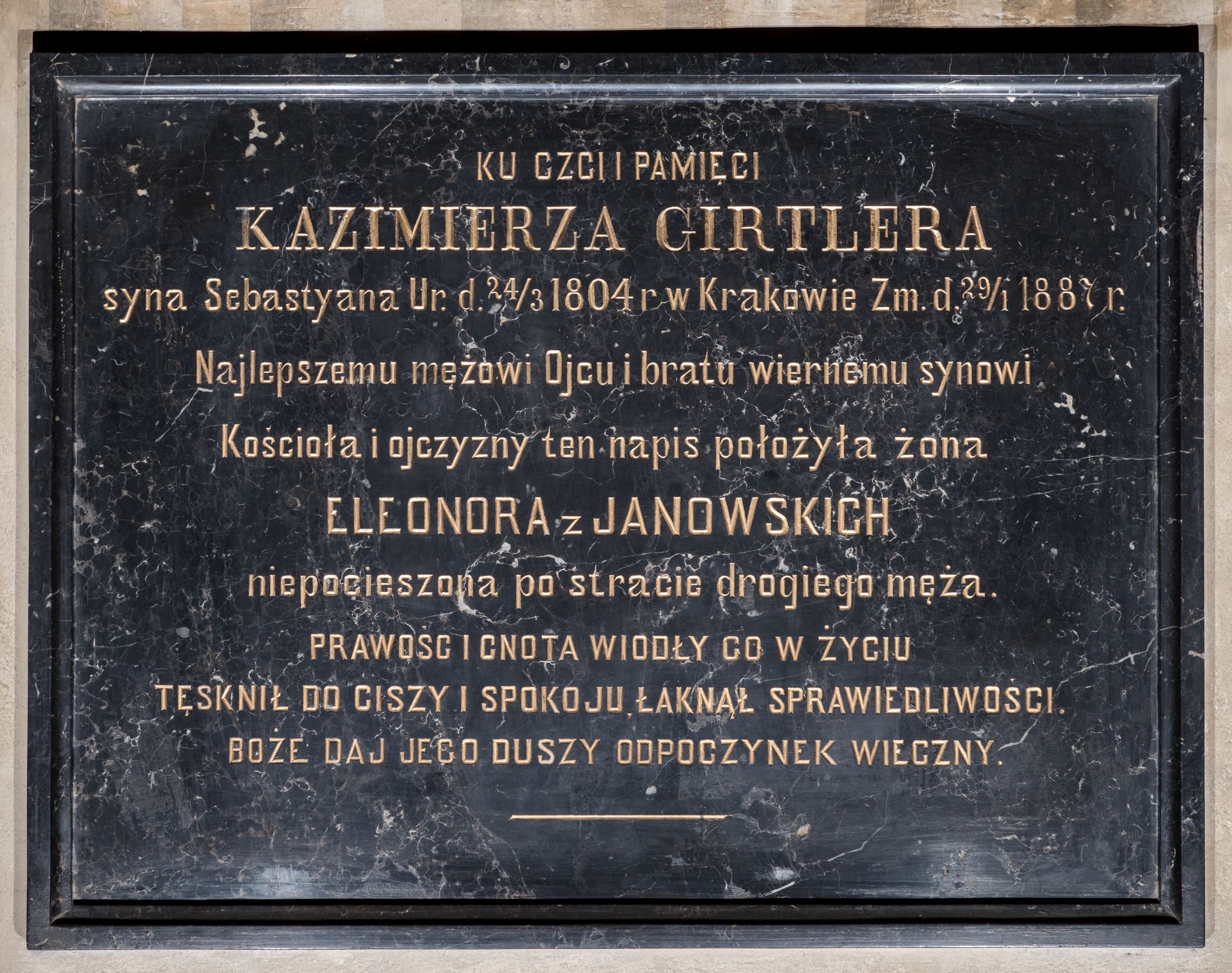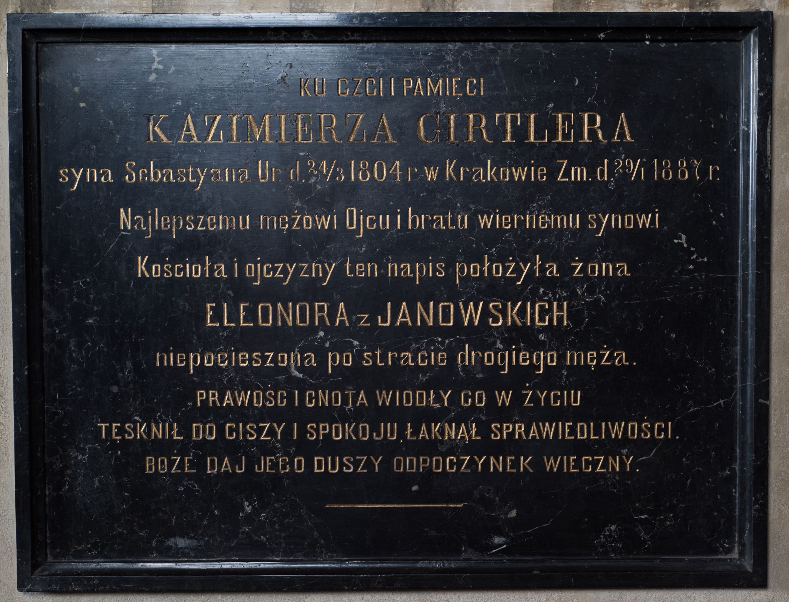 The epitaph plaque of Kazimierz Girtler (1804-1887) commemorates the writer and memorialist, author of short stories, tenant of the village of Kalina Mała near Miechów, son of the rector at the Jagiellonian University, Sebastian Girtler. A simple plaque has no stylish features.