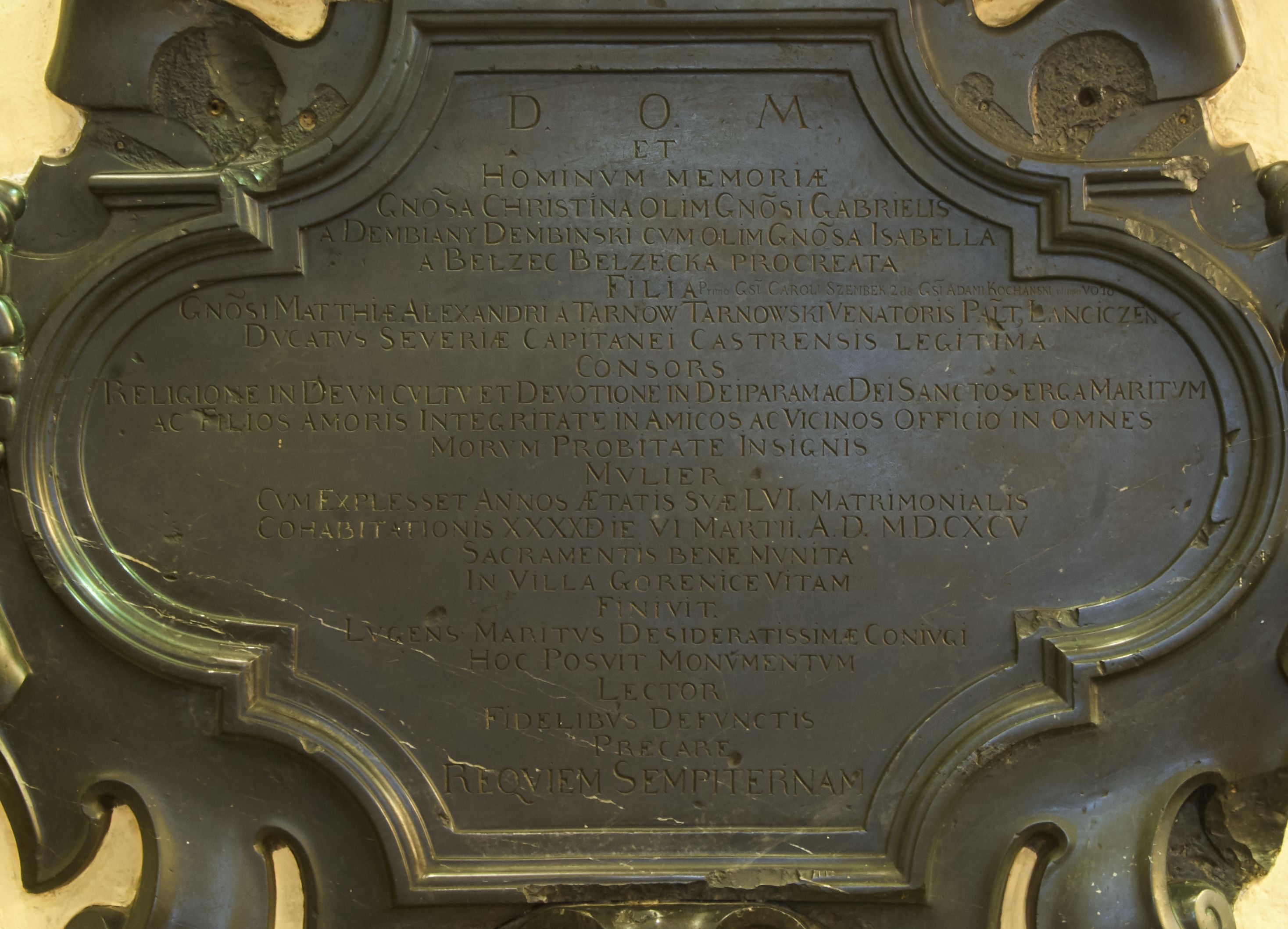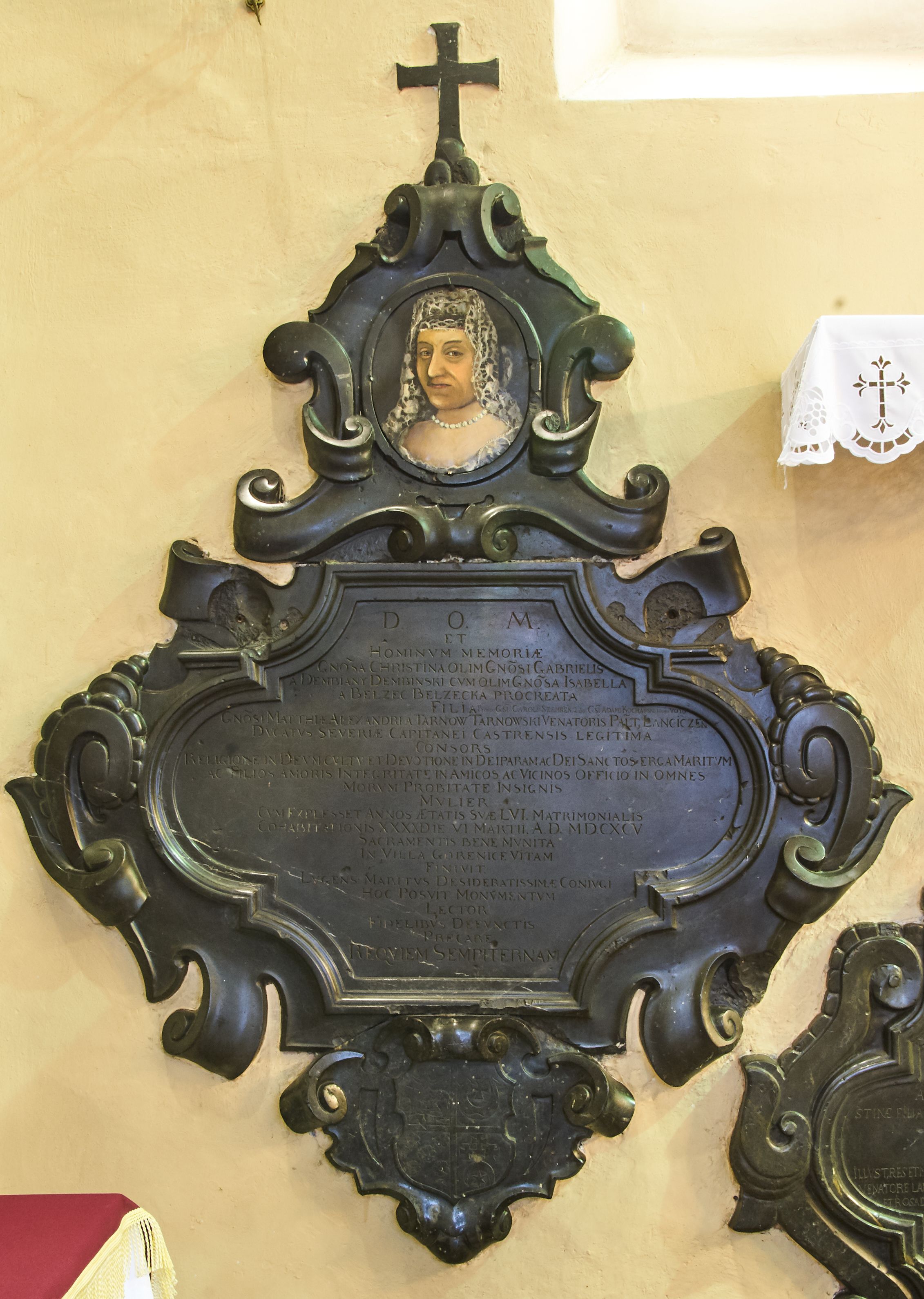 The epitaph plaque of Krystyna (née Dembińska) Tarnowska was created in the workshop of Michał Poman in Dębnik nearby Krzeszowice in 1696.