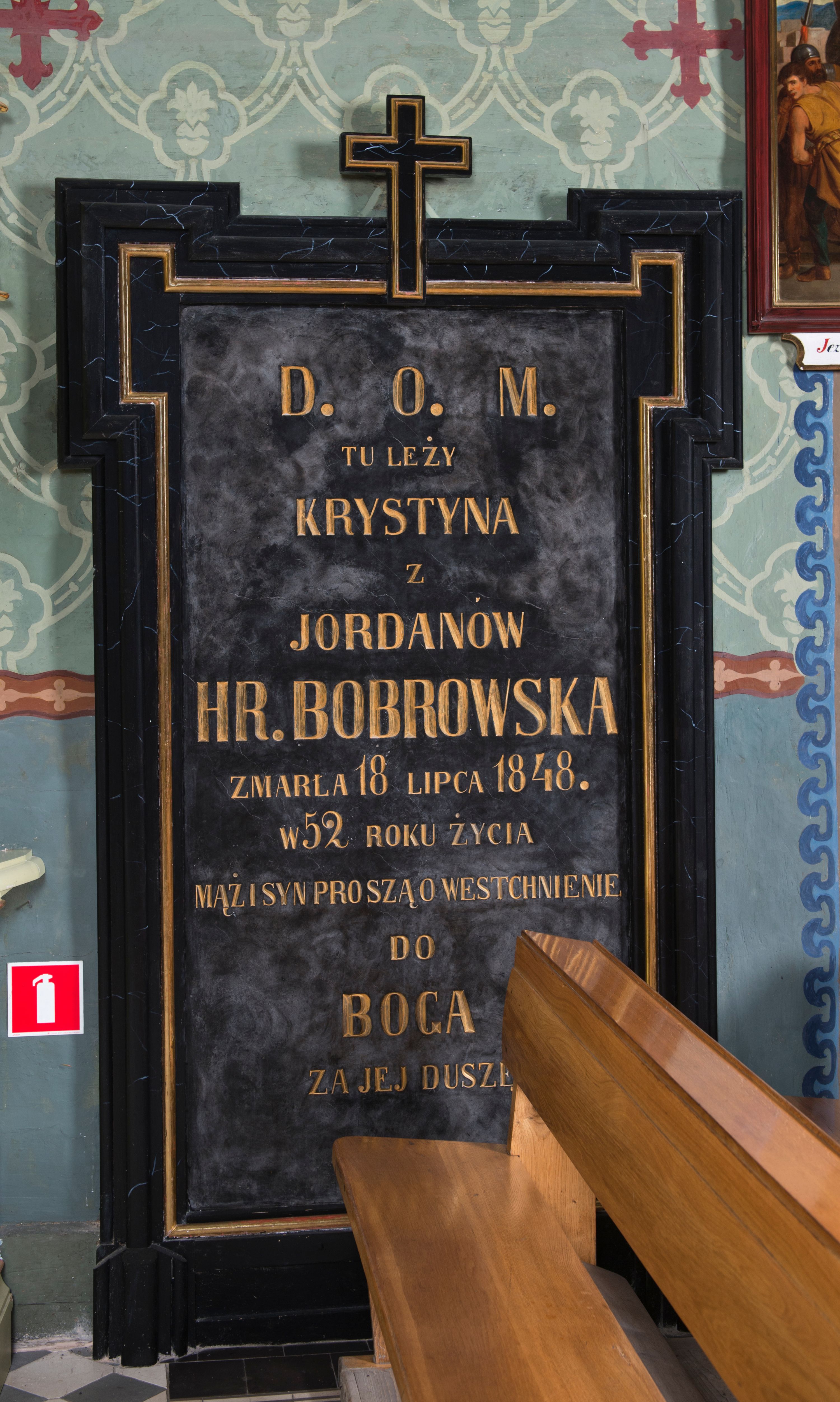 One of the 19th-century epitaph plaques in the church commemorates Krystyna Bobrowska, the wife of one of the owners of Poręba Wielka at that time.