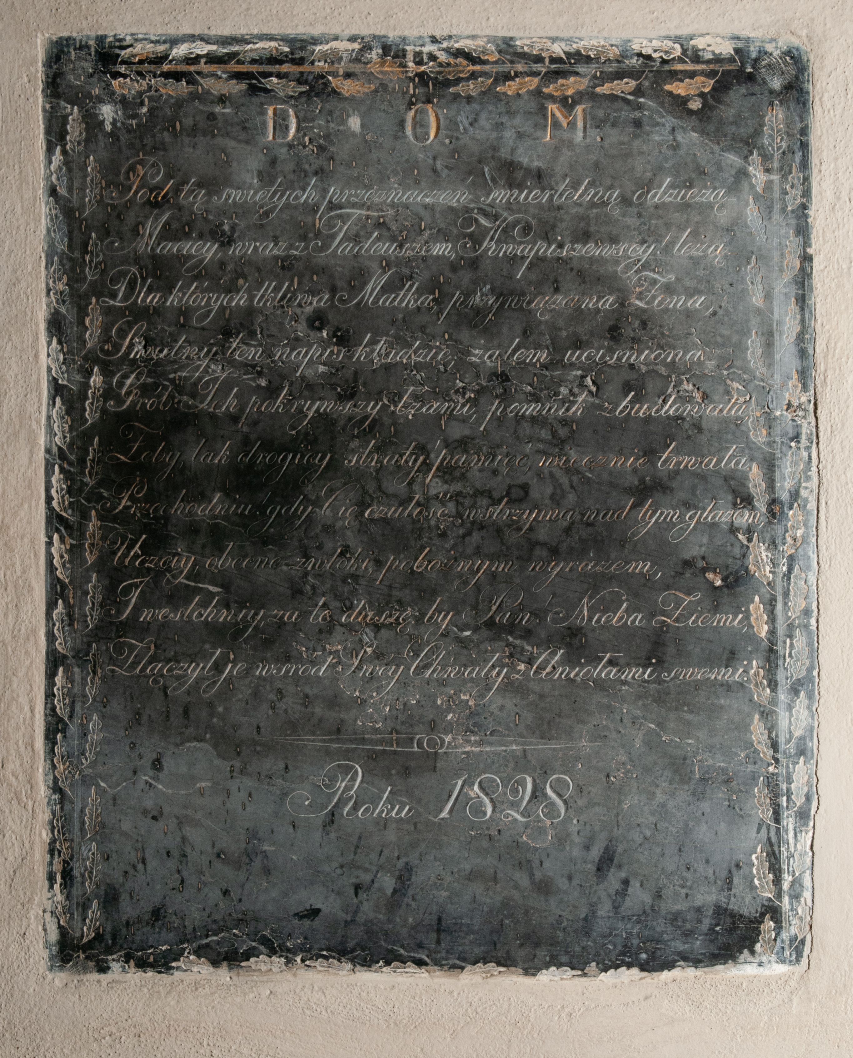 A simple epitaph plaque dedicated to Maciej and Tadeusz Kwapiszewski was funded by the mother and wife of the deceased and was made of so-called black Dębnik marble.