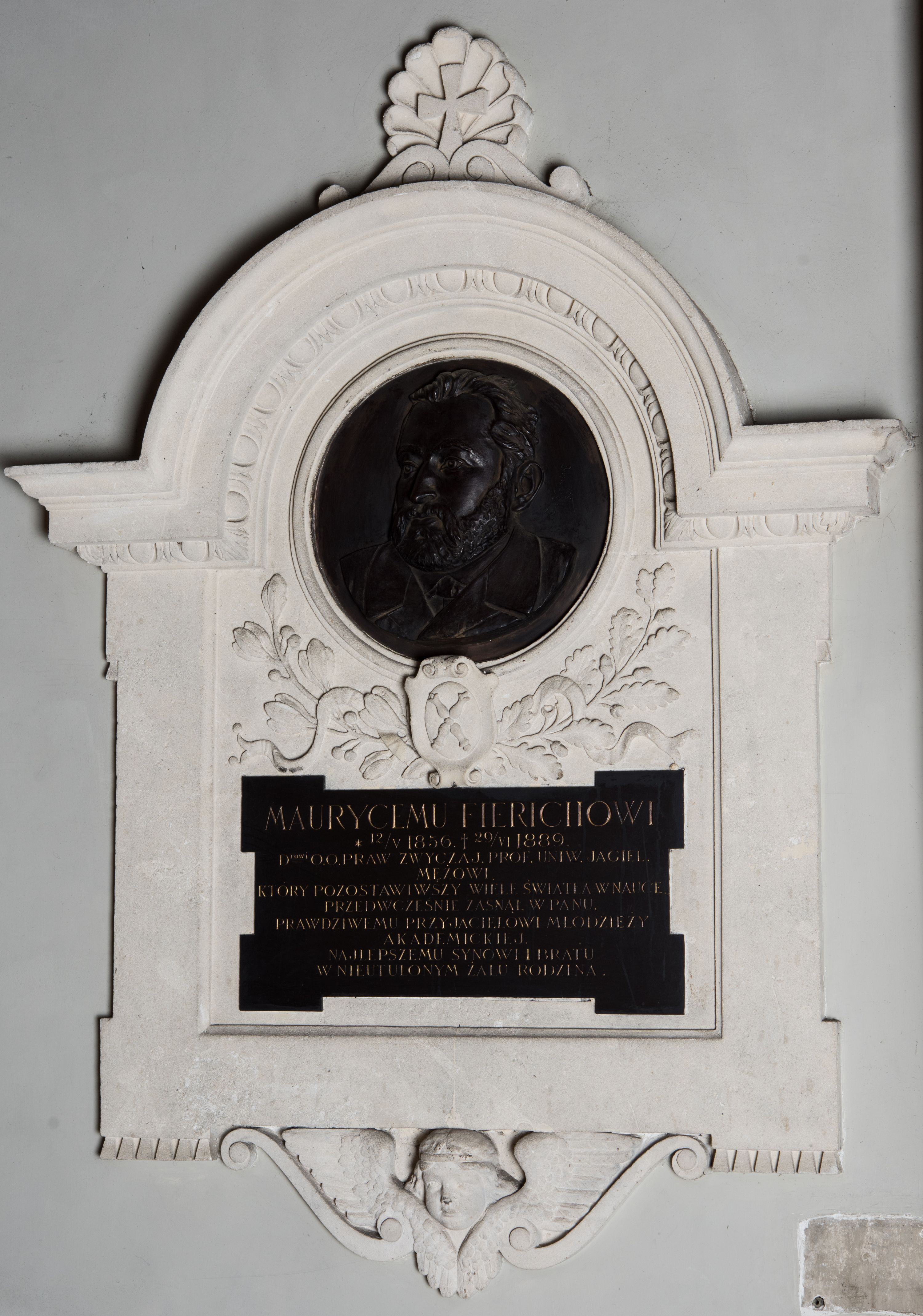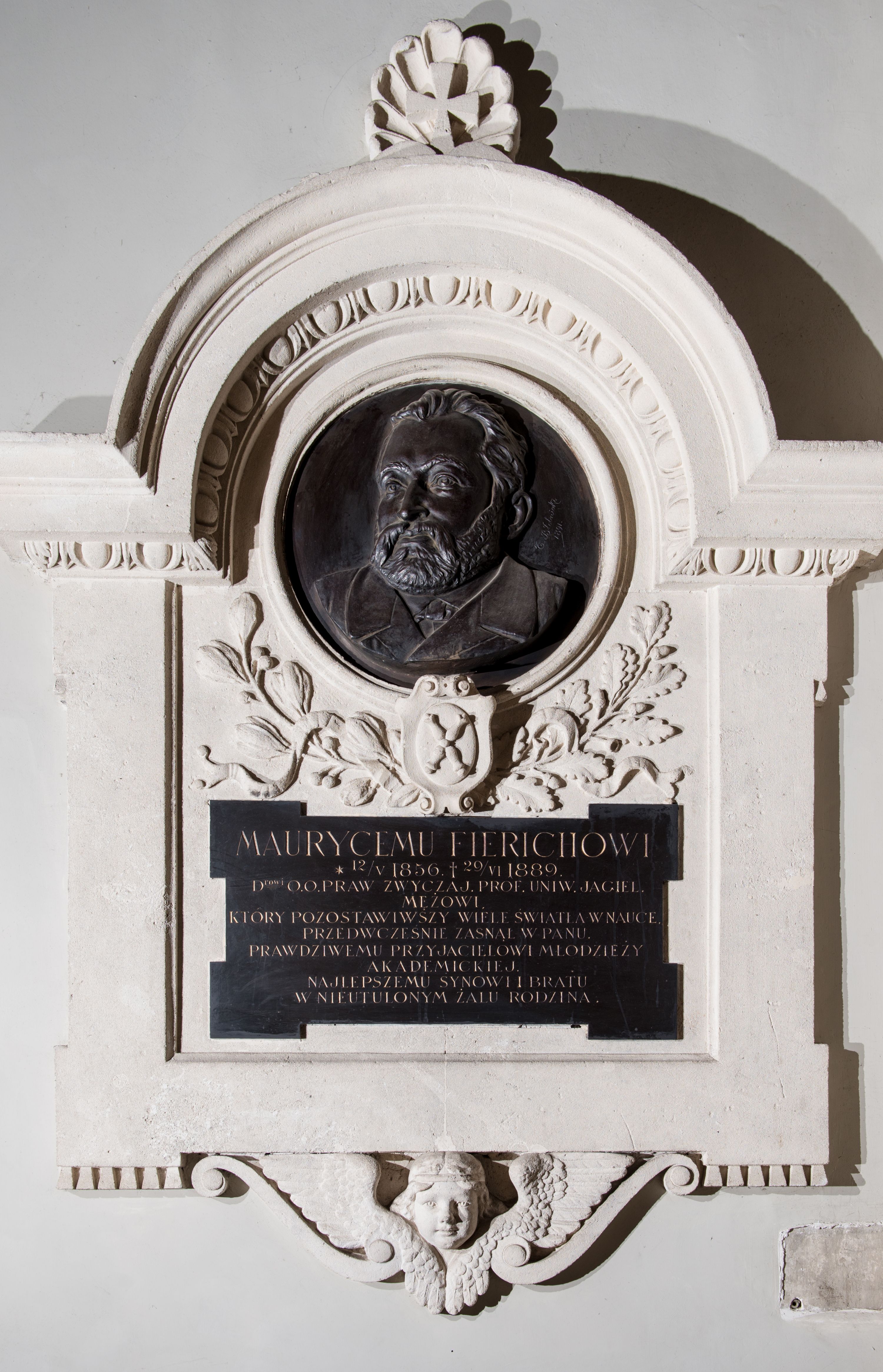 The epitaph plaque of Maurycy Fierich, who died at the age of 33, a Professor of Law at the Jagiellonian University, was funded by family members in 1891. The author of the portrait bust was the sculptor Tadeusz Błotnicki.