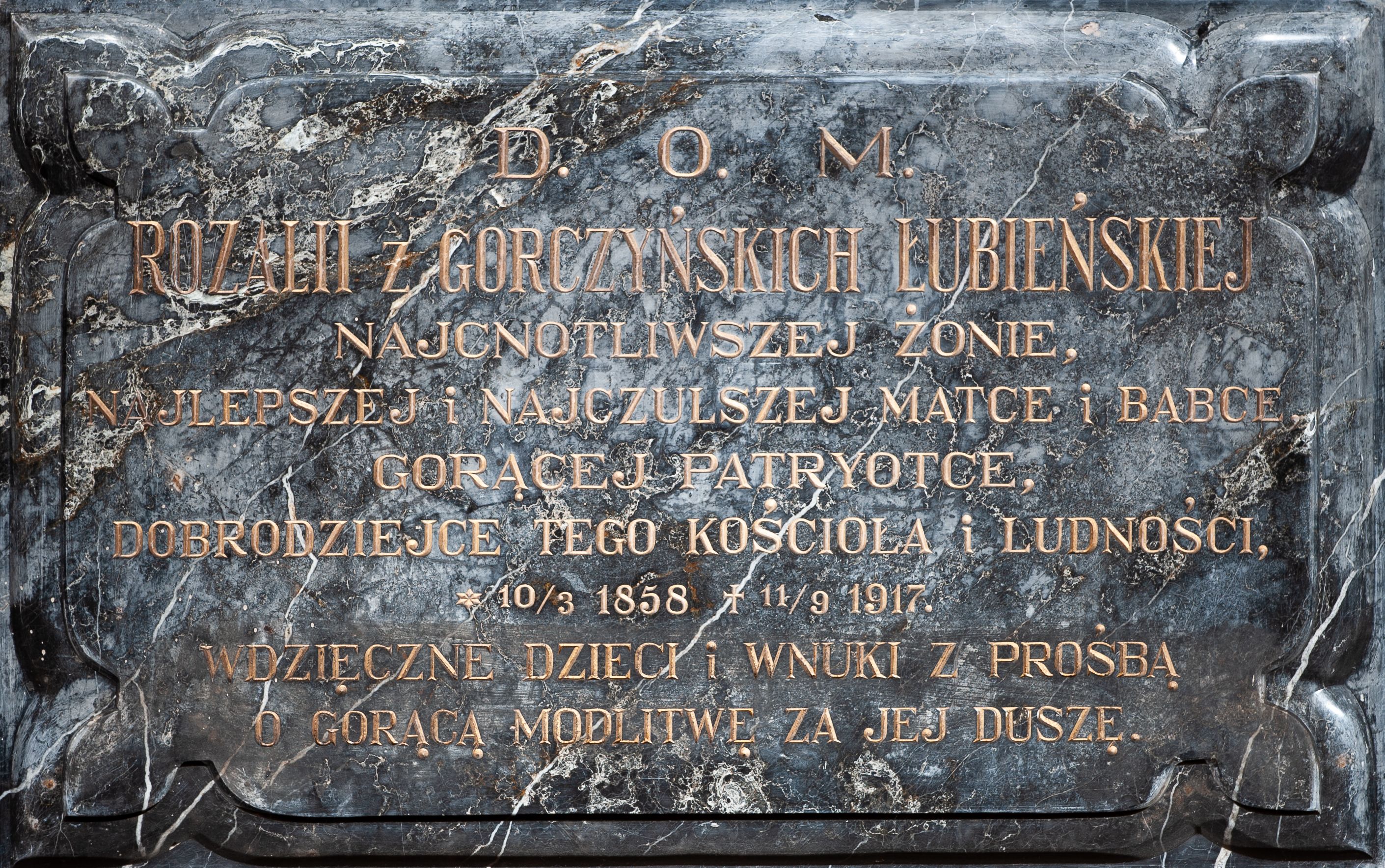 The epitaph plaque of Rozalia (née Gorczyńska) Łubieńska (10 March 1858 - 11 September 1917) was created around 1917 by her children. Rozalia was a heiress of Stryszów, the wife of Franciszek Łubieński from Łubna of the Pomian coat of arms and the mother of 5 children. The neo-gothic epitaph plaque, created at the beginning of 20th century, imitates typical masonry work in the 19th century.