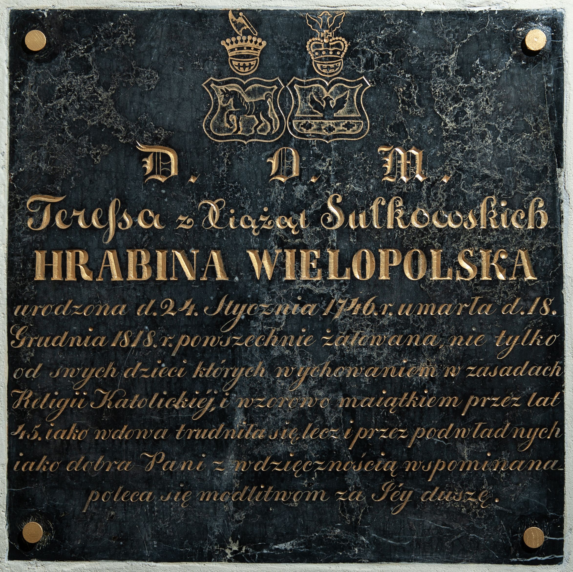 A plaque, made in 1818 or later, commemorates Countess Teresa (née Sułkowska) Wielopolska, who funded the high altar in the old church and wrote poems.