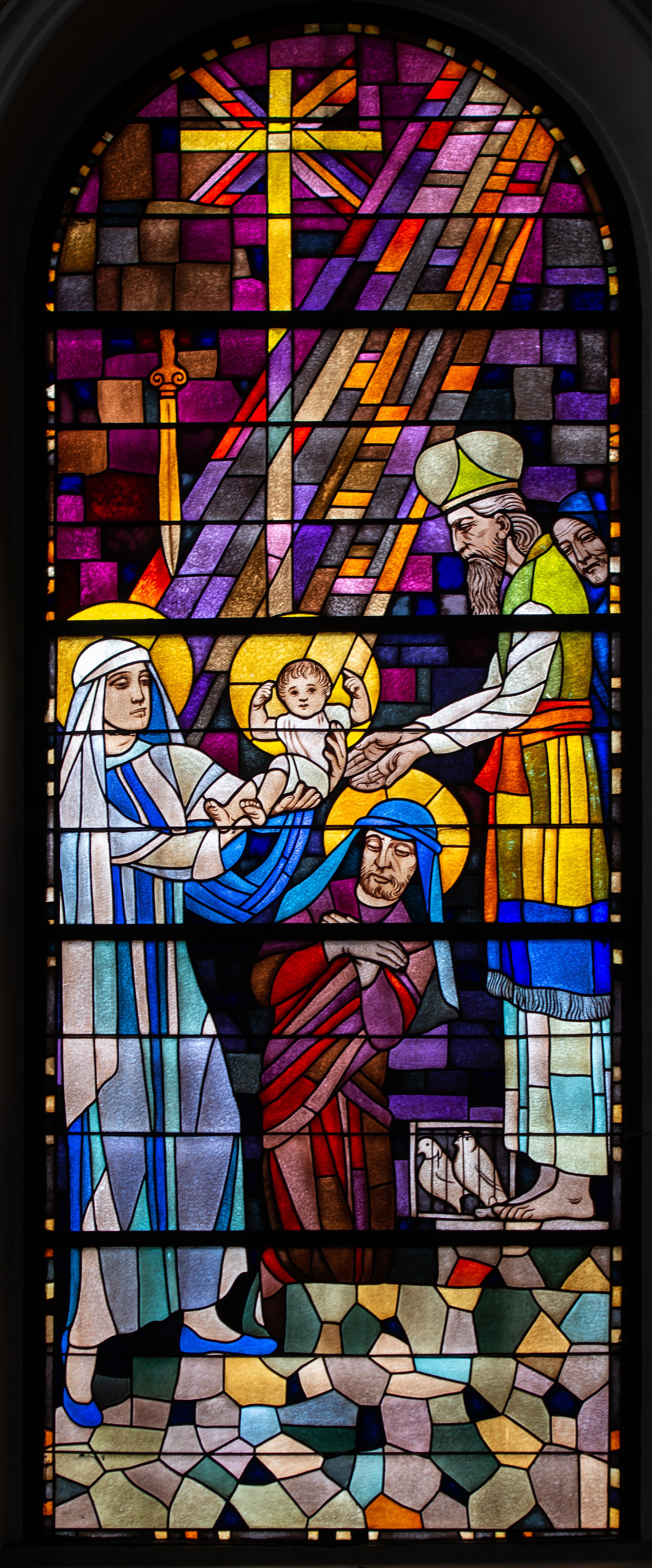 The set of stained glass windows in the church in Stróża, including the above-mentioned stained glass window depicting Assumption of the Blessed Virgin Mary, was designed in 1959-1960 by Cracovian painter and educator – Adam Bunsch. This artist is the author of numerous stained glass windows and wall polychromes in churches throughout Poland, as well as in England and Scotland. It is estimated that the stained glass windows of the Bunsch project were installed in nearly 40 churches. The set of 11 stained glass windows in the church in Stróża is one of Bunsch's major realizations. Stained-glass windows were made by the Cracovisan stained-glass workshop – "Bracia Paczka"