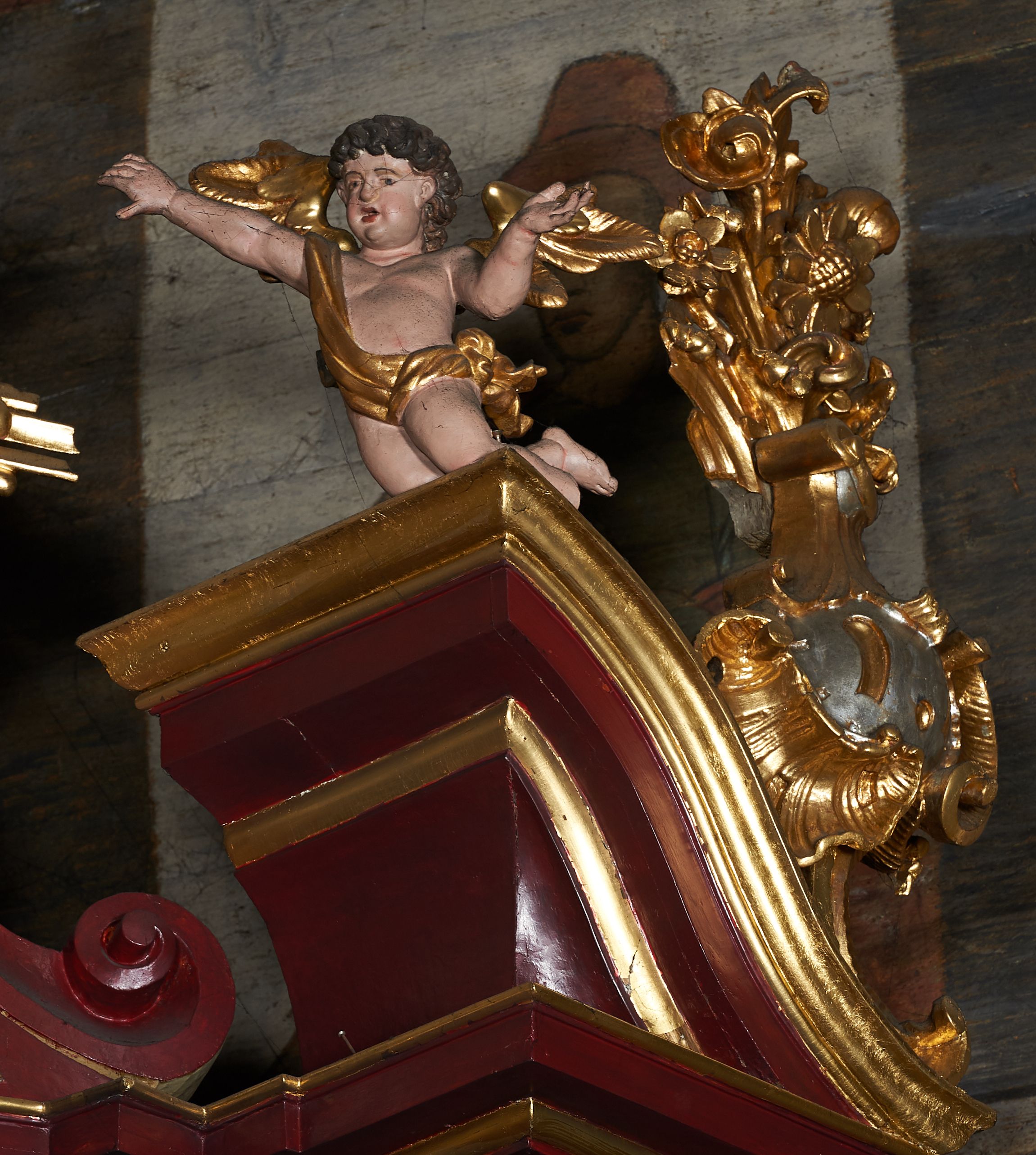 The angels in the altar finial of the high altar in Racławice are a perfect example of 18th -century baroque sculpture of theatrical gestures. The author of these sculptures is unfortunately unknown. The altar along with sculptures were made upon request of priest Jakub Kossecki (Racławice parson from 1750-1764) as a vote of grace for the Virgin Mary for recovery from serious disease that Kostecki suffered from in 1752.
