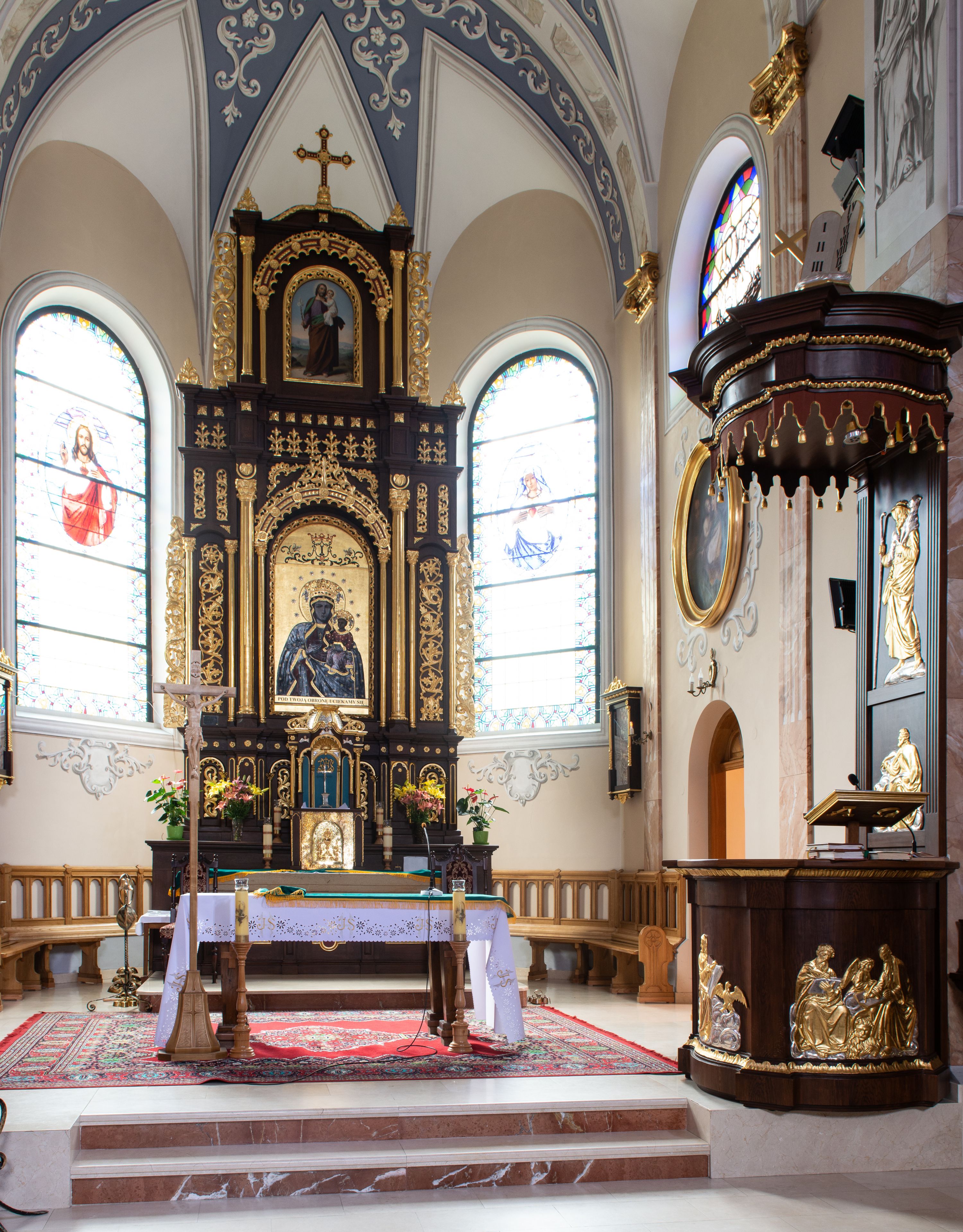 The altar in question is contemporary to the church where it is located and it was created in the first decade of the 20th century (most probably before 1908). Unfortunately, both the author of the project and the builder of the altar are unknown. The main reredos represents an eclectic style, while side altars – Neo-Baroque one.