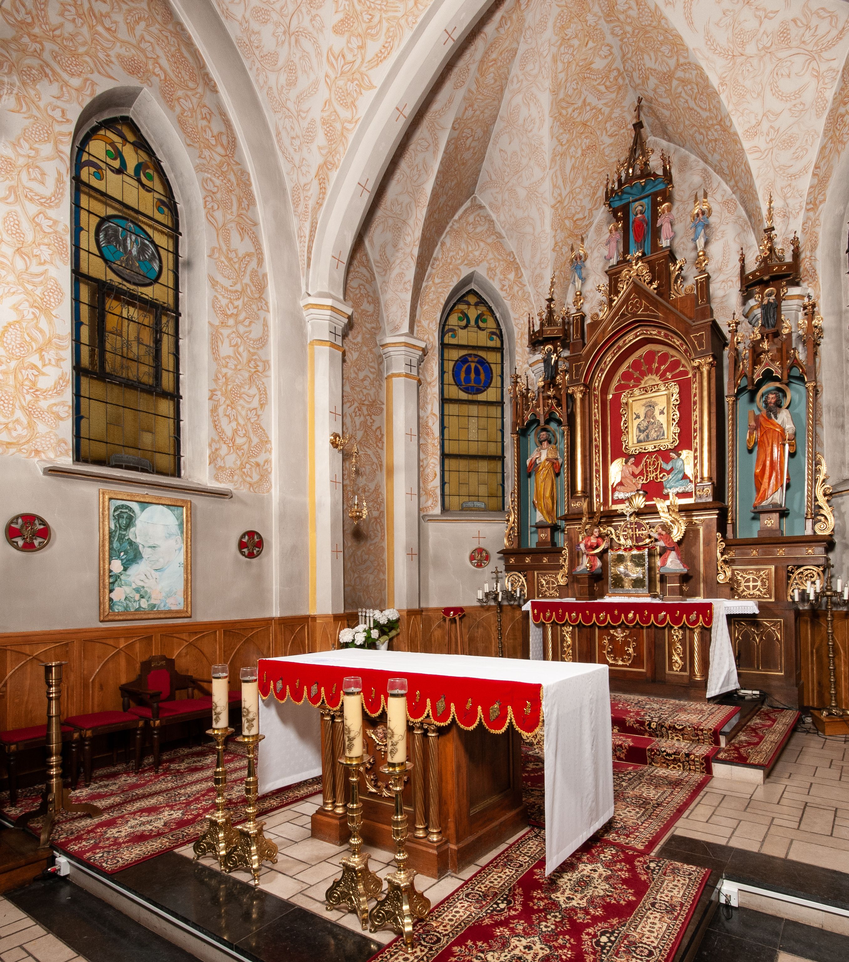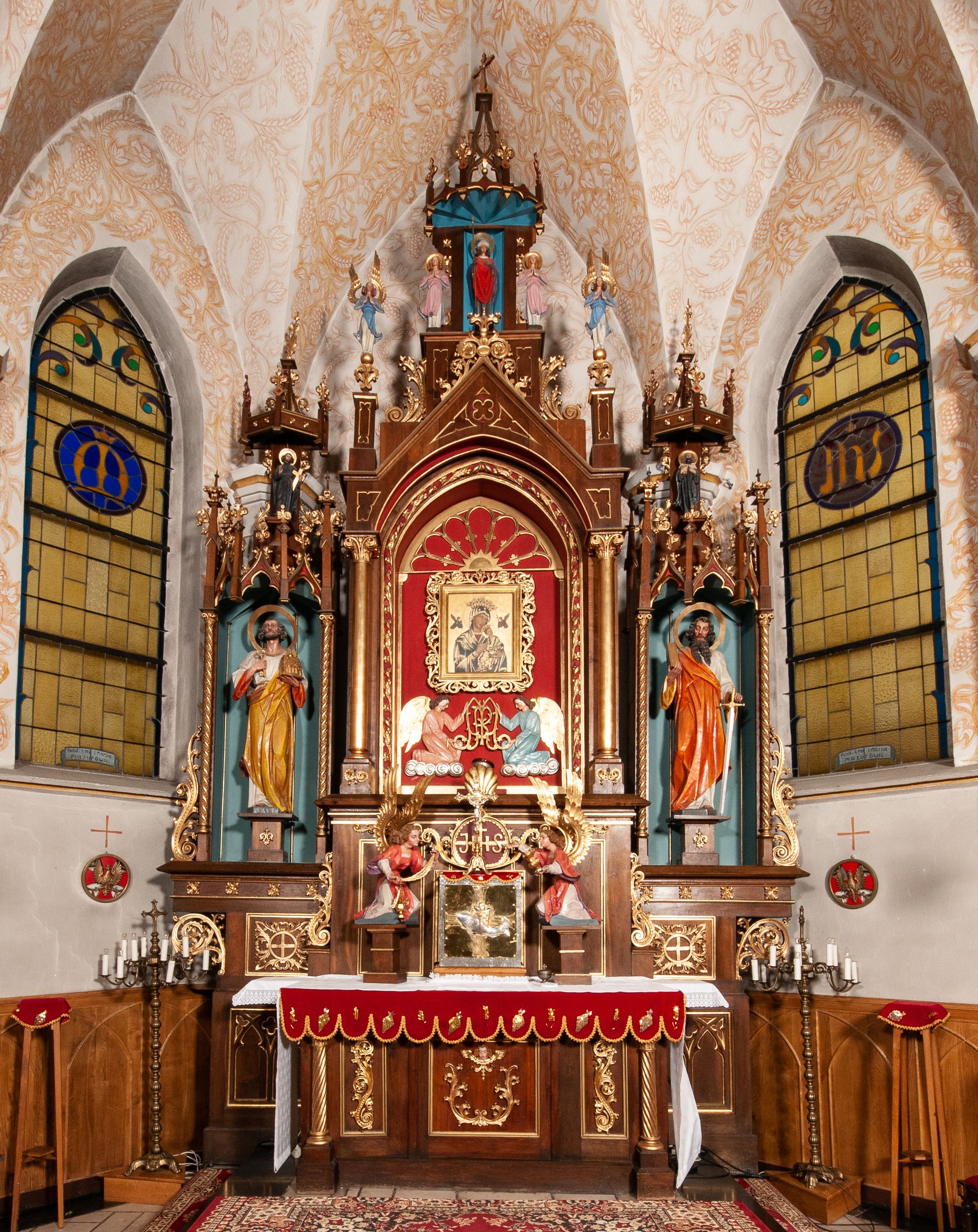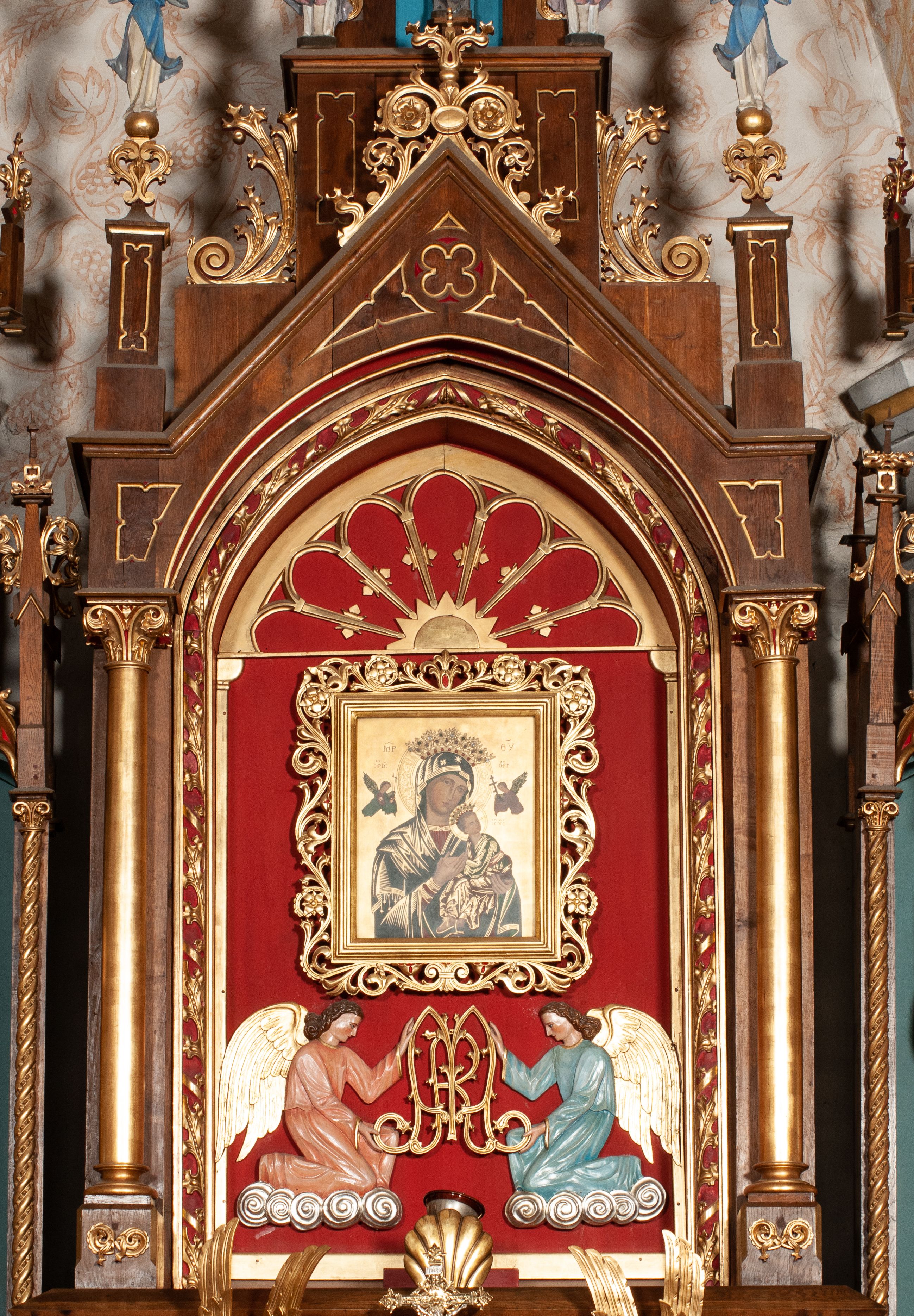 The high altar in the church of Our Lady of Perpetual Help was made in 1948 in the sculpture workshop of Wojciech Maciejowski in Cracow. The altar was created in the Neo-Gothic style, reflecting medieval - gothic models and replicating old forms and ornament, composing them in a new whole. The triaxial altar combines elements which are typical for Gothic architecture, such as openwork turrets crowned with pinnacles, fleuron ornaments and crockets, pointed arches, gables or traceries. The artist died probably in the late forties of the 20th century so the high altar in Wola Batorska is one of the last works of his.
