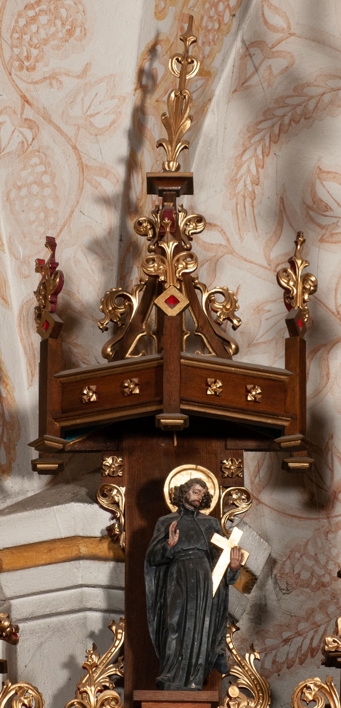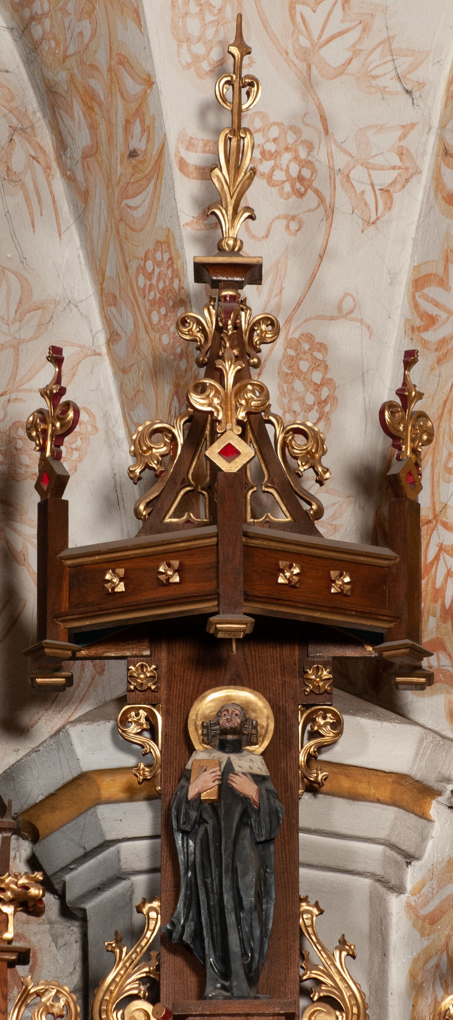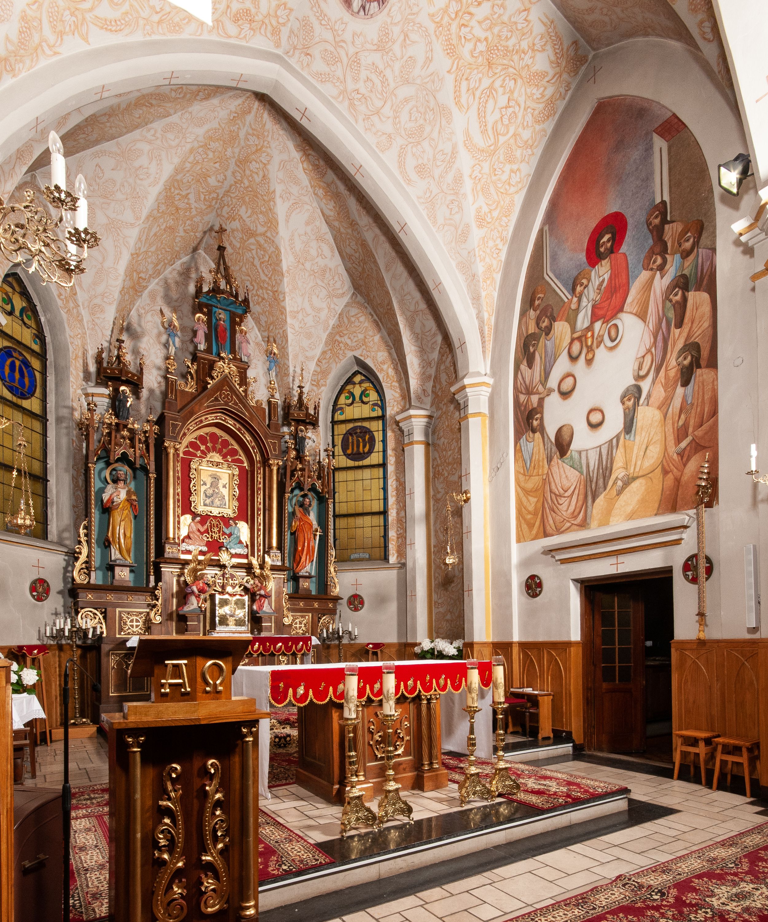 The high altar in the church of Our Lady of Perpetual Help was made in 1948 in the sculpture workshop of Wojciech Maciejowski in Cracow. The altar was created in the Neo-Gothic style, reflecting medieval - gothic models and replicating old forms and ornament, composing them in a new whole. The triaxial altar combines elements which are typical for Gothic architecture, such as openwork turrets crowned with pinnacles, fleuron ornaments and crockets, pointed arches, gables or traceries. The artist died probably in the late forties of the 20th century so the high altar in Wola Batorska is one of the last works of his.