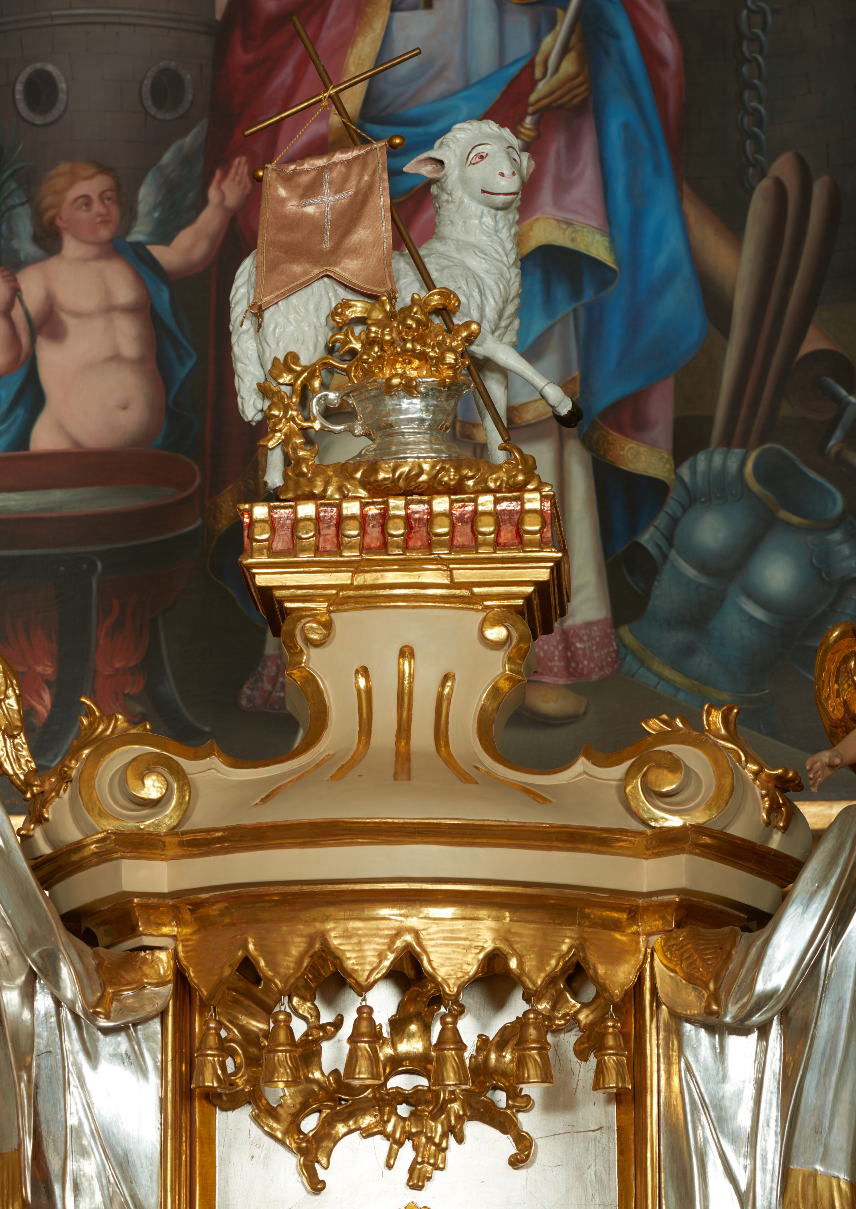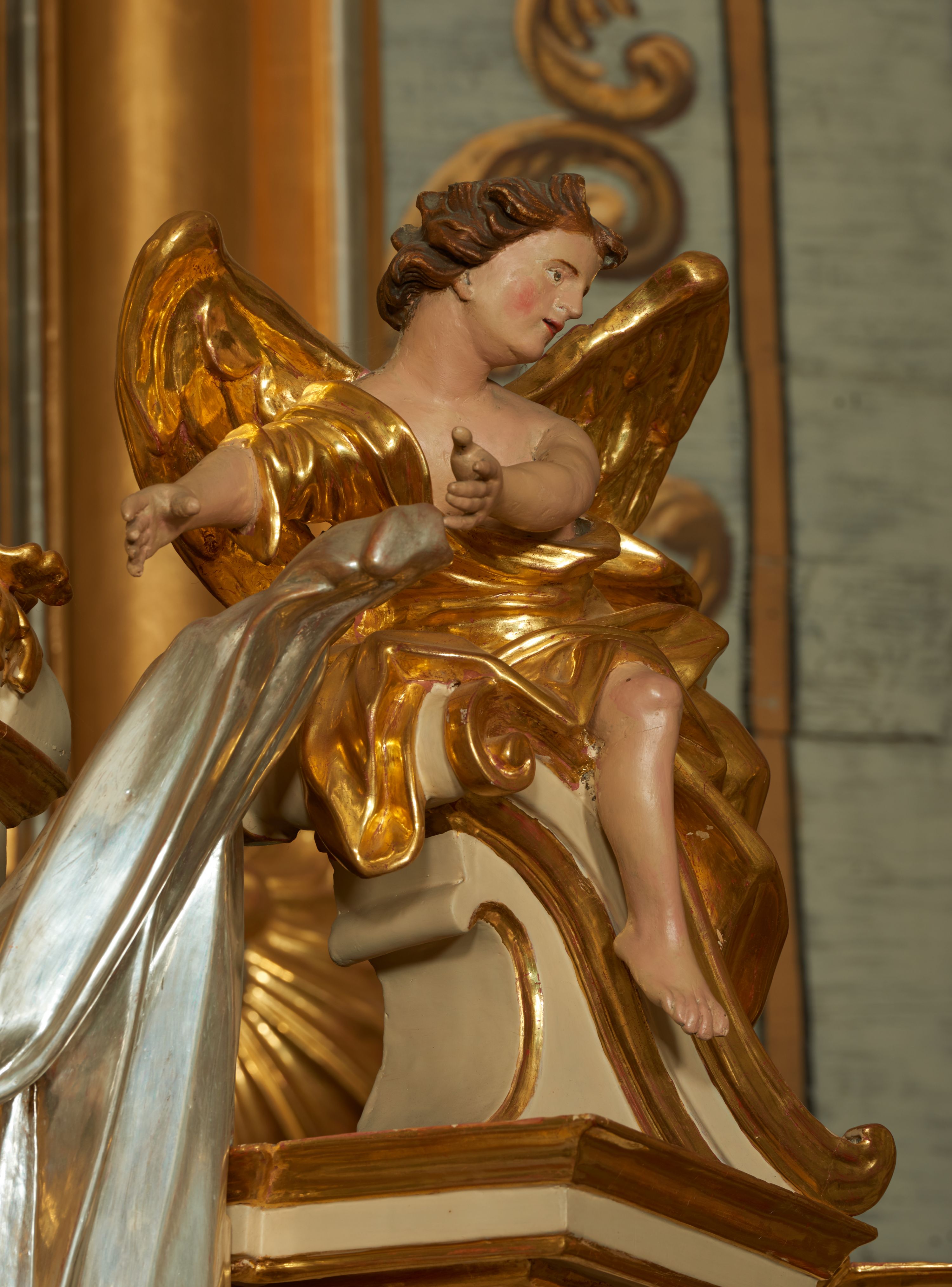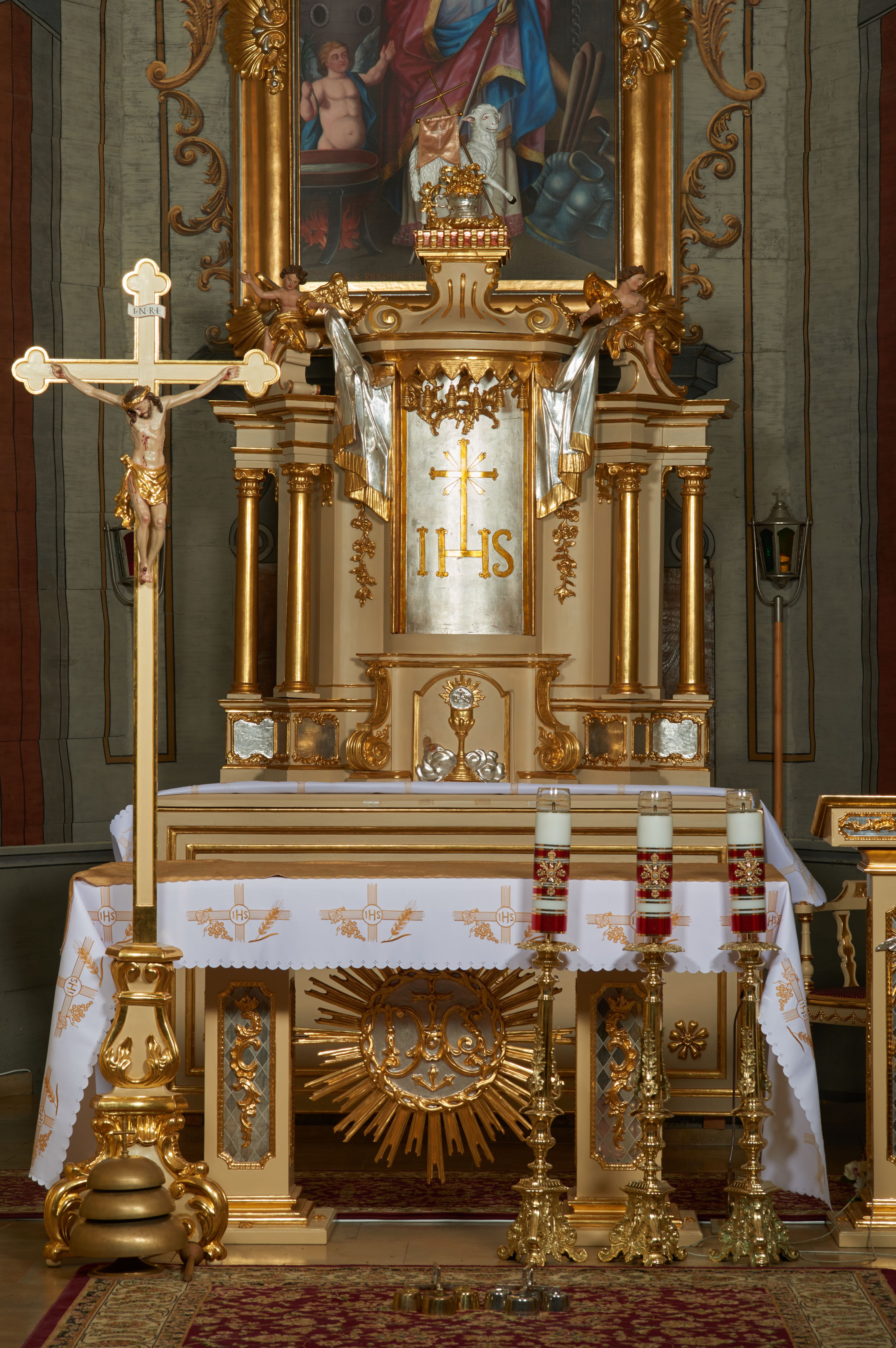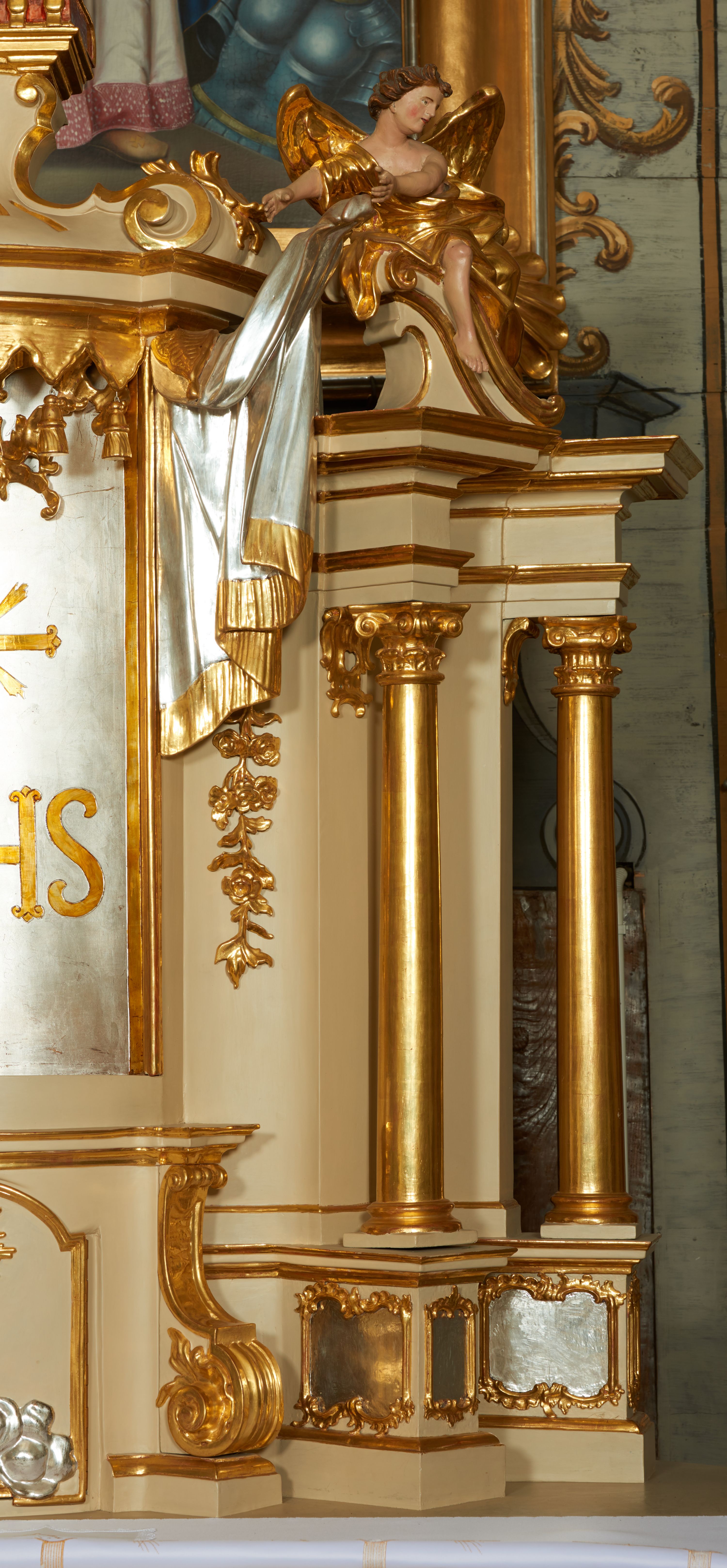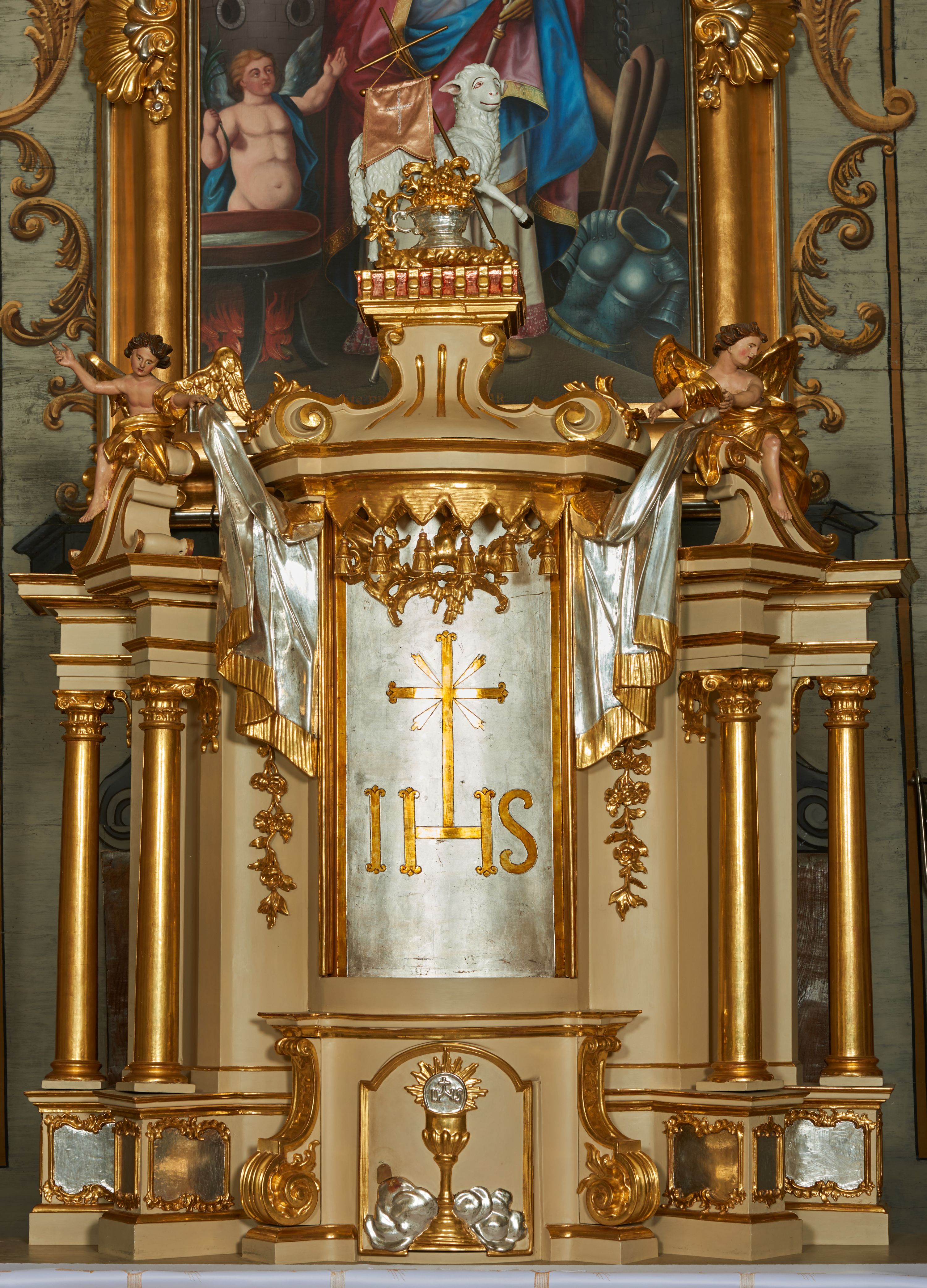 The altar originates from the second half of the 18th century and is only a fragment of a larger reredos. Its original central zone is now a painting depicting St. Erasmus (the bishop and martyr) in a decorative frame, which is hung on the chancel's wall.