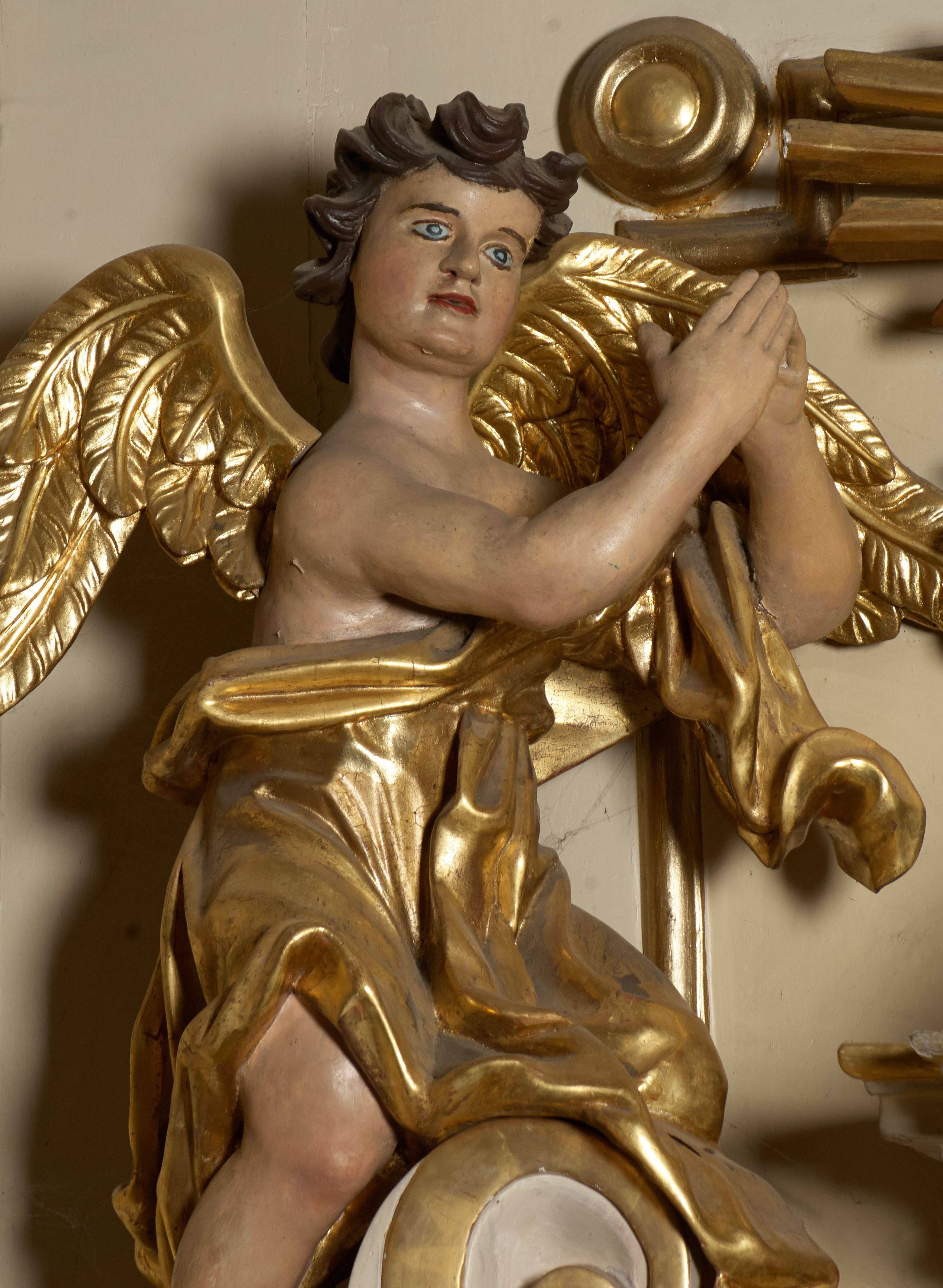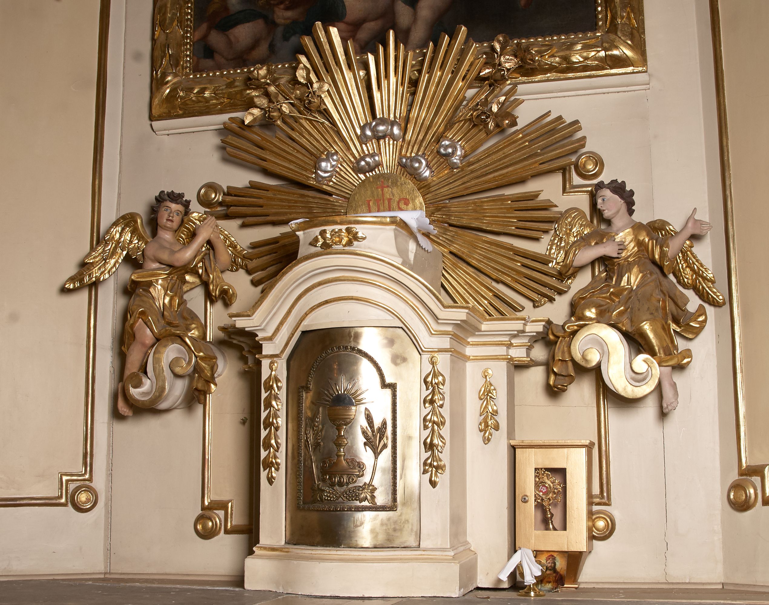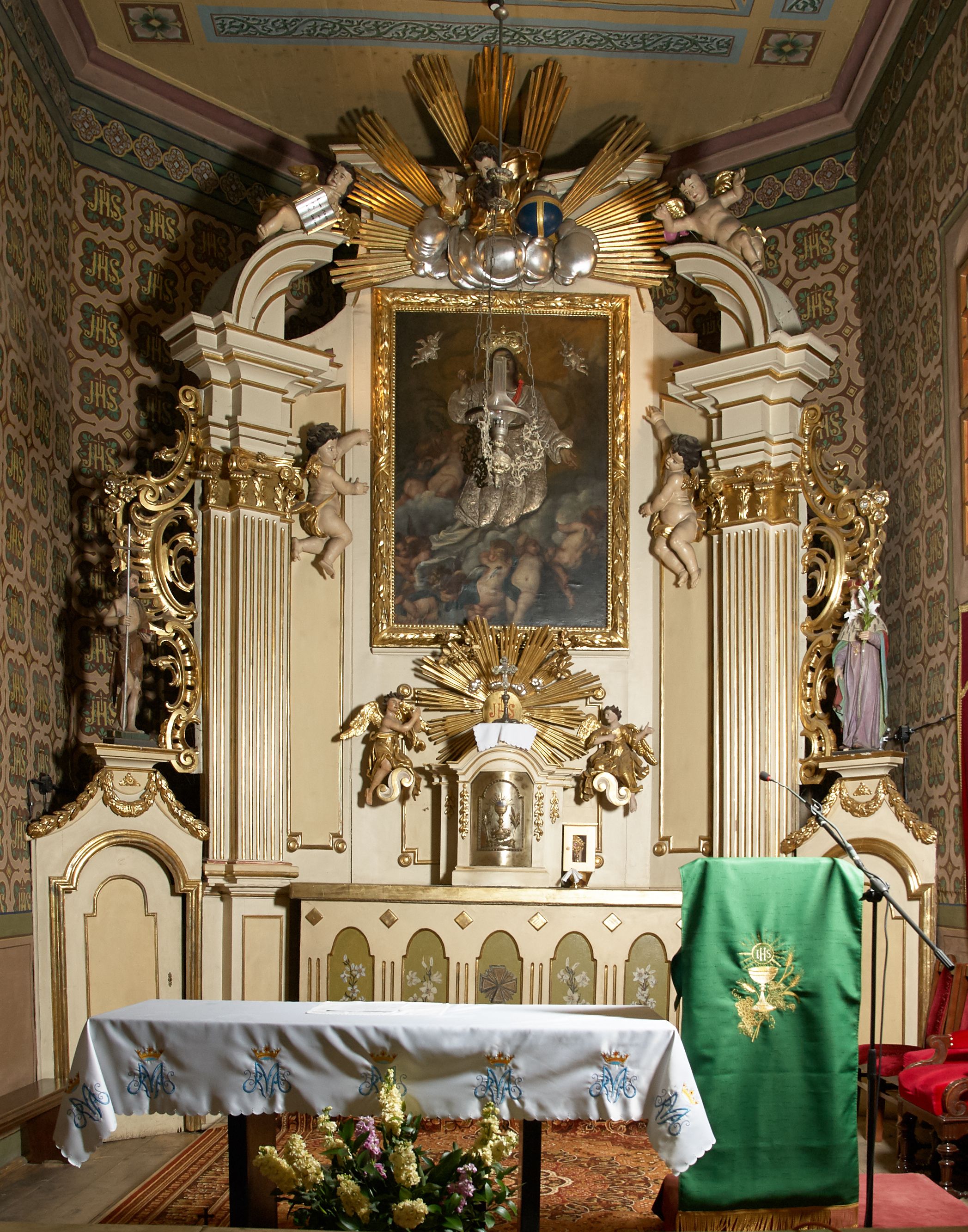 The high altar and side altars were funded by father Walenty Bańkowski, while he was the parish priest of the parish in Biórków Wielki in the years 1777-1801. In the main area of the altar, the painting "Assumption of the Blessed Virgin Mary" (mentioned in episcopal visitation records from 1747 and 1783) was re-mounted Originally, classicistic vases were placed over the altar gates. The altar, as a whole, is an example of the late implementation of the Late Baroque trend in Cracovian wood carving of the late 18th century.