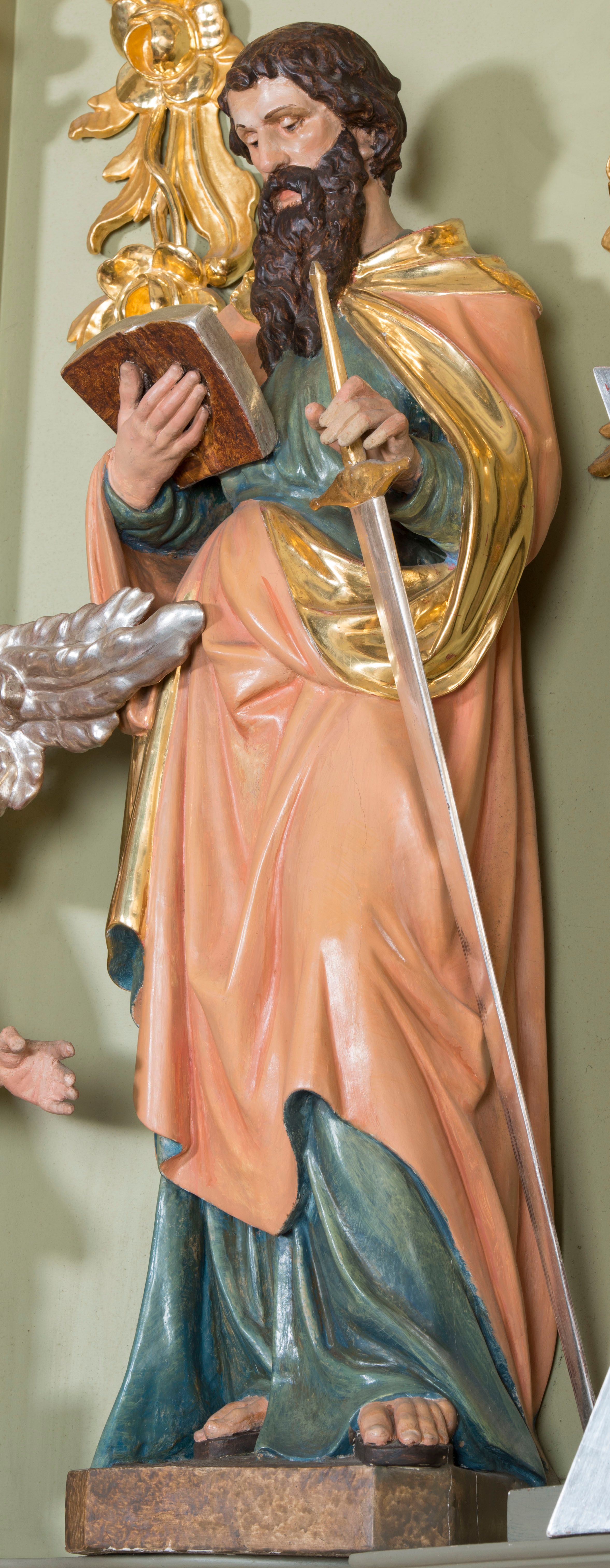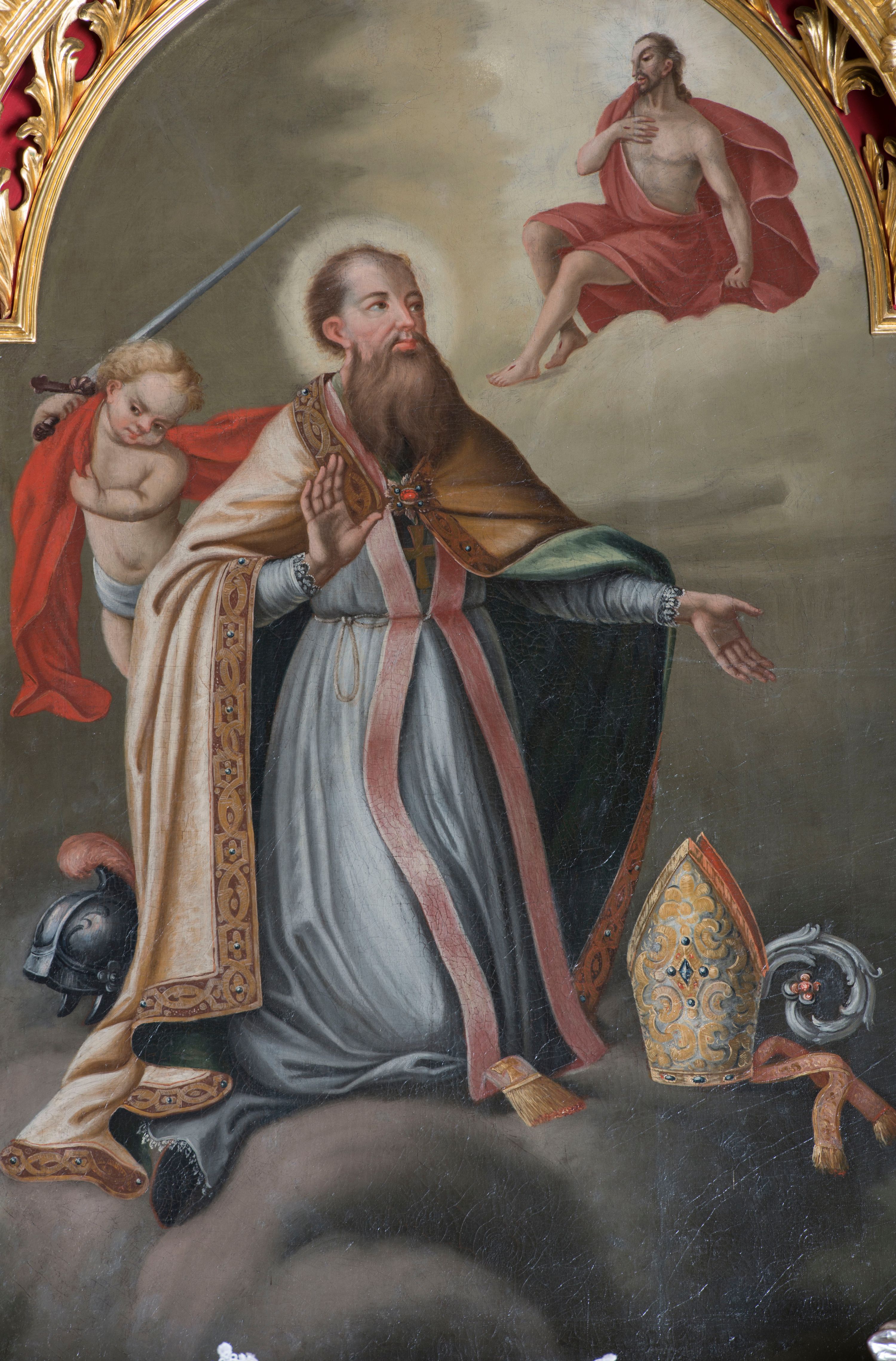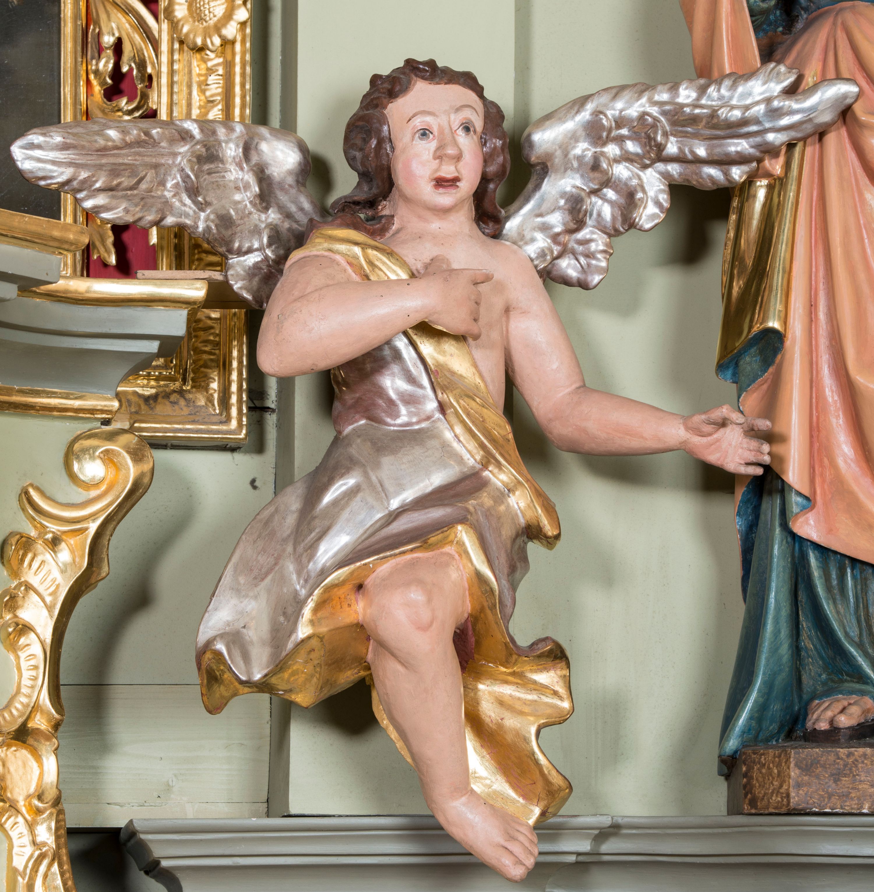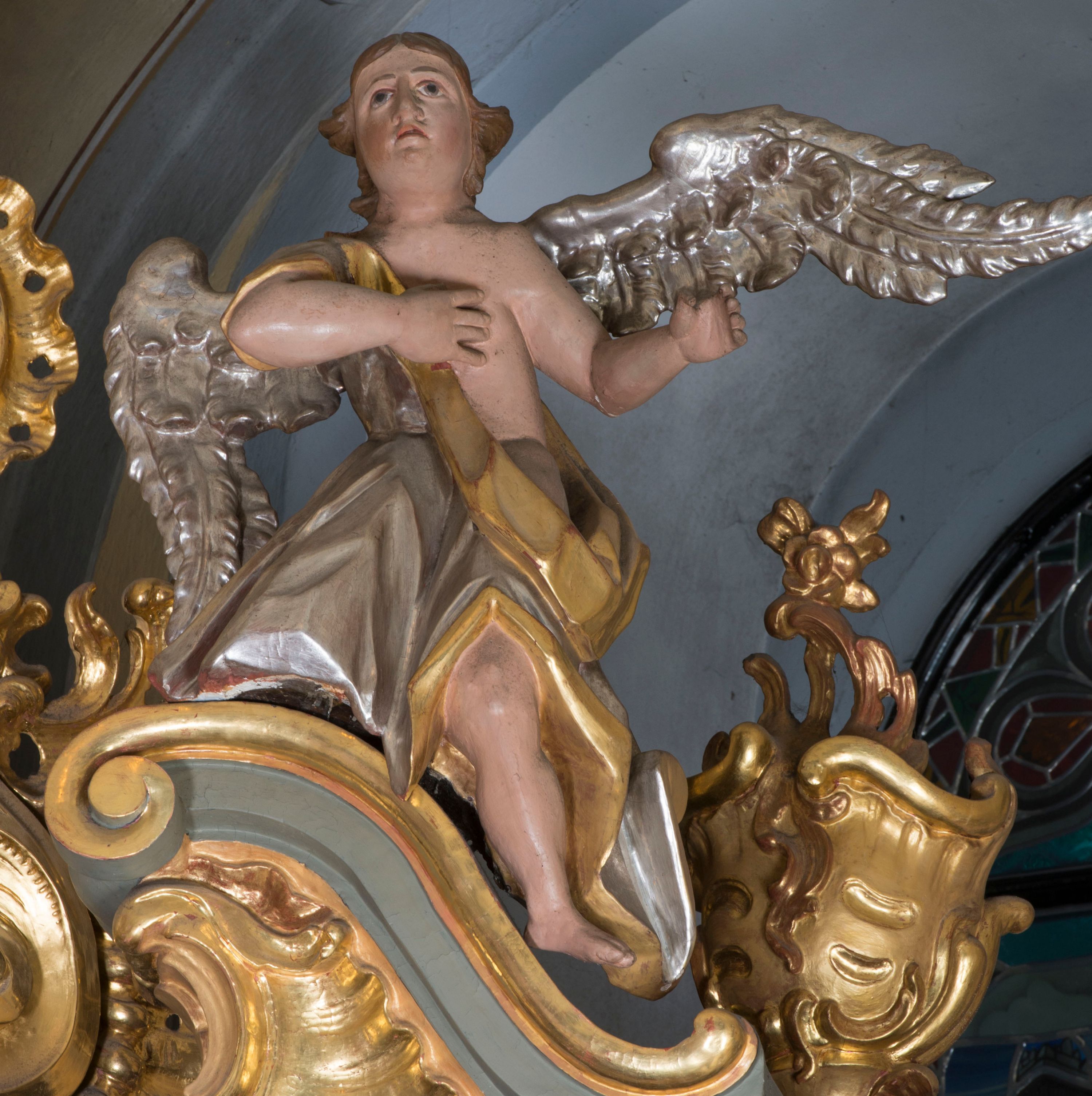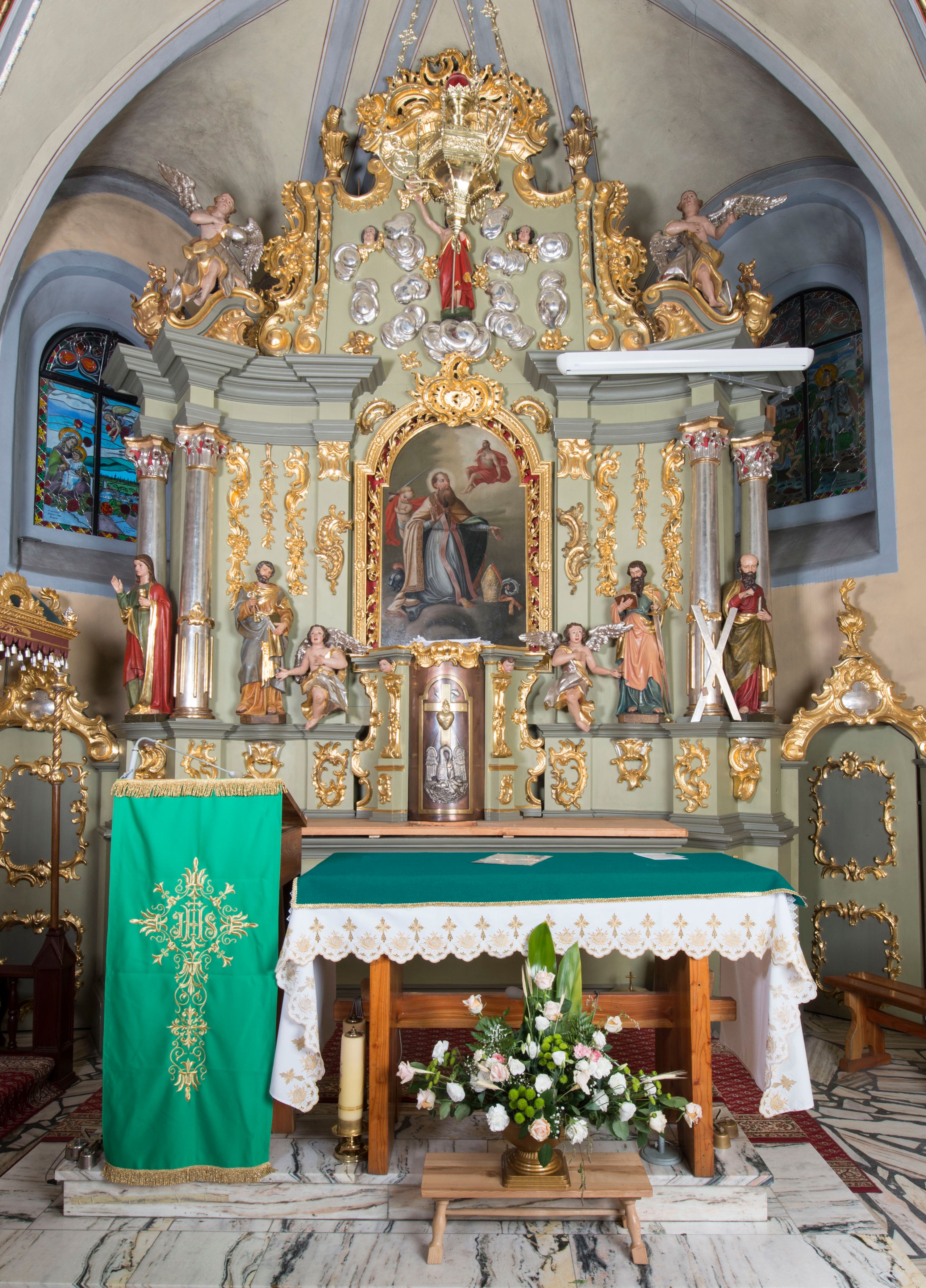 The altar of St. Martin is the third high altar at the church in Krempechy. The previous ones were dedicated to St. Servatius, the former patron of the temple. The altar was made in Rococo style in the second half of the 18th century. Decorative elements of the reredos: flame vases, rooster combs and rocaille ornaments are characteristic for the art of this period, while a typical feature of Spiš art is the domination of sculpture and ornamental decoration over painting. The ideological programme of this reredos is closely connected with the church's invocation. There is a painting of St. Martin, the patron of the temple, at the high altar. Statues of apostles - St. Peter, St. Paul, St. John and St. Andrew (perhaps the previous ones represented the same saints) - are re-mounted on the sides. The altar final includes the re-placed statue of Risen Christ depicting the Saviour triumphant who rose from the grave. Particular attention should be paid to the unusual statues of angels, whose gestures and facial expressions are highly expressive and theatrical. The sculptures at the altar do not form a homogeneous ensemble. Most of them are from the 20s of the 20th century. Only the statues of angels and the altar structure were made in the second half of the 18th century.