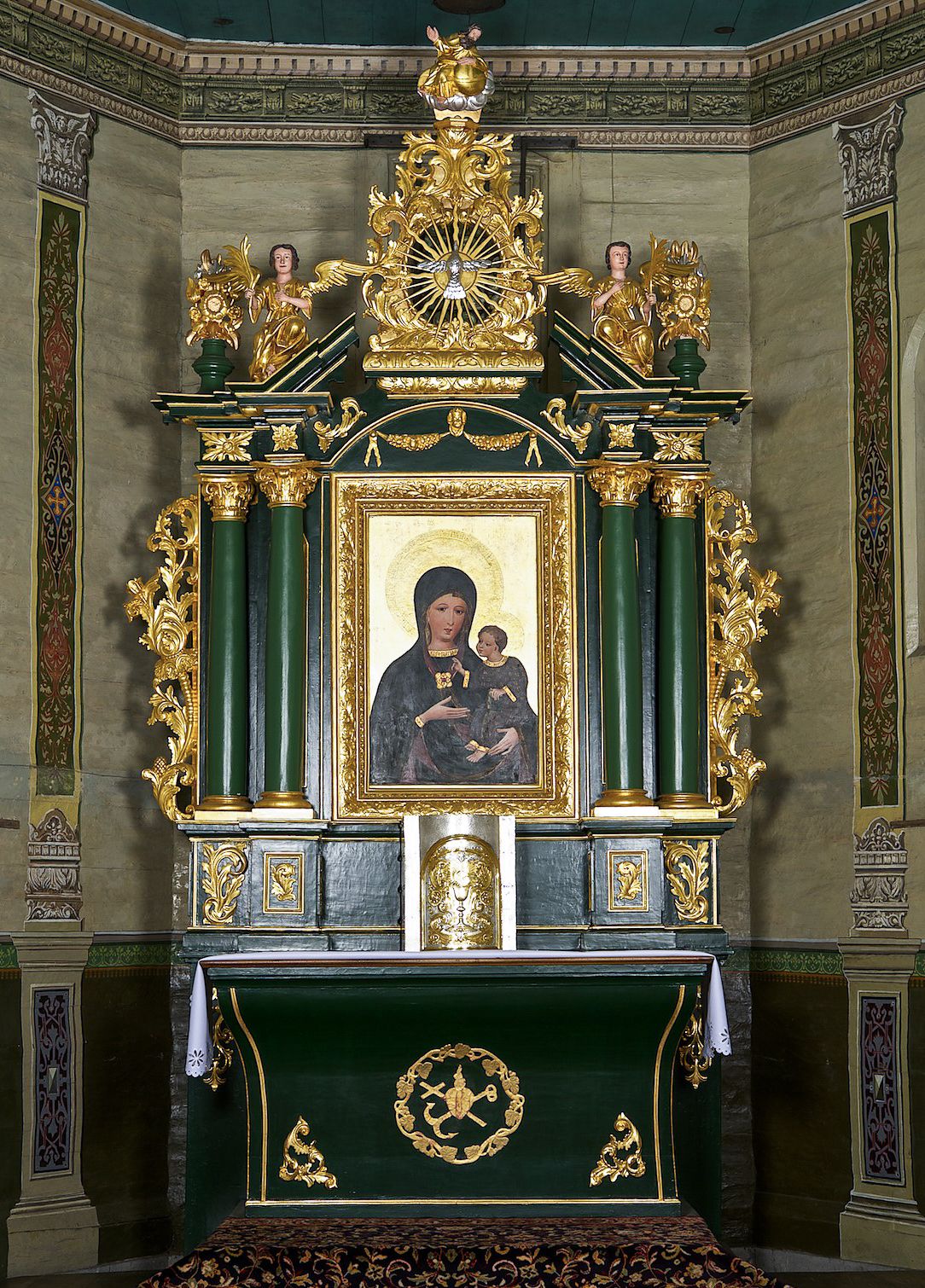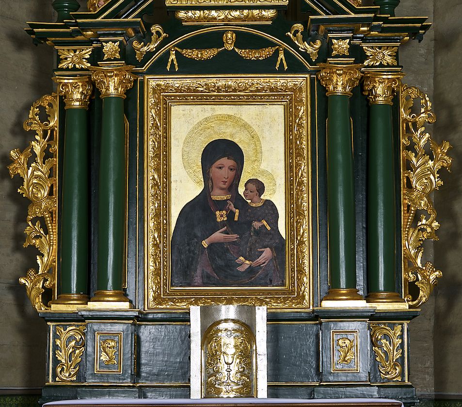 The altar in question is a work of undetermined authorship, whose creation dates back to the second half of the 17th century (or more precisely, to the fourth quarter of this century). The form of the reredos indicates that it was established in the second half of the 17th century and represents the features of early baroque wood carving. The altar now houses the gothic image of Madonna and Child in the Hodegetria type. It was placed there between 1703 and 1727. Earlier in this place, there was a painting depicting the Assumption of Mary. This image was then transferred to one of the side altars. It is currently exhibited in the temple porch. This painting is dated 1674. It can be assumed that the discussed reredos was created at the same or similar time.