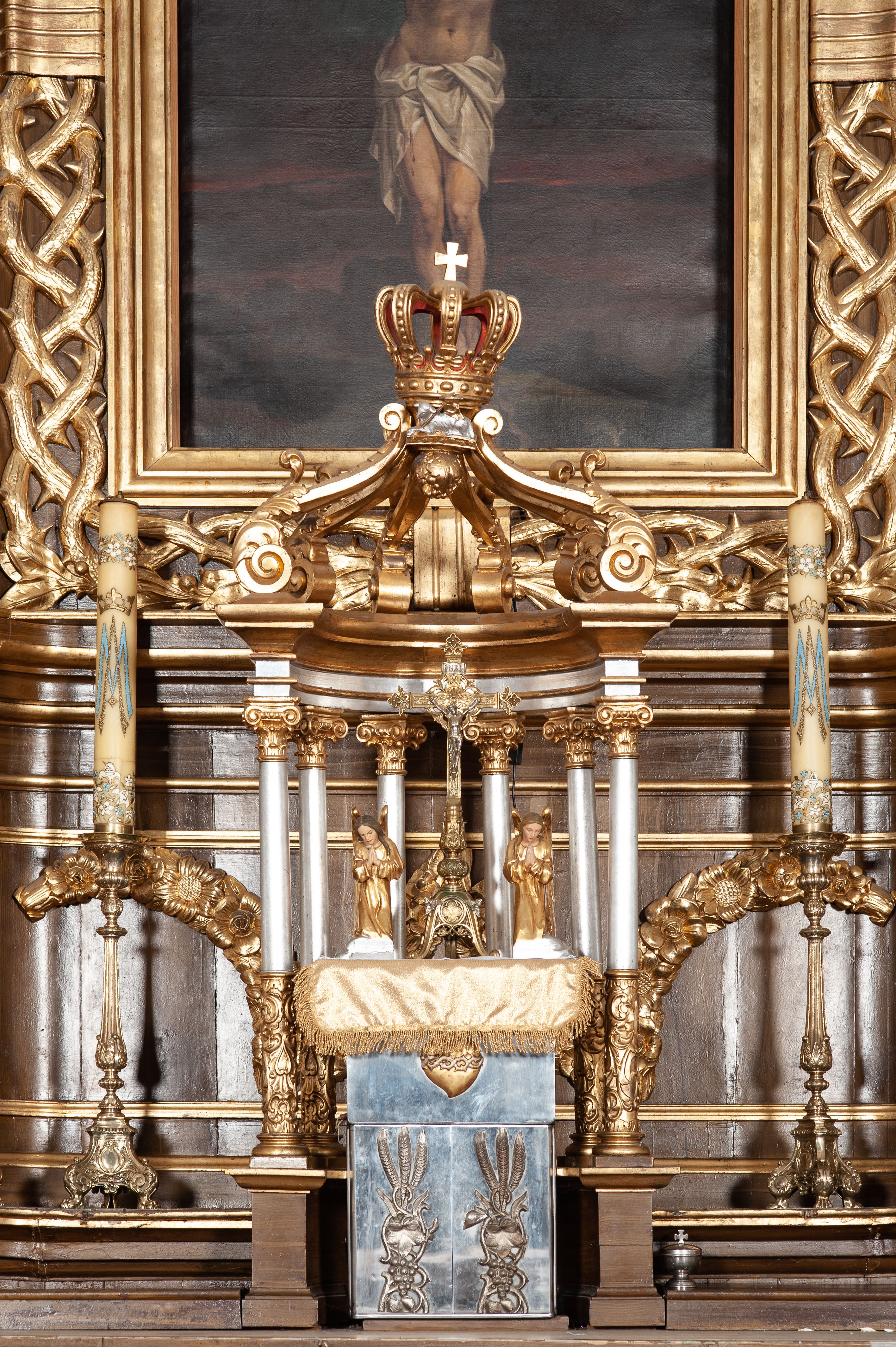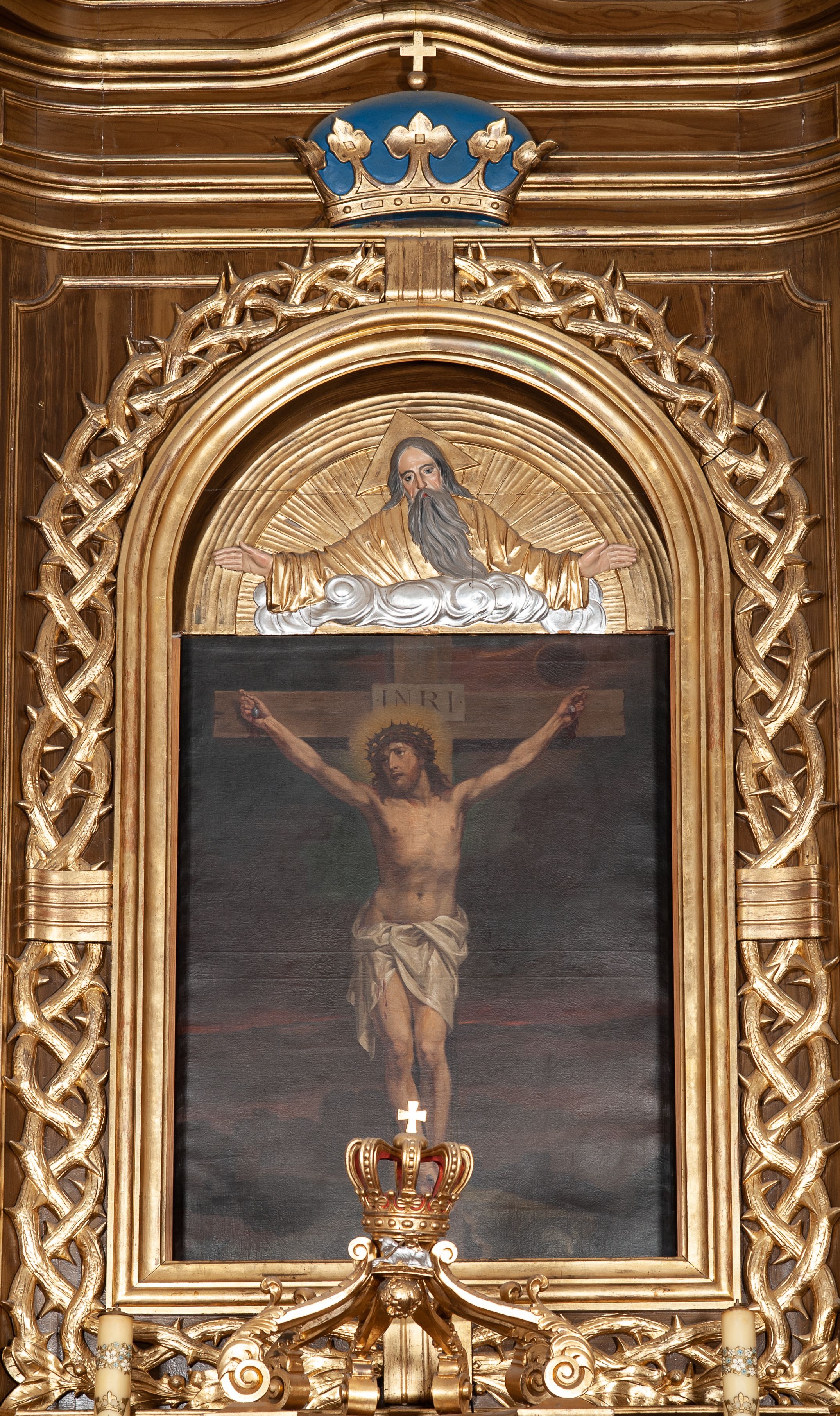 The altar was presumably funded in 1914 by priest Władysław Jettmar who personally searched for oaks in the area and asked people to donate them for the altar. The work was created by Styczeń, a Cracovian sculptor (his first name is unknown). The altar was painted and gilded in 1948-1949. Unfortunately, there is little information available on the author of the work. It is known that he also carved a statue of St. Valentine in the church in Konopiska (Częstochowa Poviat), located in the high altar, which was built in the years 1928-1930. Furthermore, Styczeń created the cover to the baptismal font with statues of Christ and Saint John the Baptist in the church in Gorzków. The altar is a typical example of an eclectic reredos, characterised by a simple, one-storey, uniaxial form with a couple of columns on the sides. A crown of thorns twisted around the main area of the altar is an innovative element of decoration.
