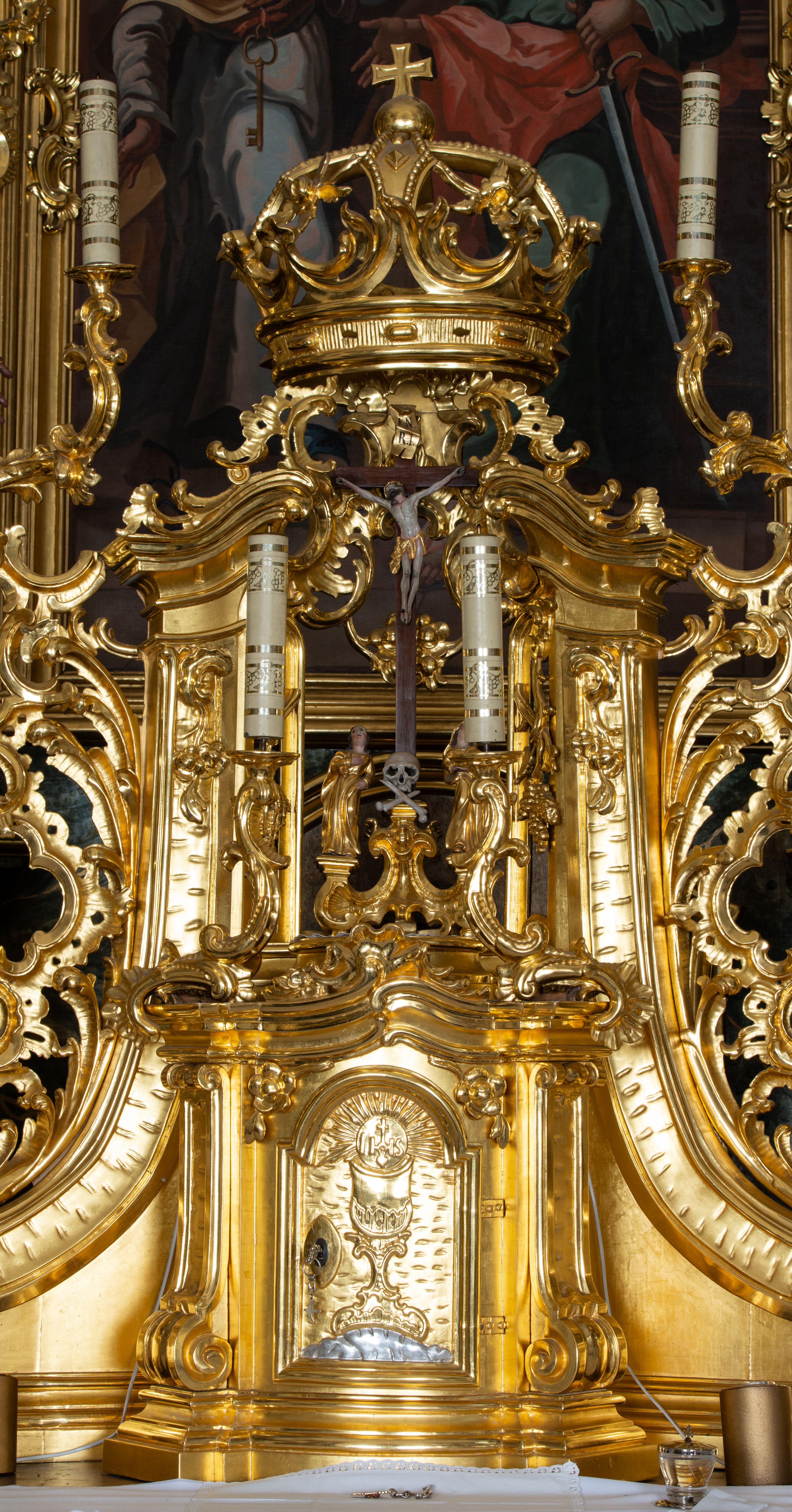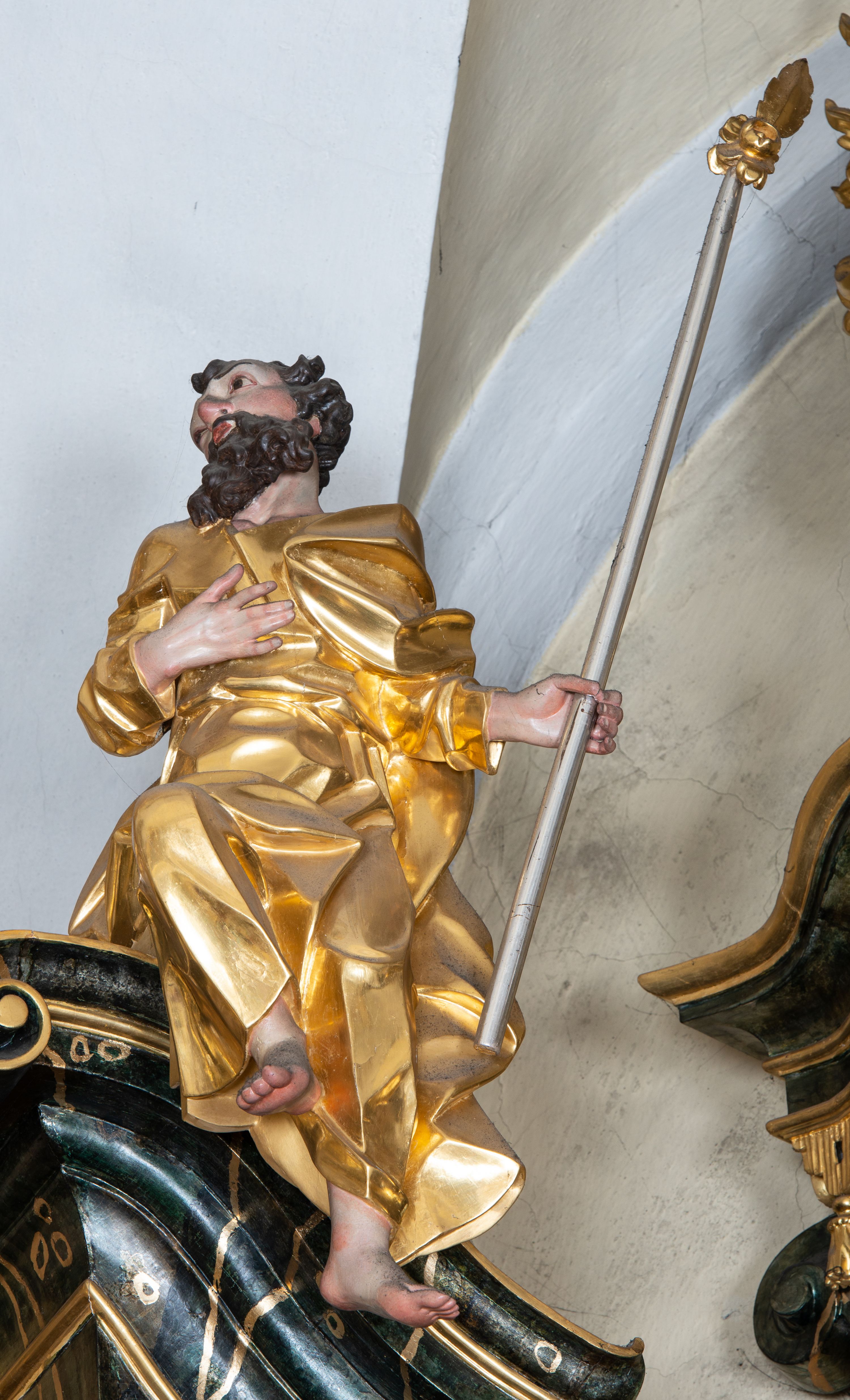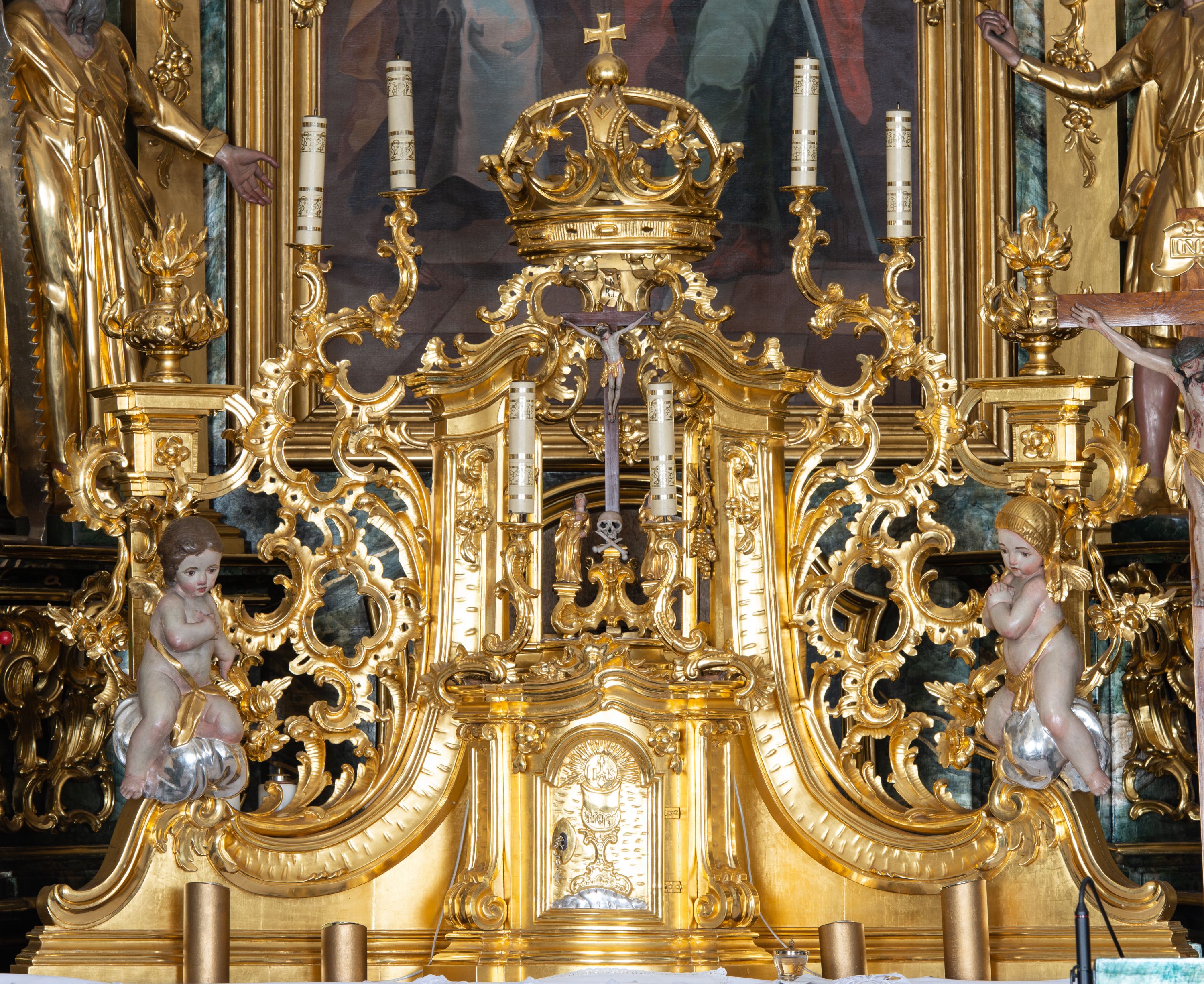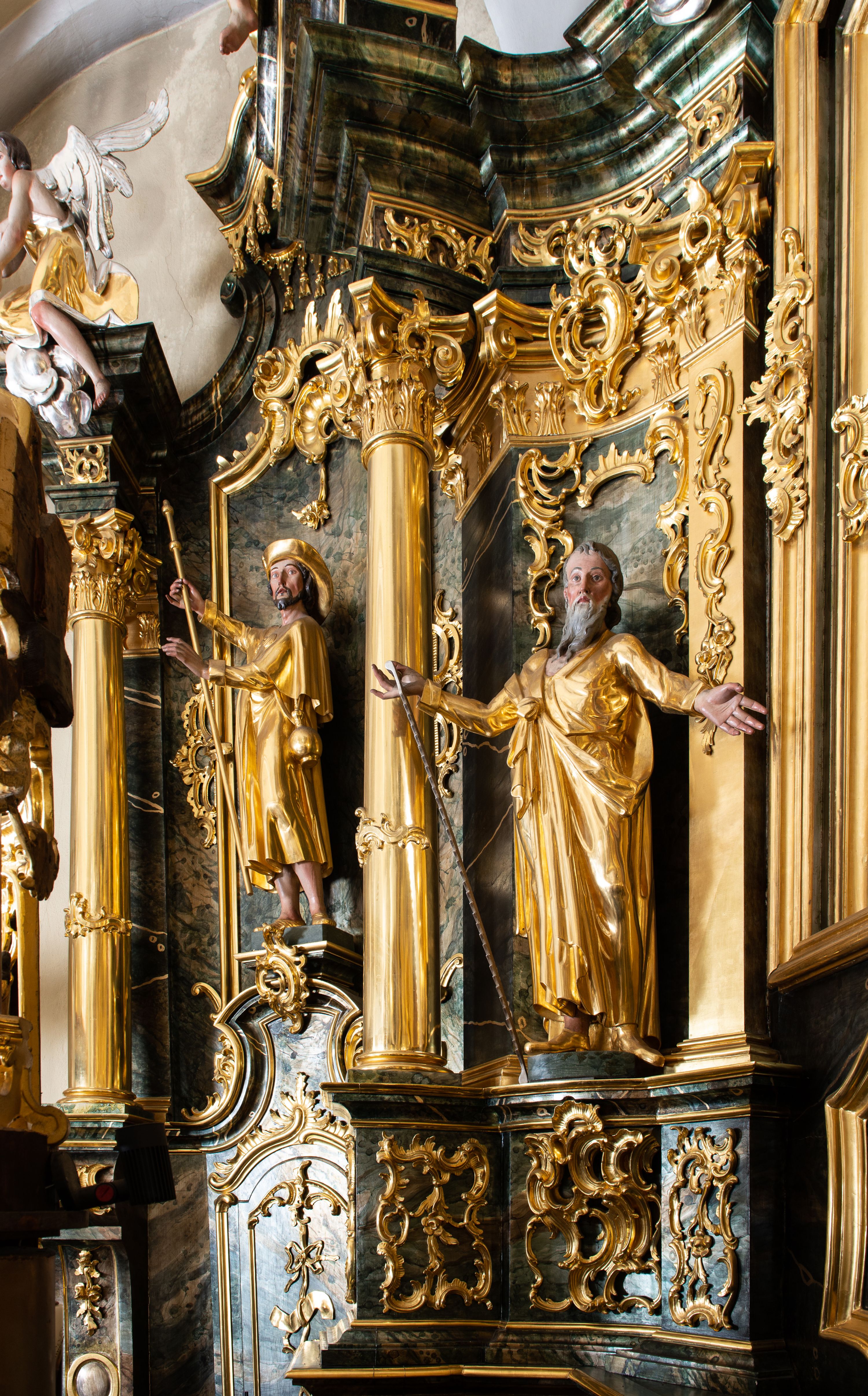 The high altar in the church in Łapsze Wyżne was built shortly after the construction of the temple in Rococo style, in 1776. It represents a single-storey, three-axis reredos with gates, decorated with a rococo ornament, typical of the time of creation. Together with two side altars and a pulpit, it forms an integral church decor, made by the workshop of artists from Kežmarok – Johann and Franciszek Feeg. The iconographic programme of the high altar with the painting "St. Peter and St. Paul" directly relates to the invocation of the temple. The altar's funder is Jan Joanelli of Tolvano. To create the altar, he ordered artists from Spiš, i.e. the painter Imrich Jagušič, who painted the image of St. Peter and St. Paul, and brothers from the Feeg family. Since the statues located on the lower tier of the altar express calmness, and robes are draped in vertical and monotonous folds, unlike the statues on the second tier with dynamical expression in form of movement, Katerina Chmelinová – a Slovak researcher, suggested that the altar's reredos was made by Franciszek Feeg in collaboration with his younger brother Johan, who carved statues of St. Joachim and St. Joseph in the altar final. Feeg's sculptures are characterised by natural poses, lavish folds of robes modelled in the form of sharply buckling planes, (reminiscent of a broken metal sheet), and faces with a significant anatomical type with such specific features as plump cheeks, half-open mouths and large noses. The altar and its sculptures are examples of so-called Rococo of Spiš – a style that gradually developed from the 1740s and was characterised by exceptional decorativeness of means of expression. The works of artists from Kežmarok – the authors of the work in question – were the culmination of that style.