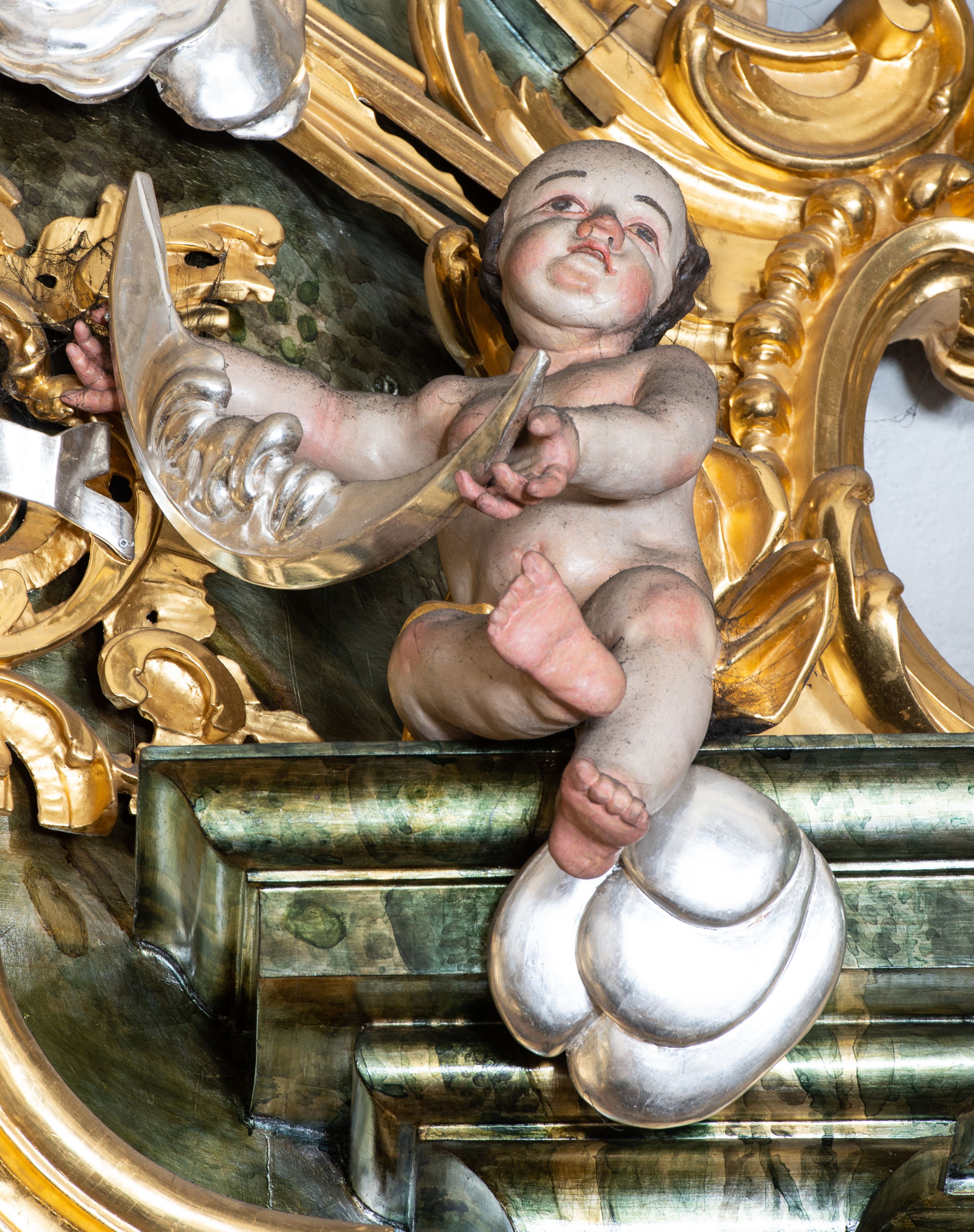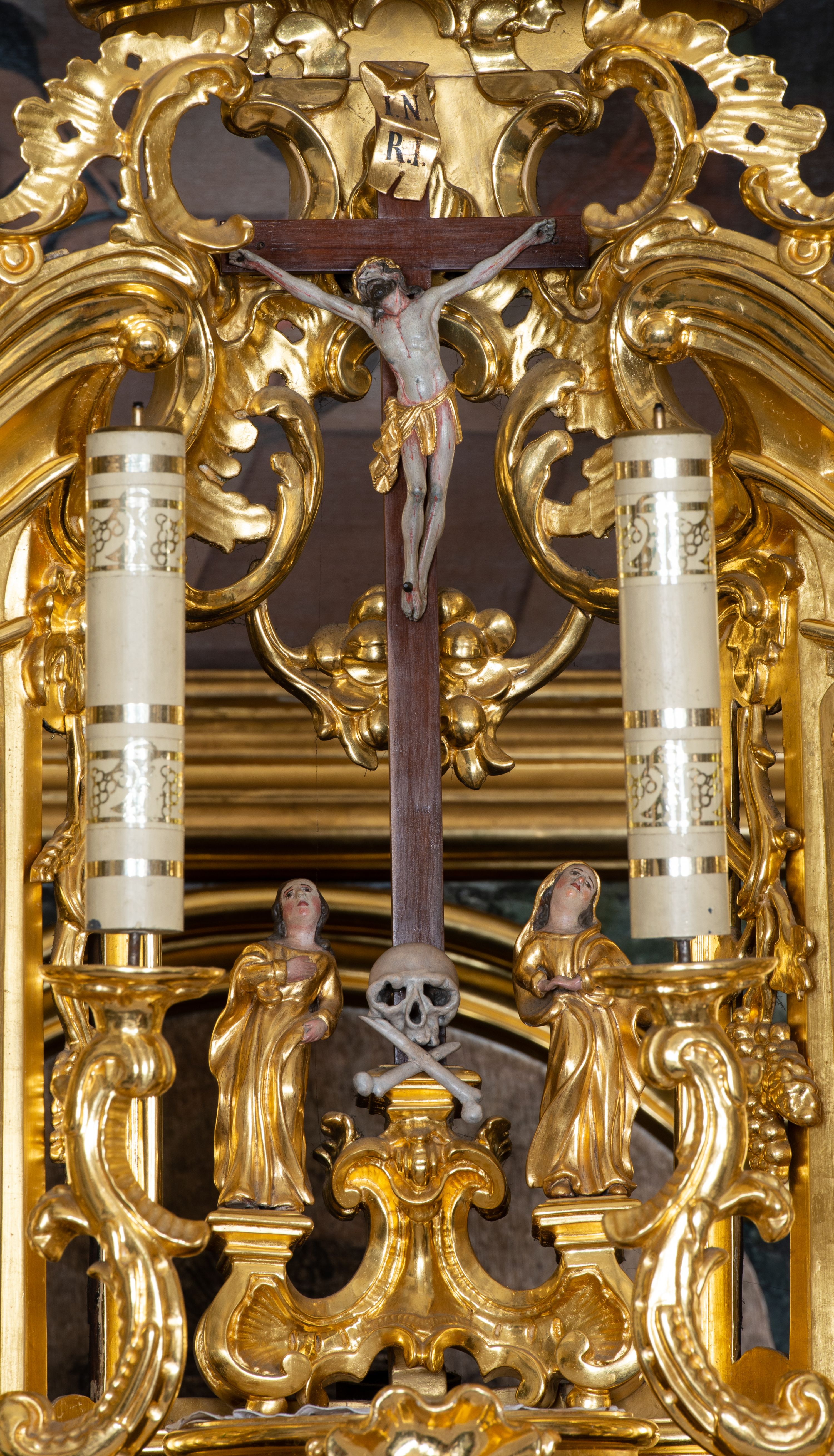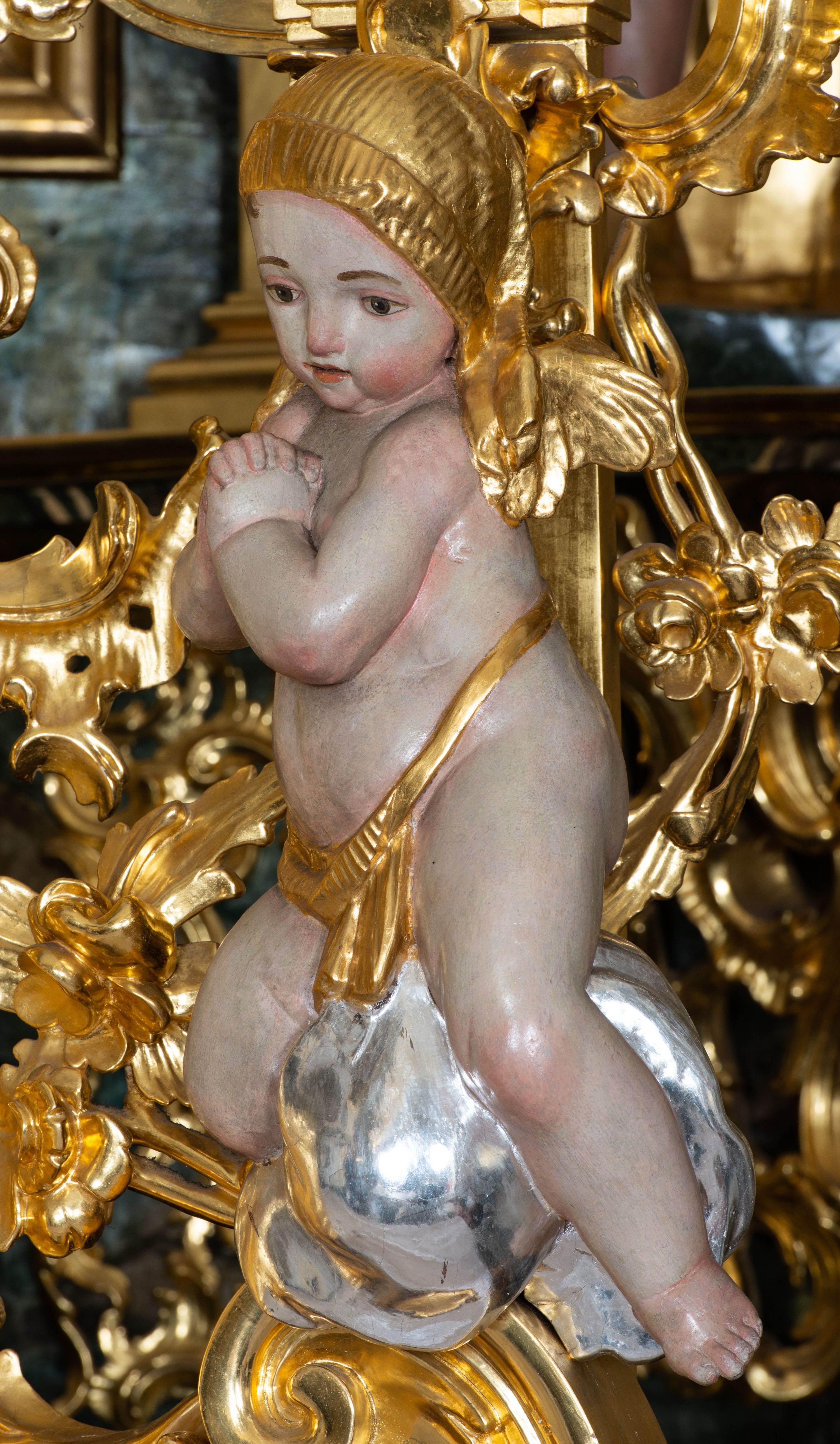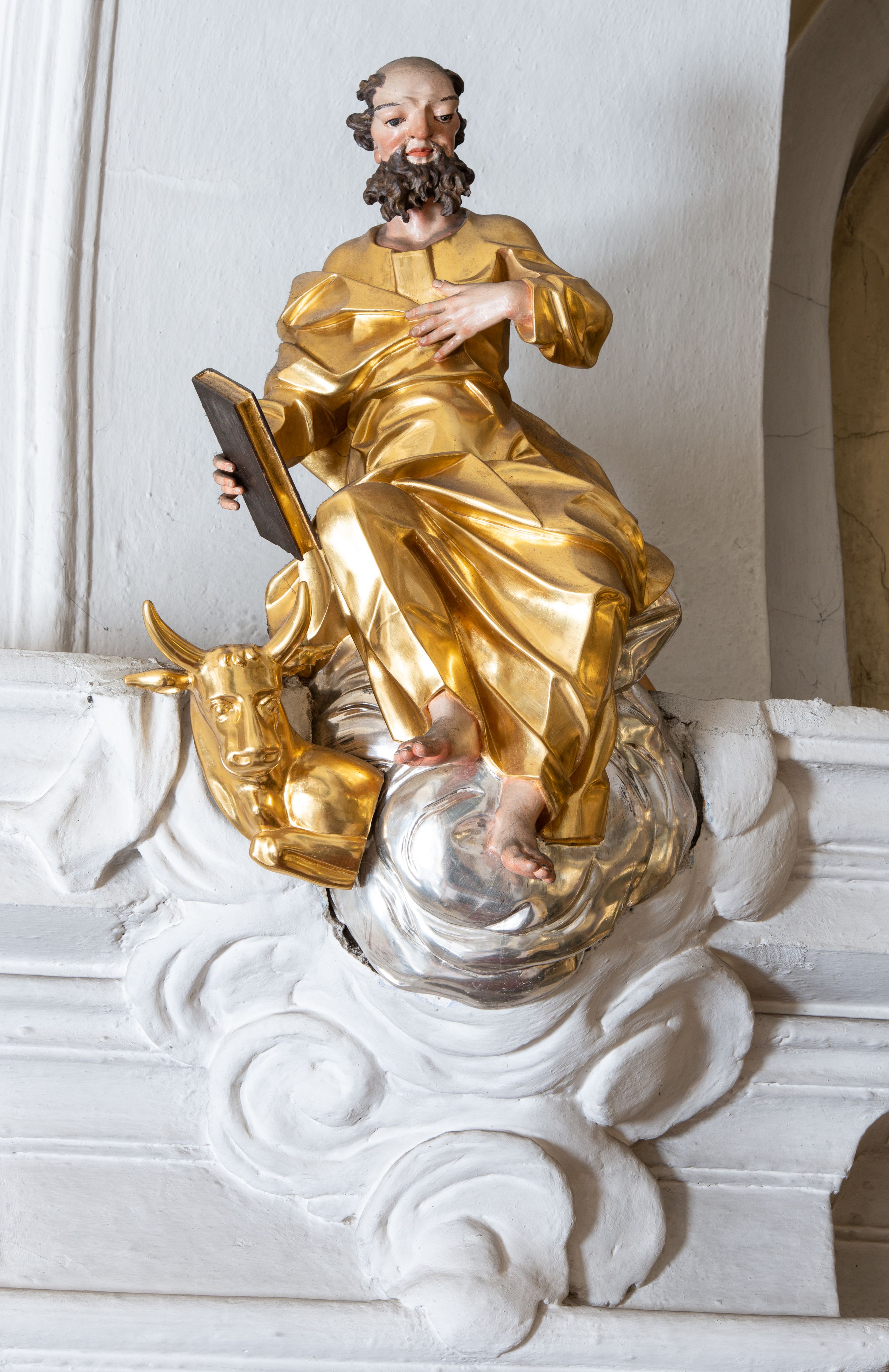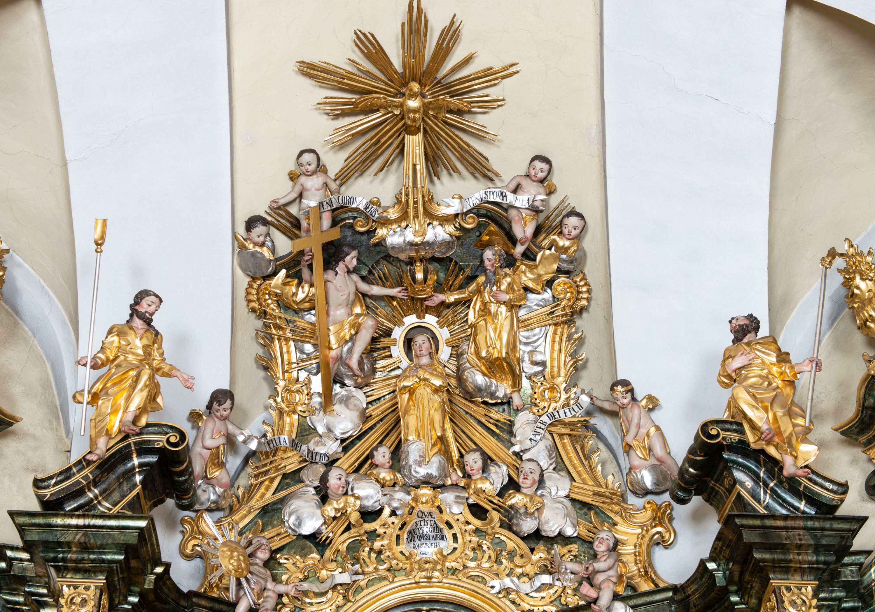 The high altar in the church in Łapsze Wyżne was built shortly after the construction of the temple in Rococo style, in 1776. It represents a single-storey, three-axis reredos with gates, decorated with a rococo ornament, typical of the time of creation. Together with two side altars and a pulpit, it forms an integral church decor, made by the workshop of artists from Kežmarok – Johann and Franciszek Feeg. The iconographic programme of the high altar with the painting "St. Peter and St. Paul" directly relates to the invocation of the temple. The altar's funder is Jan Joanelli of Tolvano. To create the altar, he ordered artists from Spiš, i.e. the painter Imrich Jagušič, who painted the image of St. Peter and St. Paul, and brothers from the Feeg family. Since the statues located on the lower tier of the altar express calmness, and robes are draped in vertical and monotonous folds, unlike the statues on the second tier with dynamical expression in form of movement, Katerina Chmelinová – a Slovak researcher, suggested that the altar's reredos was made by Franciszek Feeg in collaboration with his younger brother Johan, who carved statues of St. Joachim and St. Joseph in the altar final. Feeg's sculptures are characterised by natural poses, lavish folds of robes modelled in the form of sharply buckling planes, (reminiscent of a broken metal sheet), and faces with a significant anatomical type with such specific features as plump cheeks, half-open mouths and large noses. The altar and its sculptures are examples of so-called Rococo of Spiš – a style that gradually developed from the 1740s and was characterised by exceptional decorativeness of means of expression. The works of artists from Kežmarok – the authors of the work in question – were the culmination of that style.
