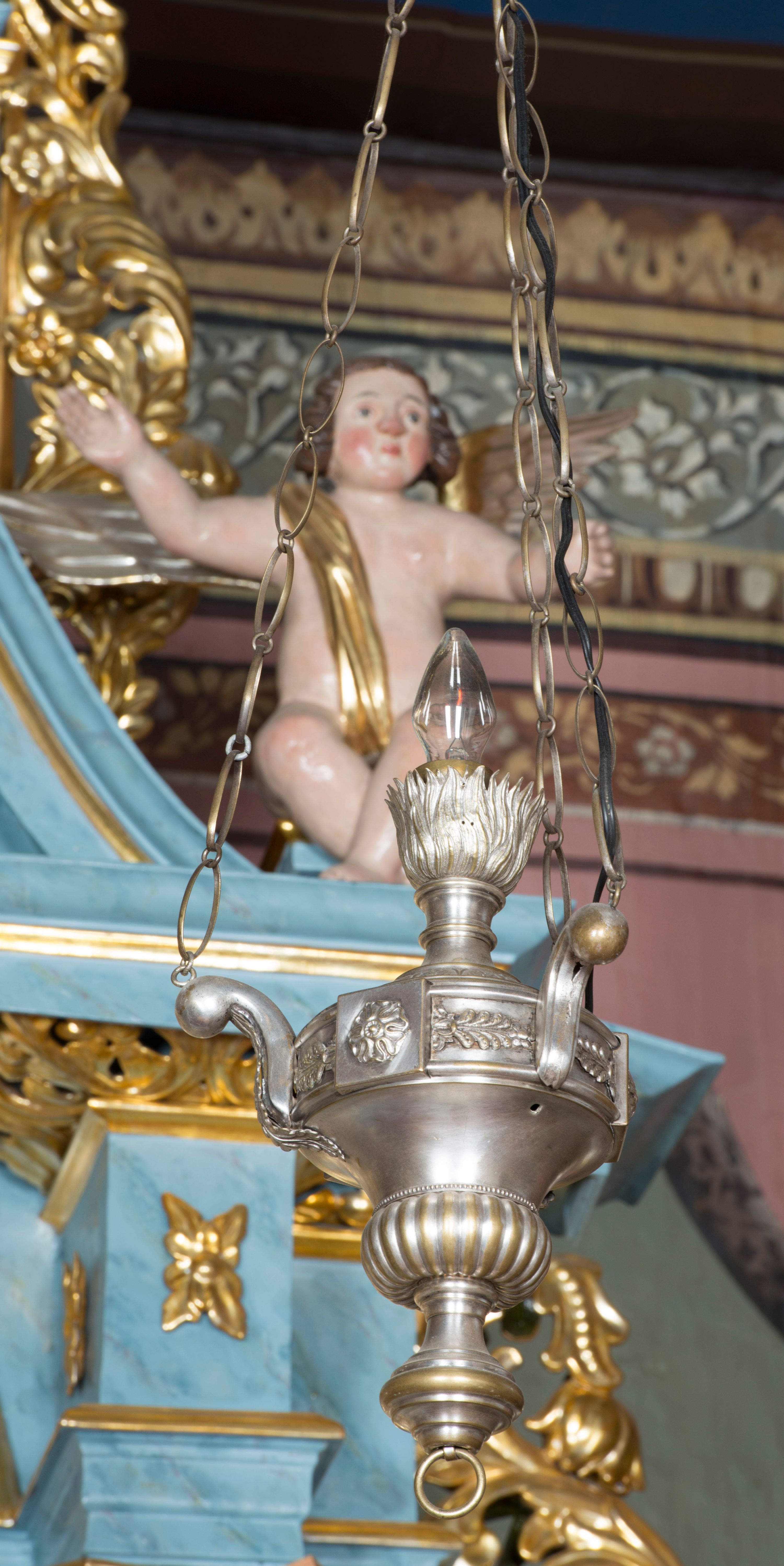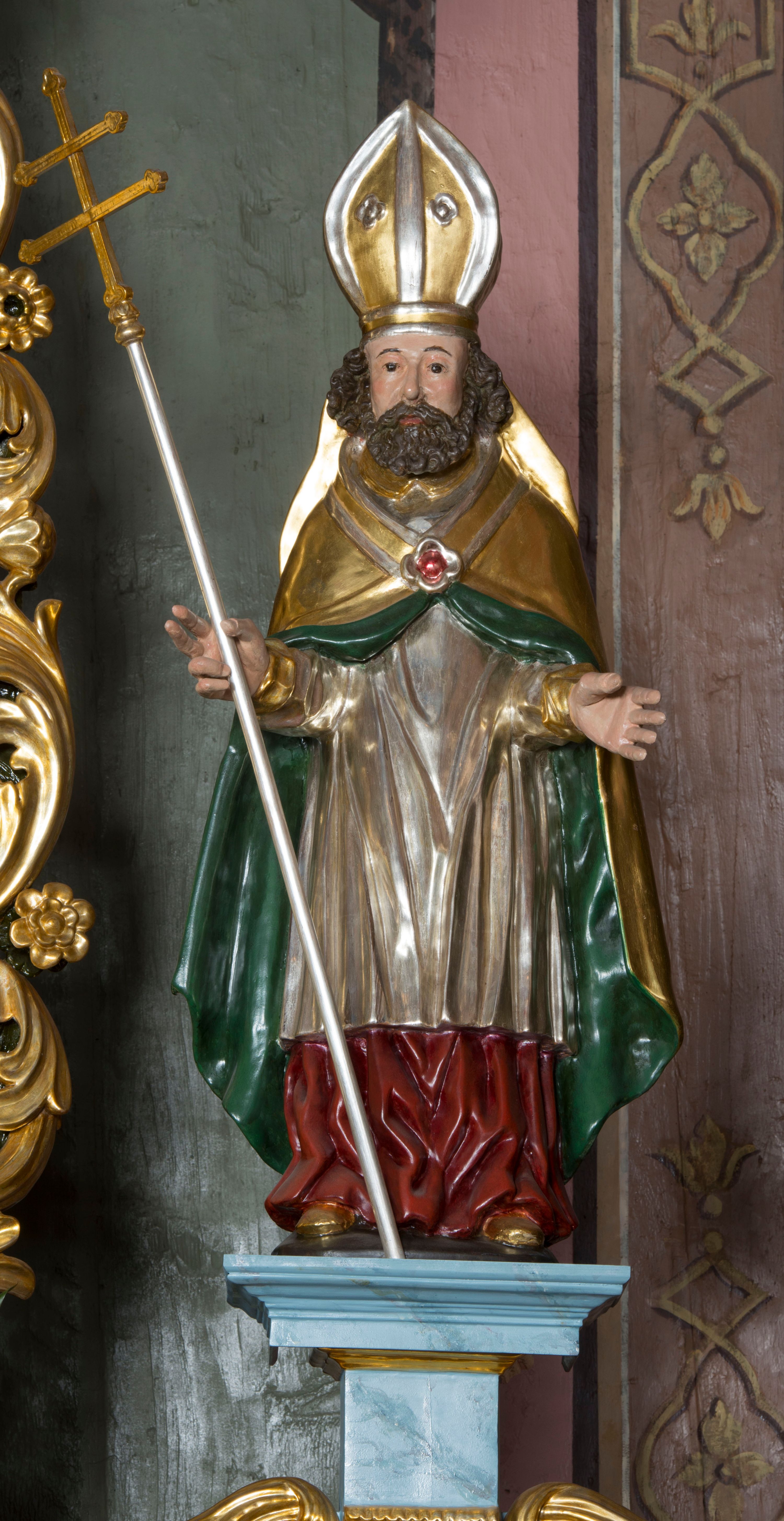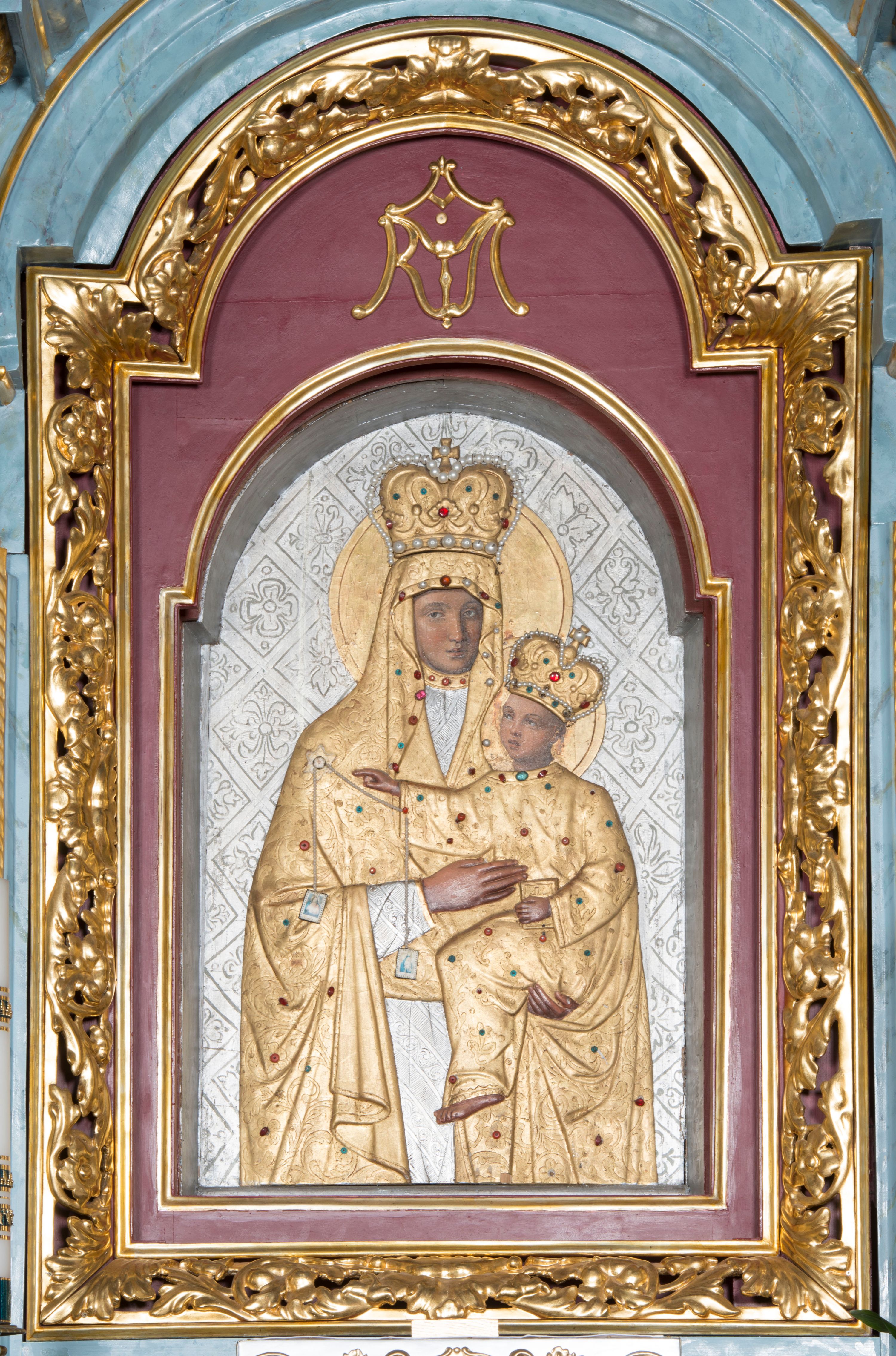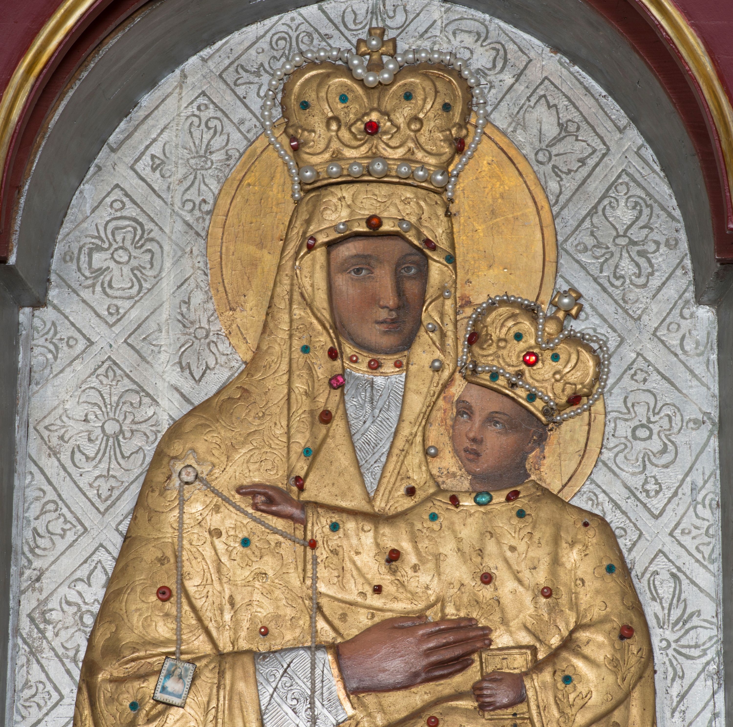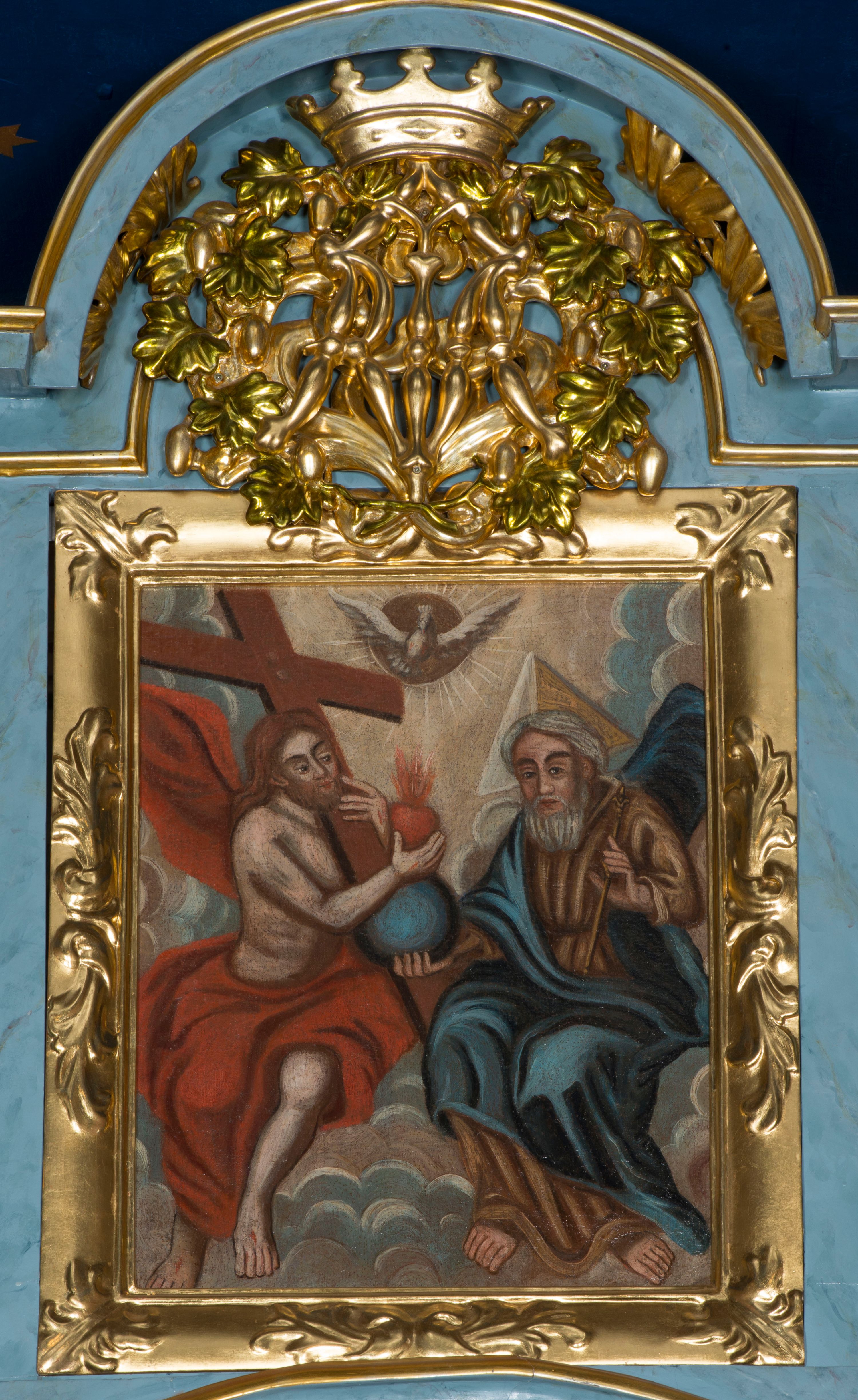The reredos of the high altar in the parish church in Krzeczów presents stylistic features attributed to small architectural forms of circa the year 1700. The reredos remains however the work of a circle of provincial woodcarving workshops.