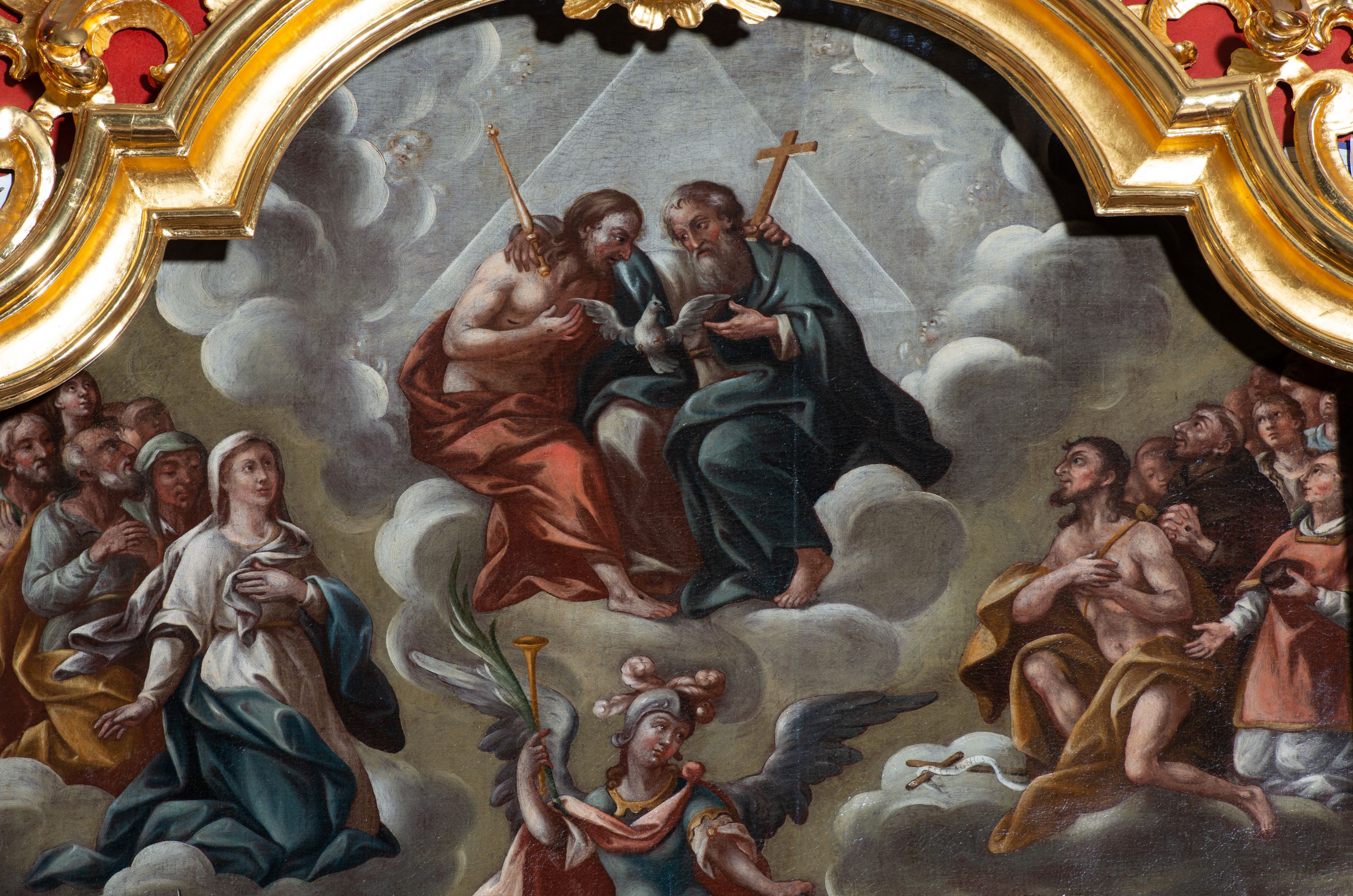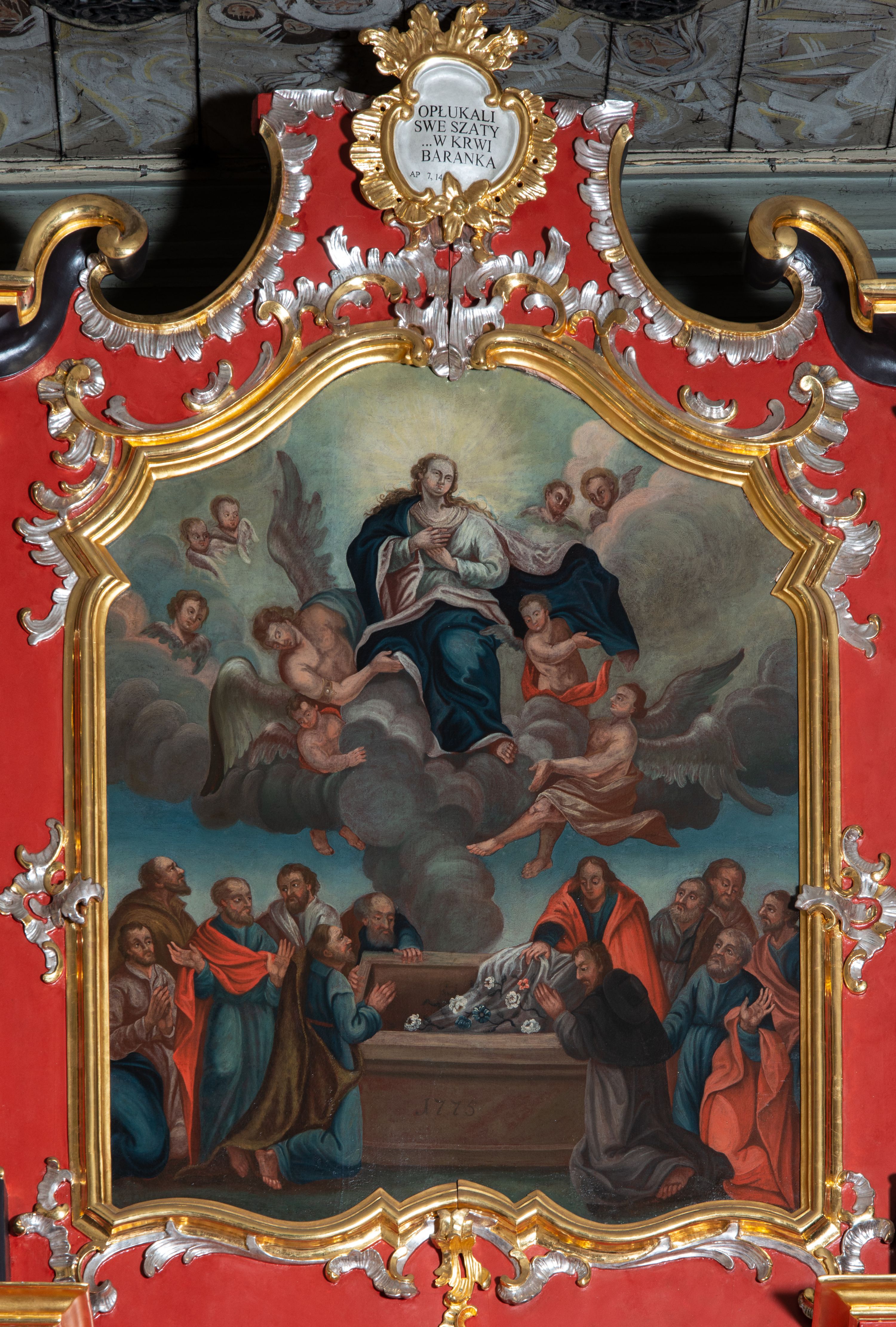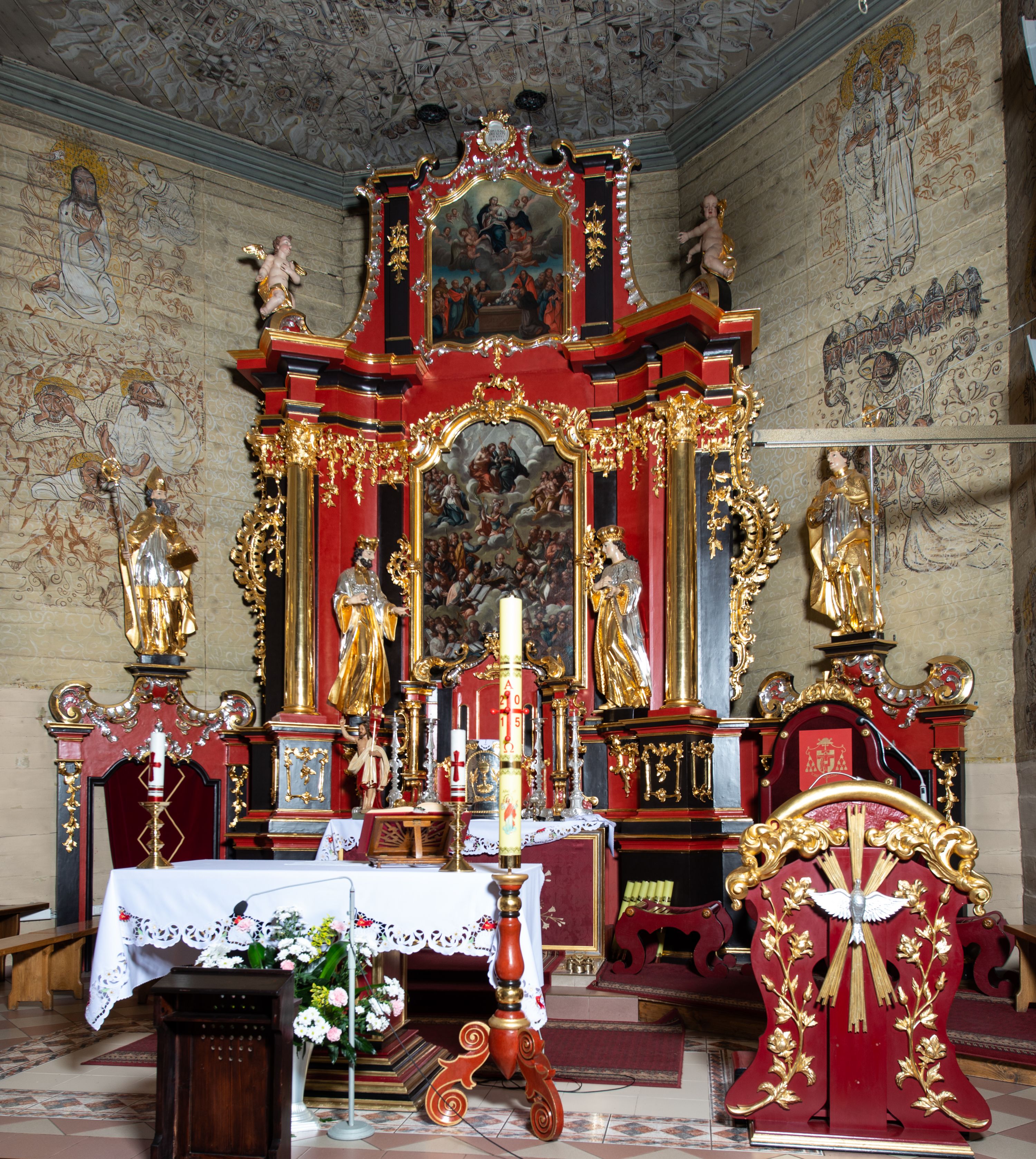 The high altar was created shortly after the church was built, i.e. around 1775 in the Rococo style. In the main area there is a painting of All Saints from the beginning of the 18th century (transferred from the previous temple); on the sliding panel there is the painting "Crucifixion" from the second half of the 18th century, from the foundation of father Wojciech Brandysiewicz. In turn, in the finial there is a canvas of an unknown artist, depicting the Assumption of the Blessed Virgin Mary from 1775. In addition, the altar is decorated with statues of four Polish saints: Saint Adalbert, Saint Stanislaus, Saint Casimir and Saint John Canthius, as well as two sculptures of angels in the finial party. It represents a two-storey, uniaxial reredos with gates, decorated with a Rococo ornament adequate to the time of creation. Together with two side altars, it creates an integral interior of the church, probably made by the workshop of the artist from Kežmarok, Johann Feeg. The altar and its sculptures are examples of the so-called Spisz Rococo, a style that gradually developed from the 1840s and was characterised by exceptional decorativeness.