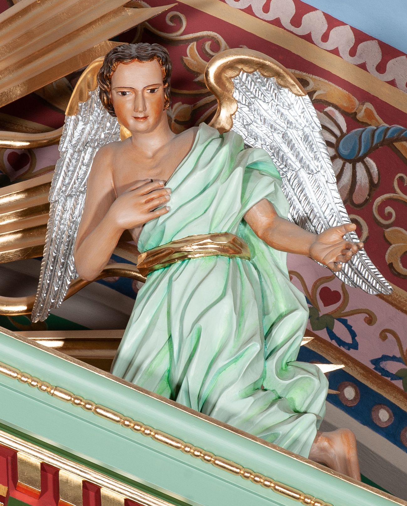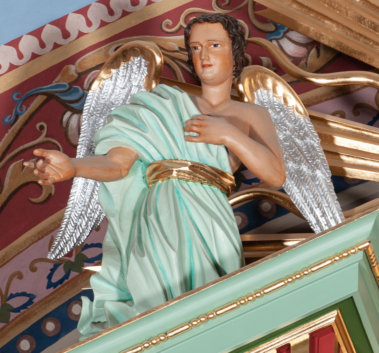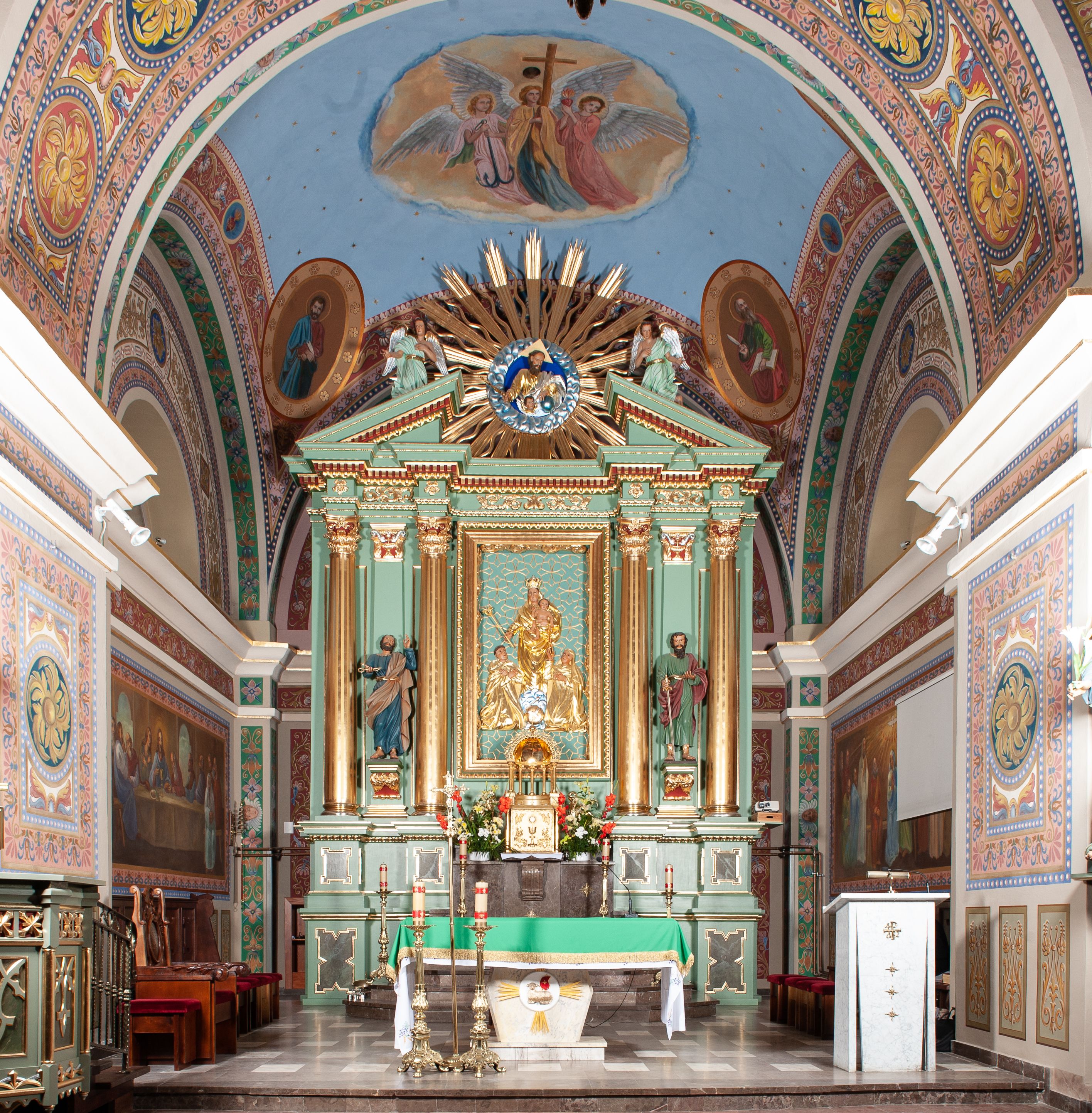 The high altar in the church in Osielec was built by Andrzej Czesacz of Weksmund in 1840. Its structure is based on models developed in modern art. The reredos is resting on a tall pedestal, with a main area of the altar flanked by supports, and with a radiant aureole crowning the structure. The main area of the altar features a painting of Our Lady of the Rosary, and there are statues of St. Peter and St. Paul on the sides.