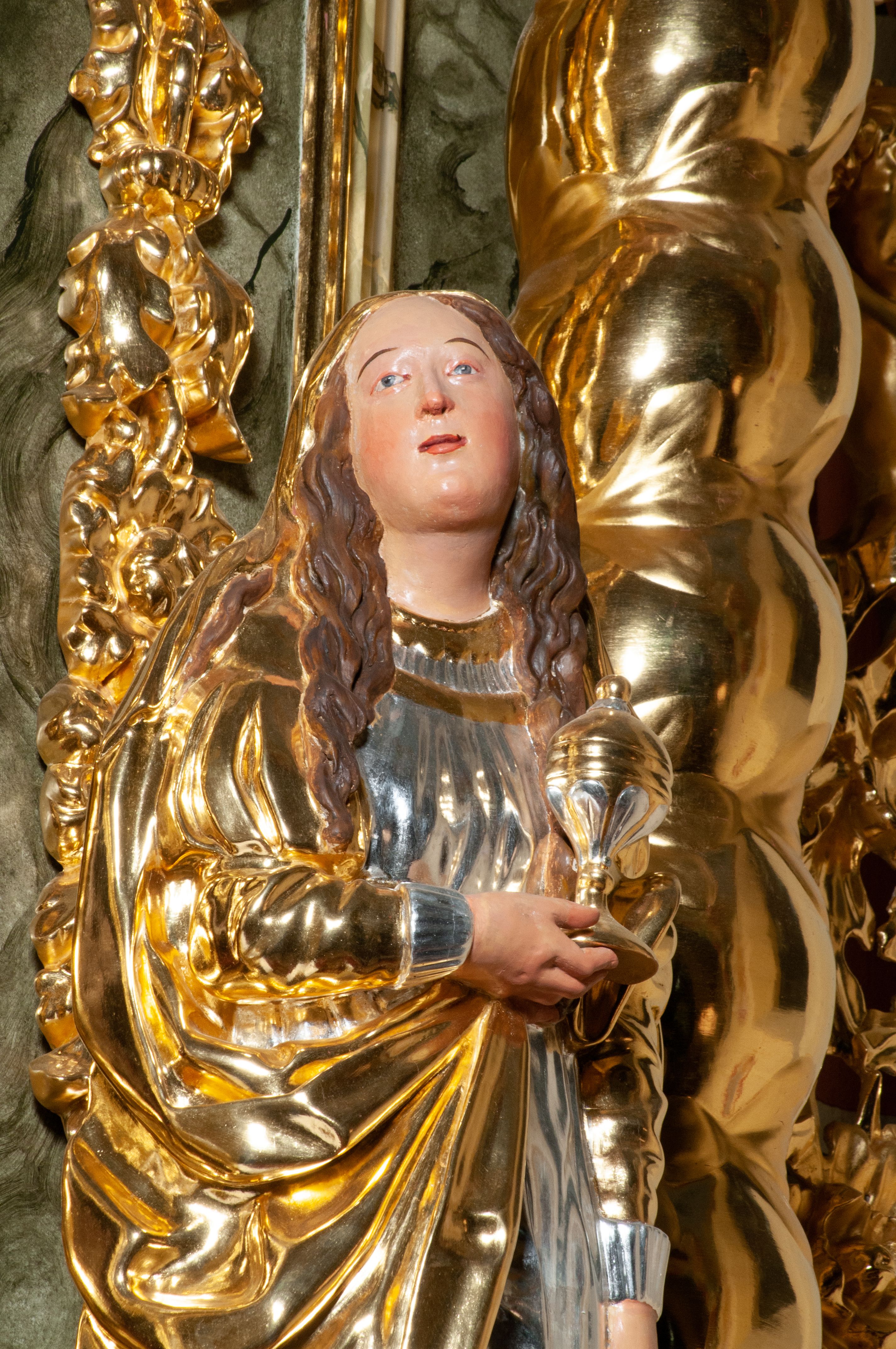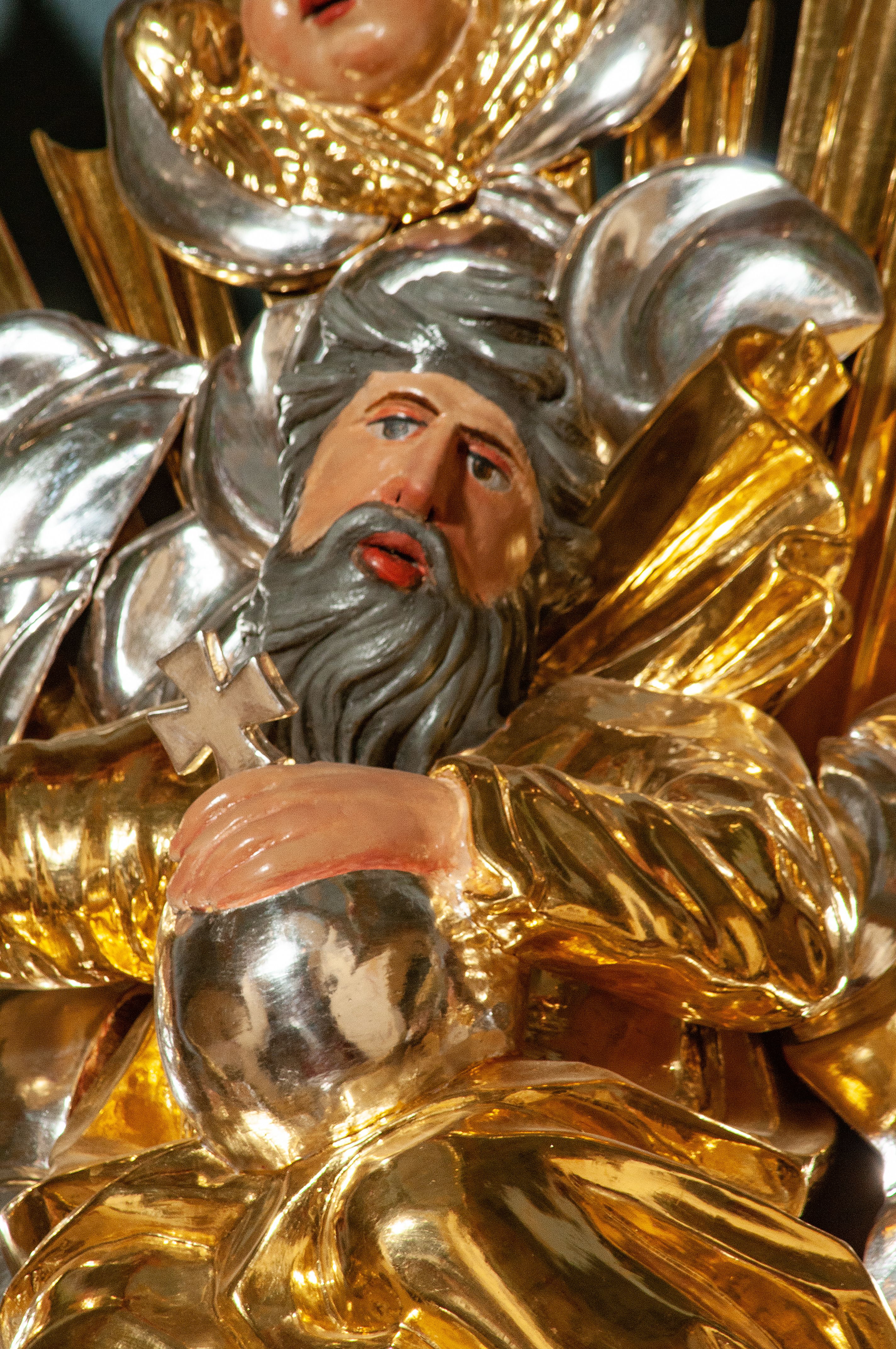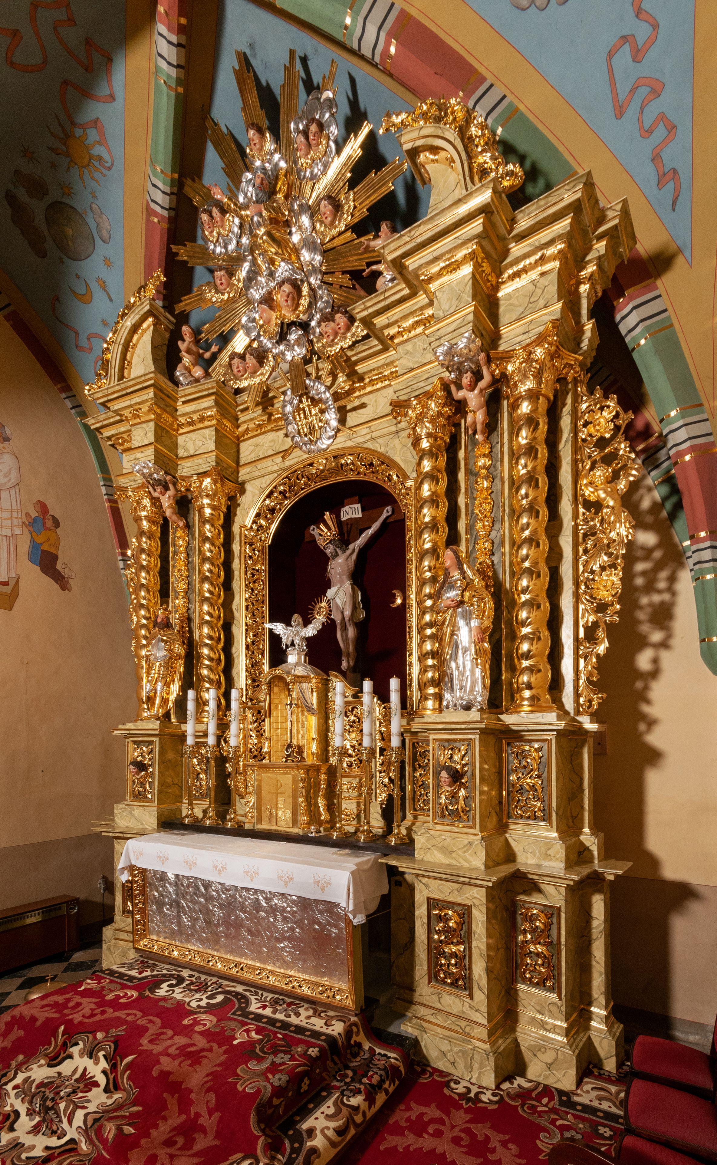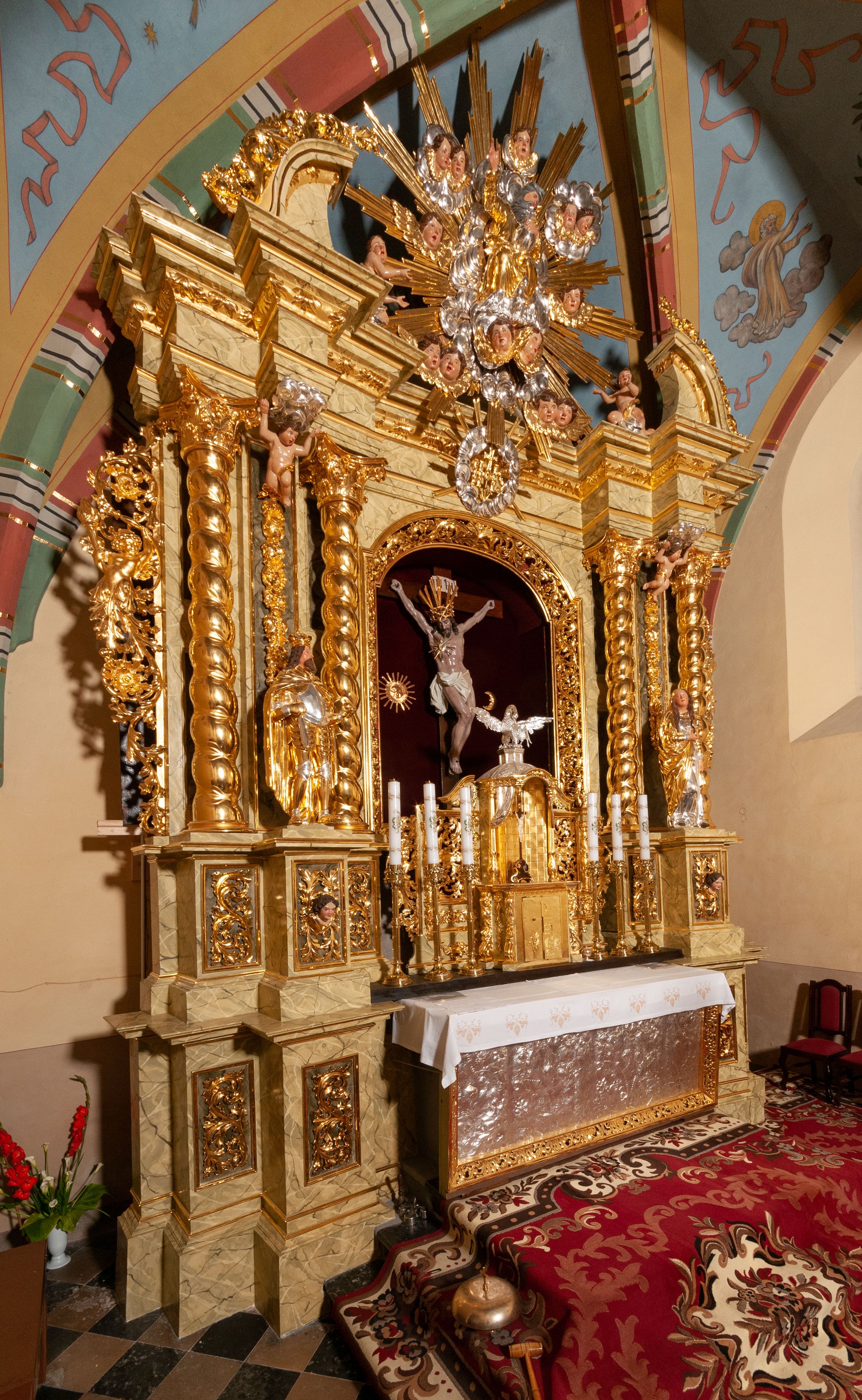 The high altar of the church in Wawrzeńczyce was built in the first half of the 18th century and rebuilt in 1870, statues of saints were added in 1877. The altar has a clear iconographic programme: on the axis there is the Holy Trinity as three figures flanked by two figures of saints who are former church patrons.