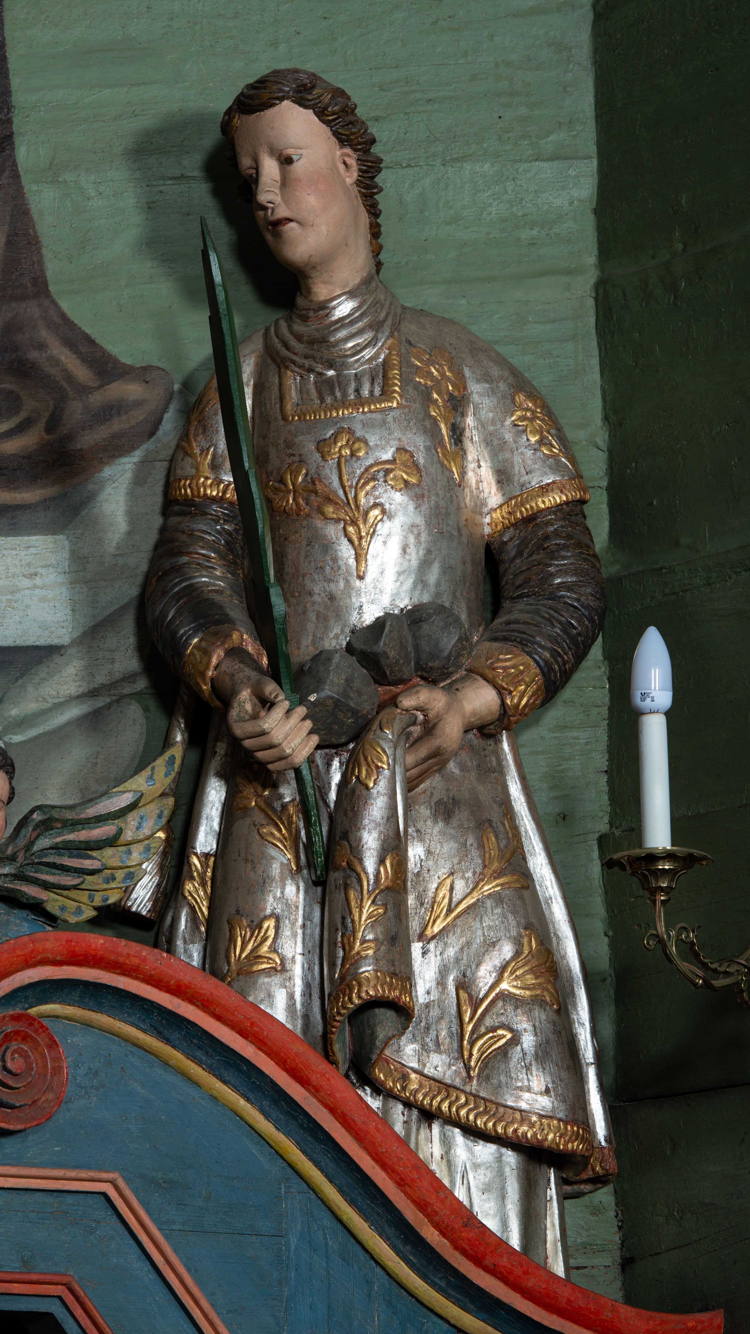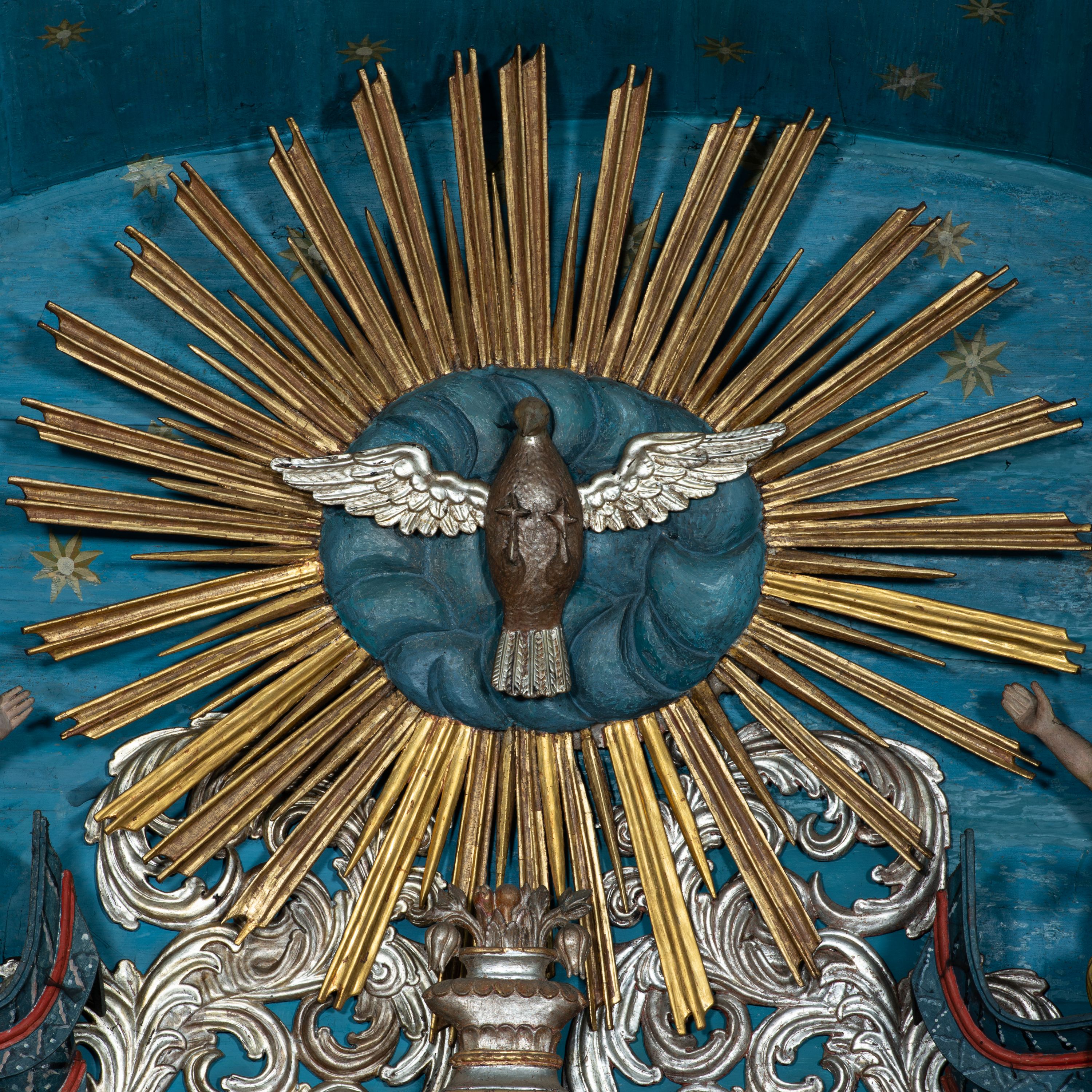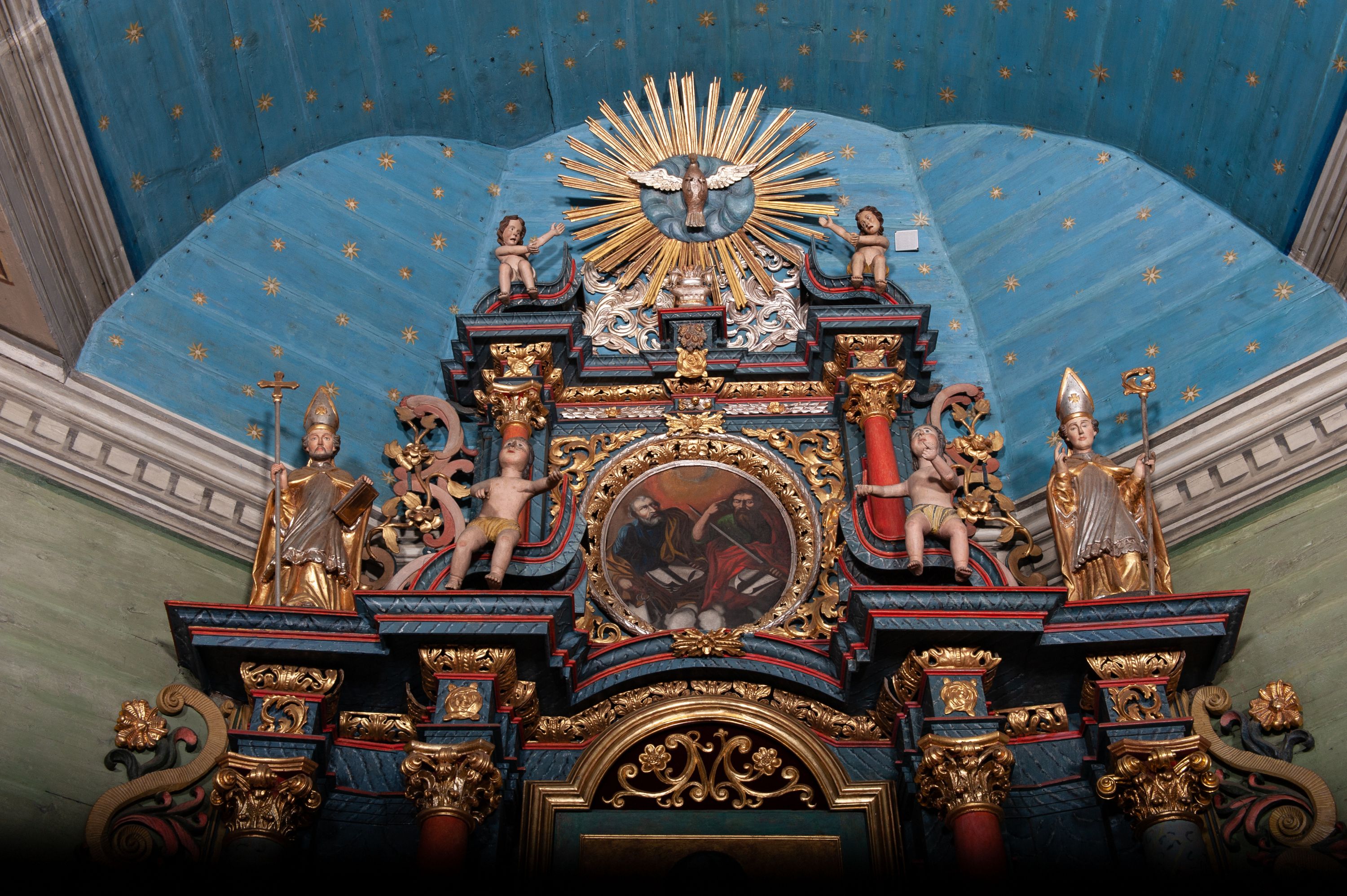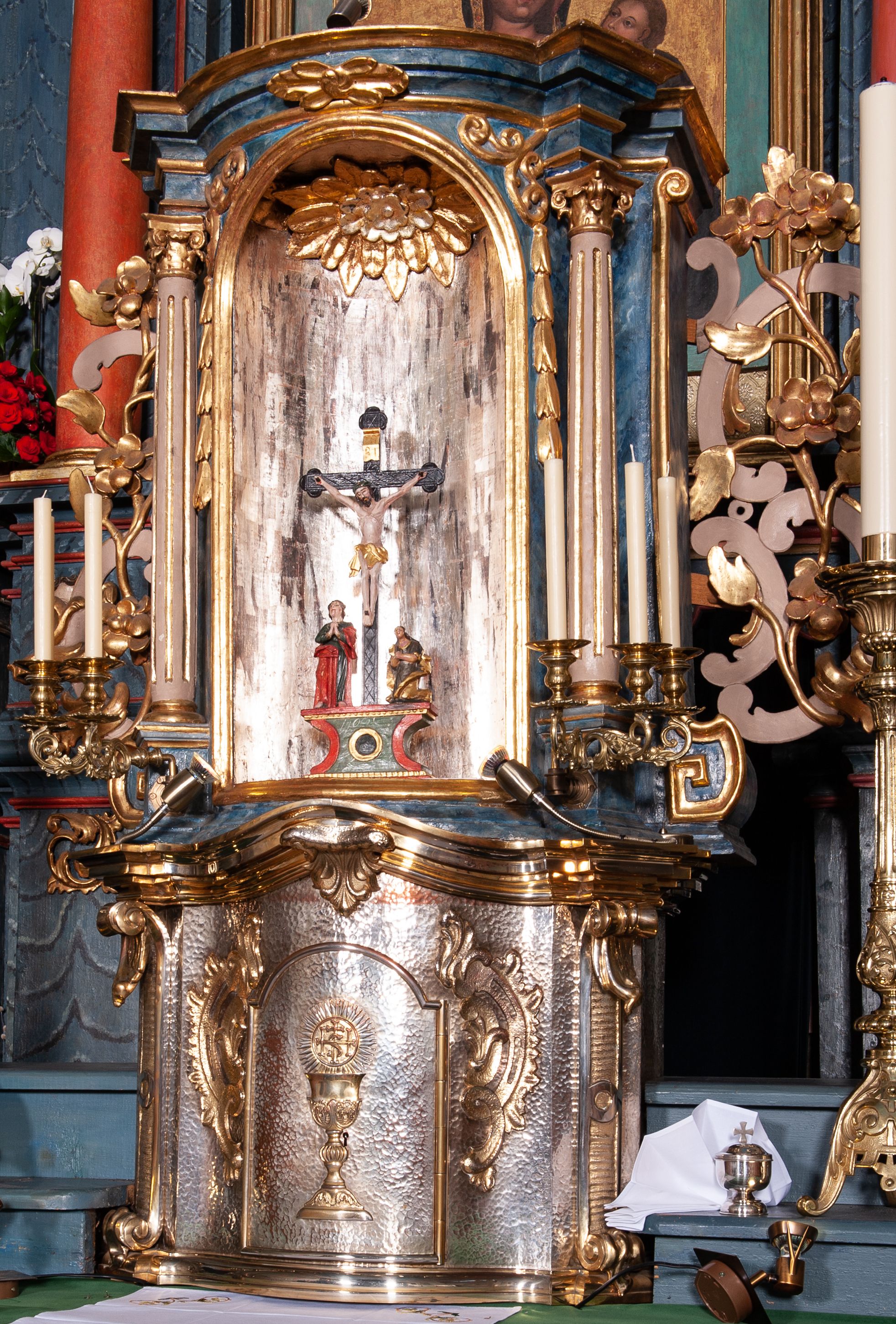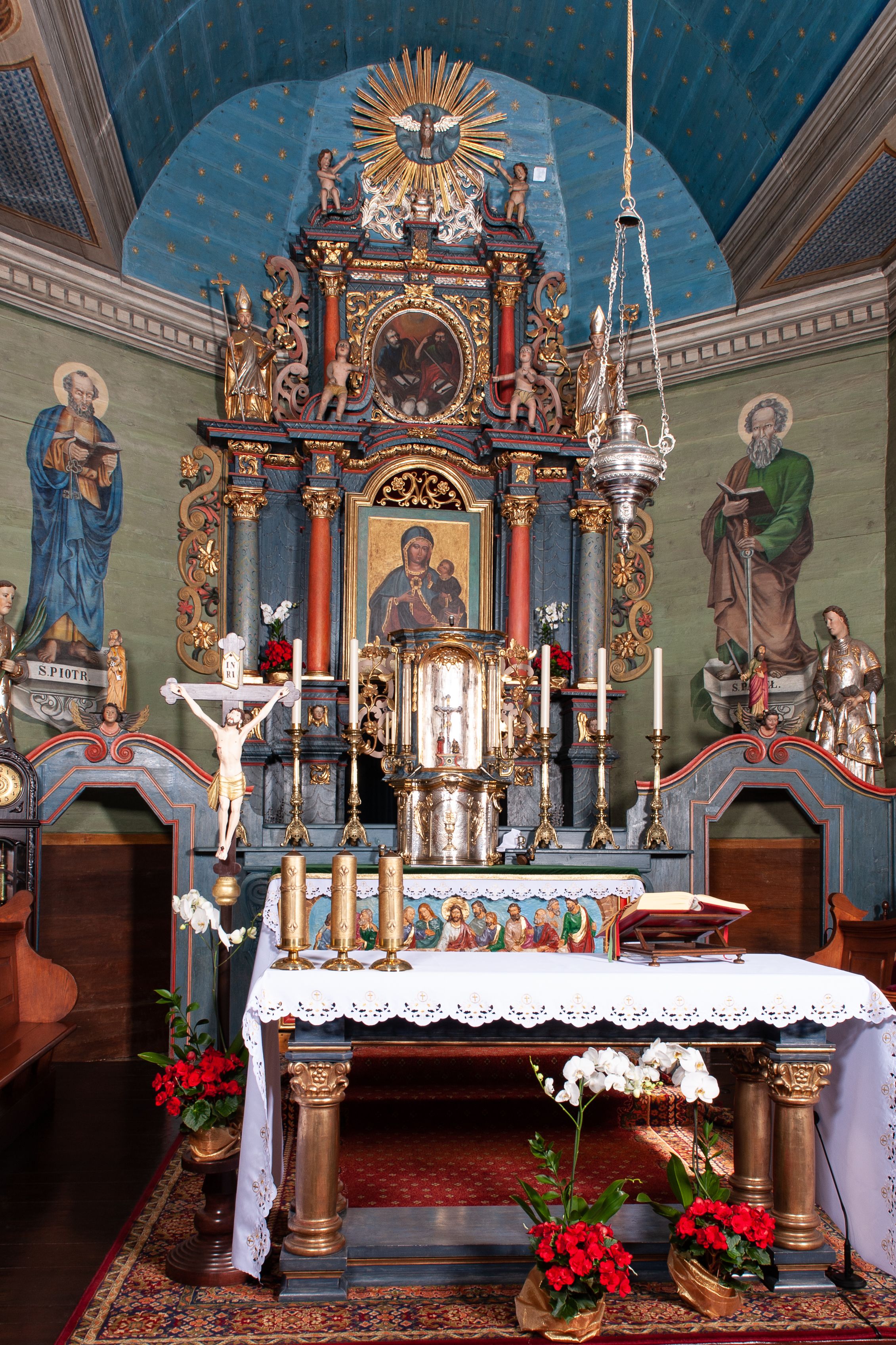 The 19th-century high altar of the church in Lachowice represents the late Baroque style and is an example of the long duration of late baroque forms in provincial art. Its structure includes details indicating inspiration from the 19th century and folk art.