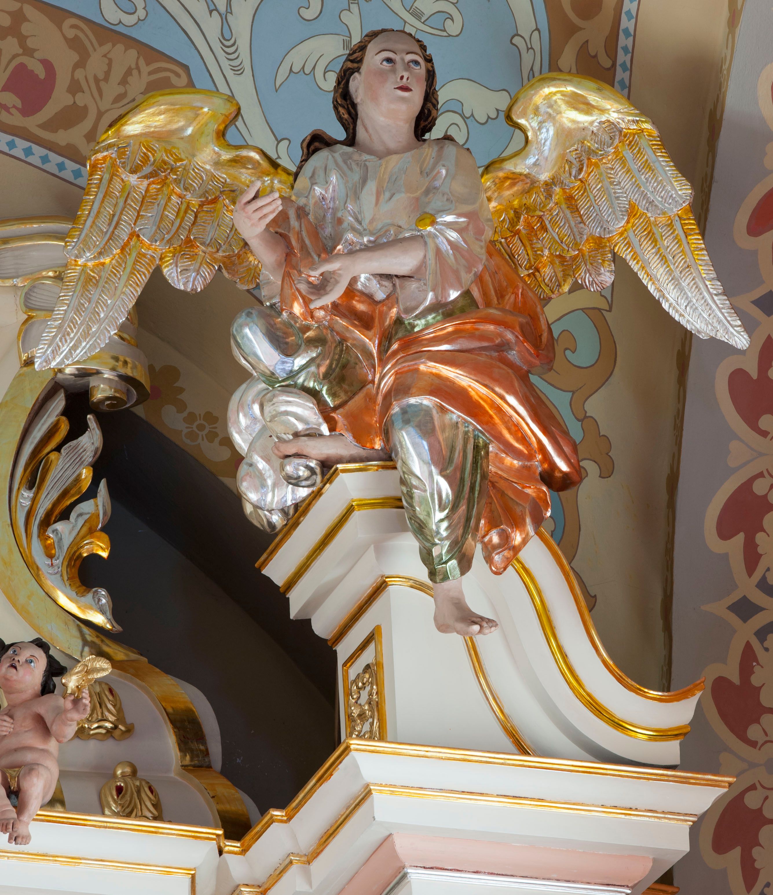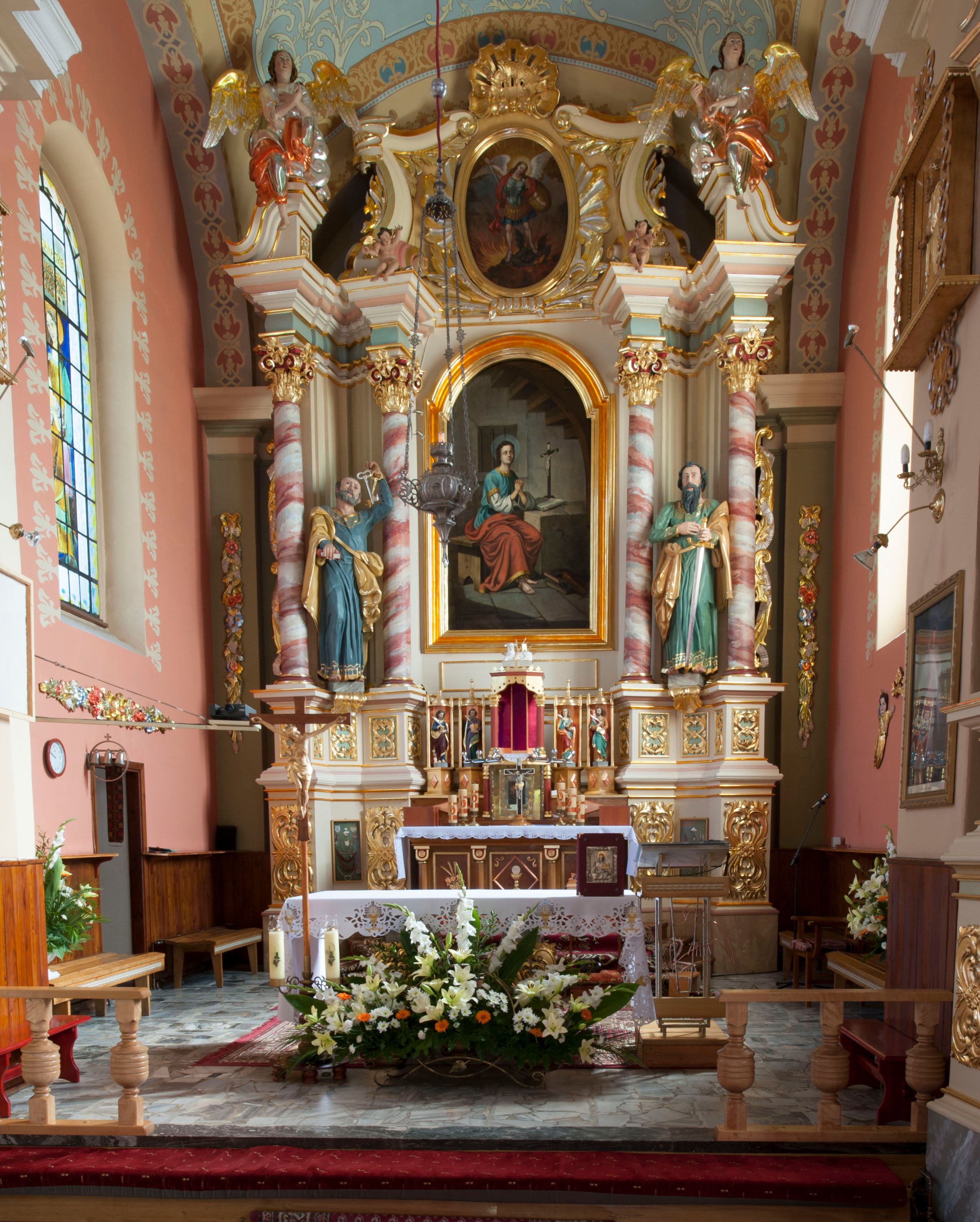 The first high altar was created in 1859. It comprised the image of St. Alexius with wooden mensa and ciborium - painted on the wall of church. The second altar - more typical, wooden and mural - was built in 1862-1863. It was burnt during winter in 1974. Therefore a provisional altar was set up, and construction of the new one - which is a reproduction of the former altar - was finished in 1979. In its form, it corresponds to side altars being created at the same time as the original altar was made and it is typical of Neo-Baroque art.