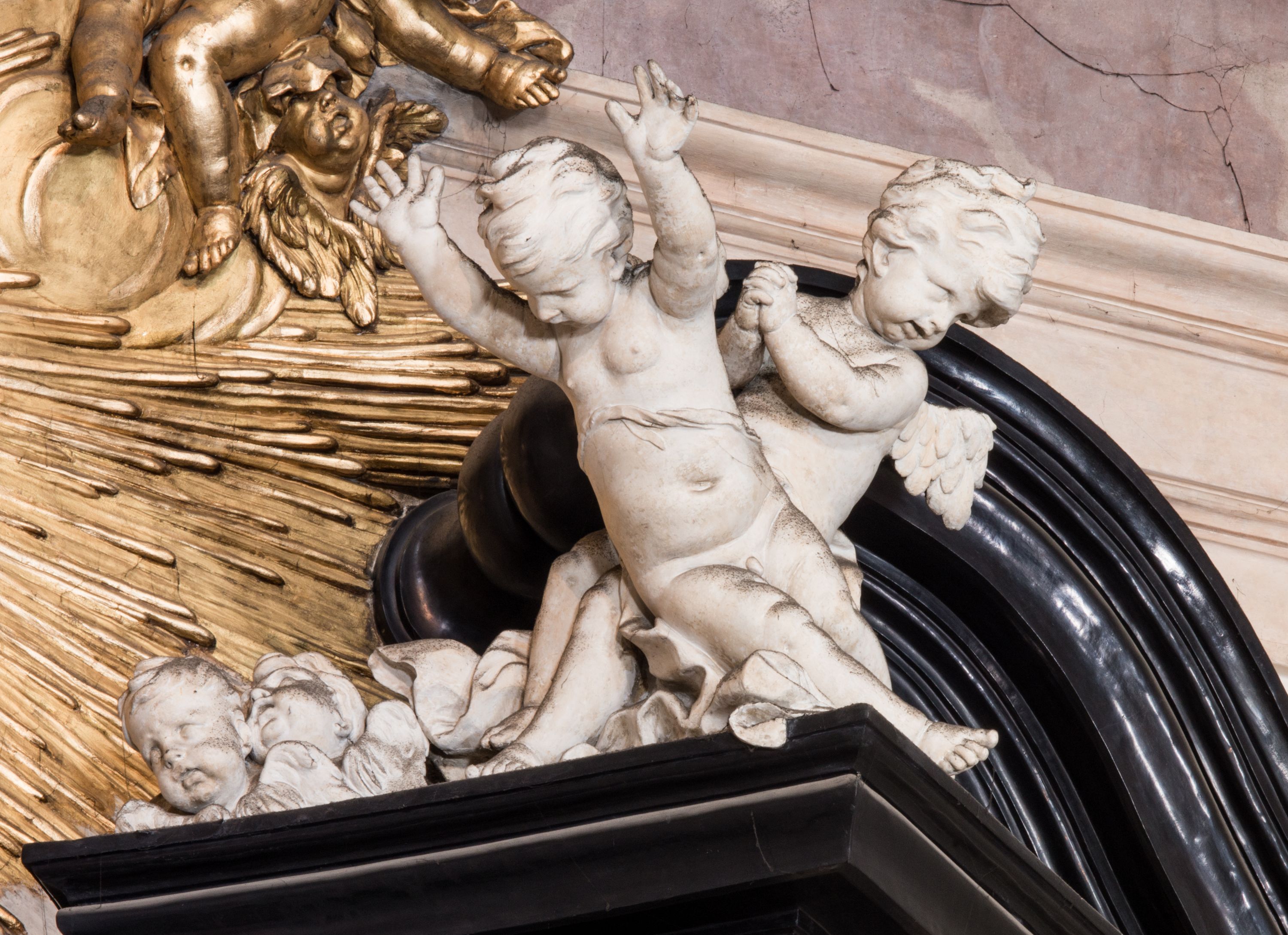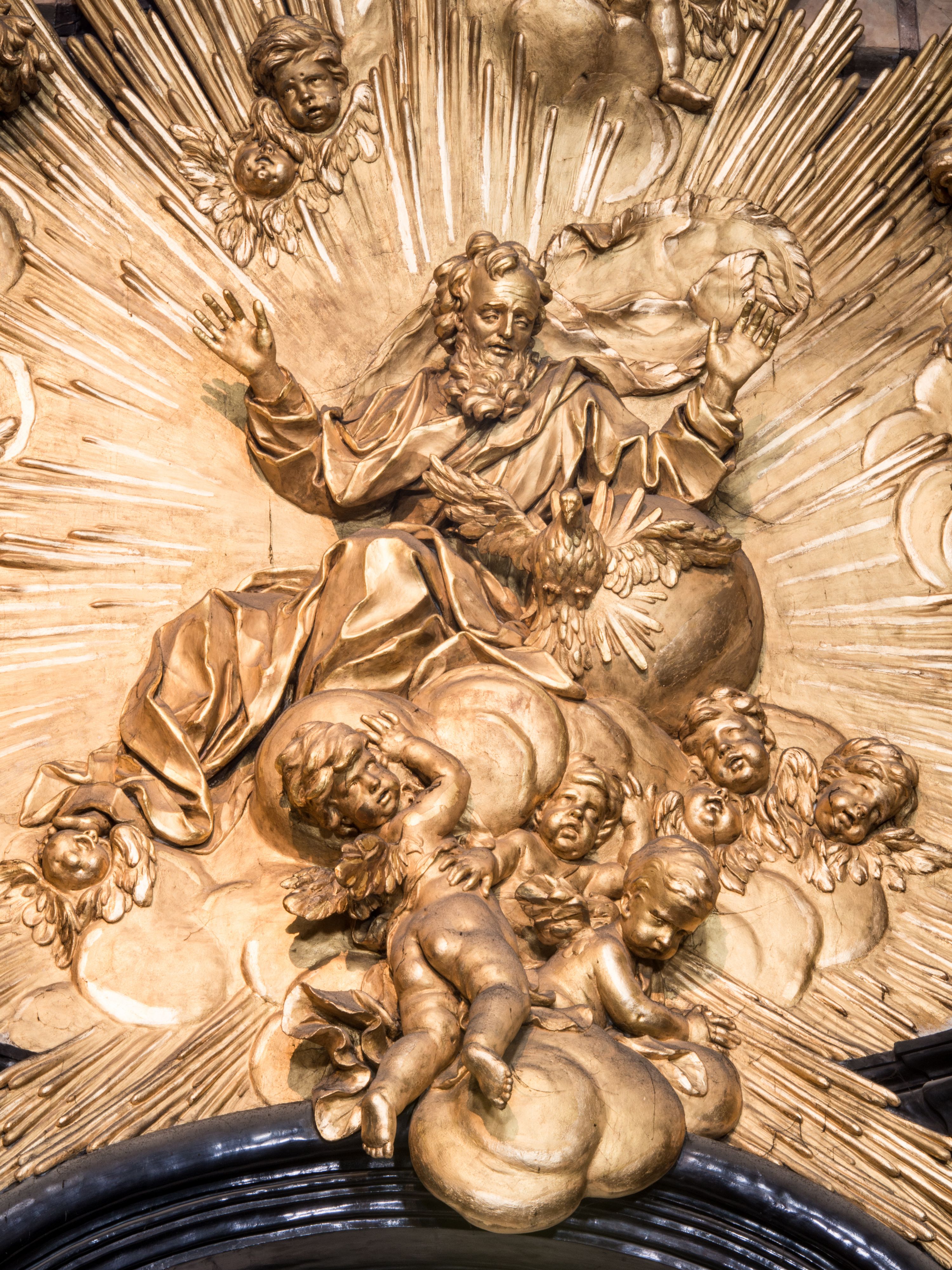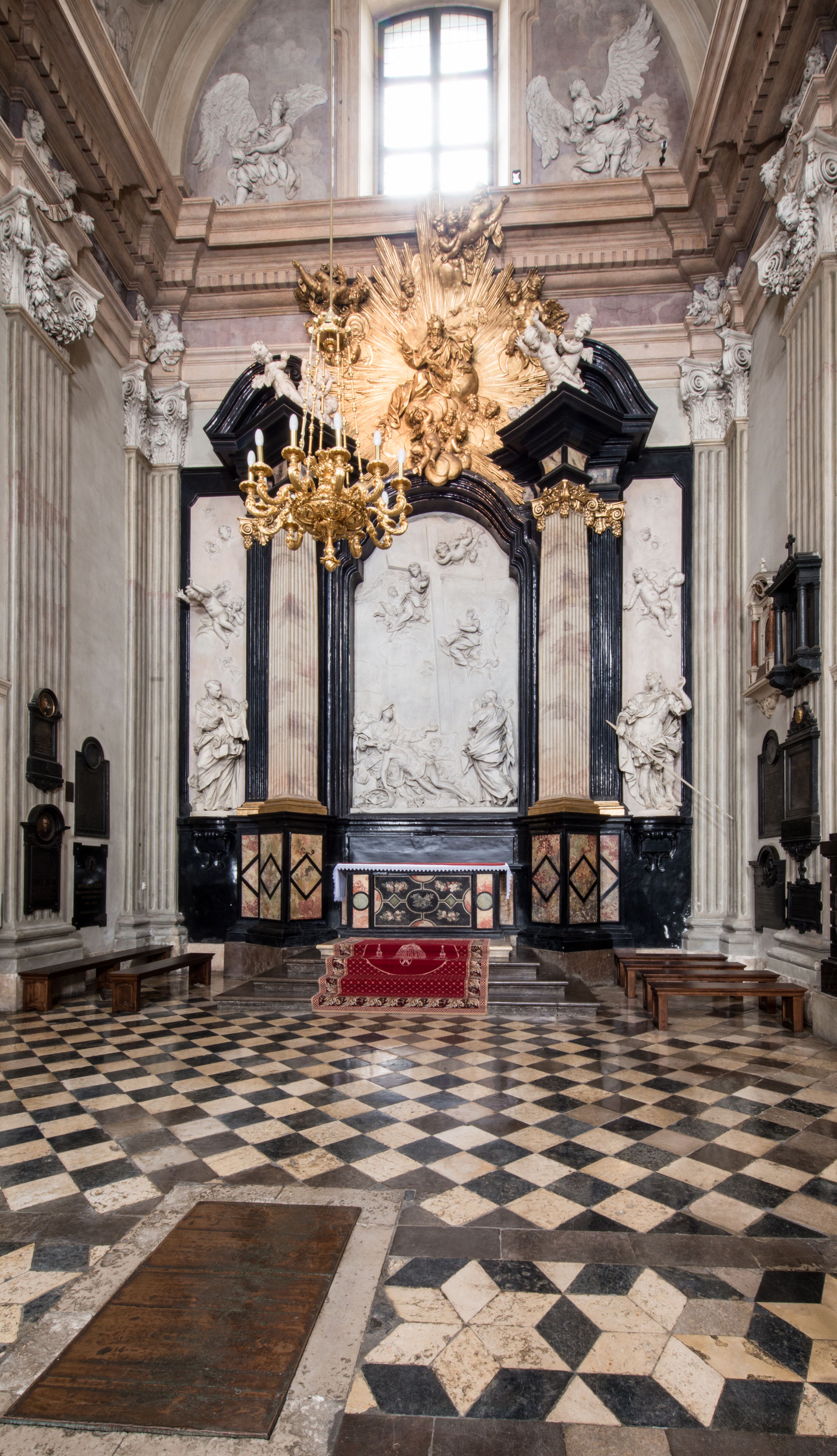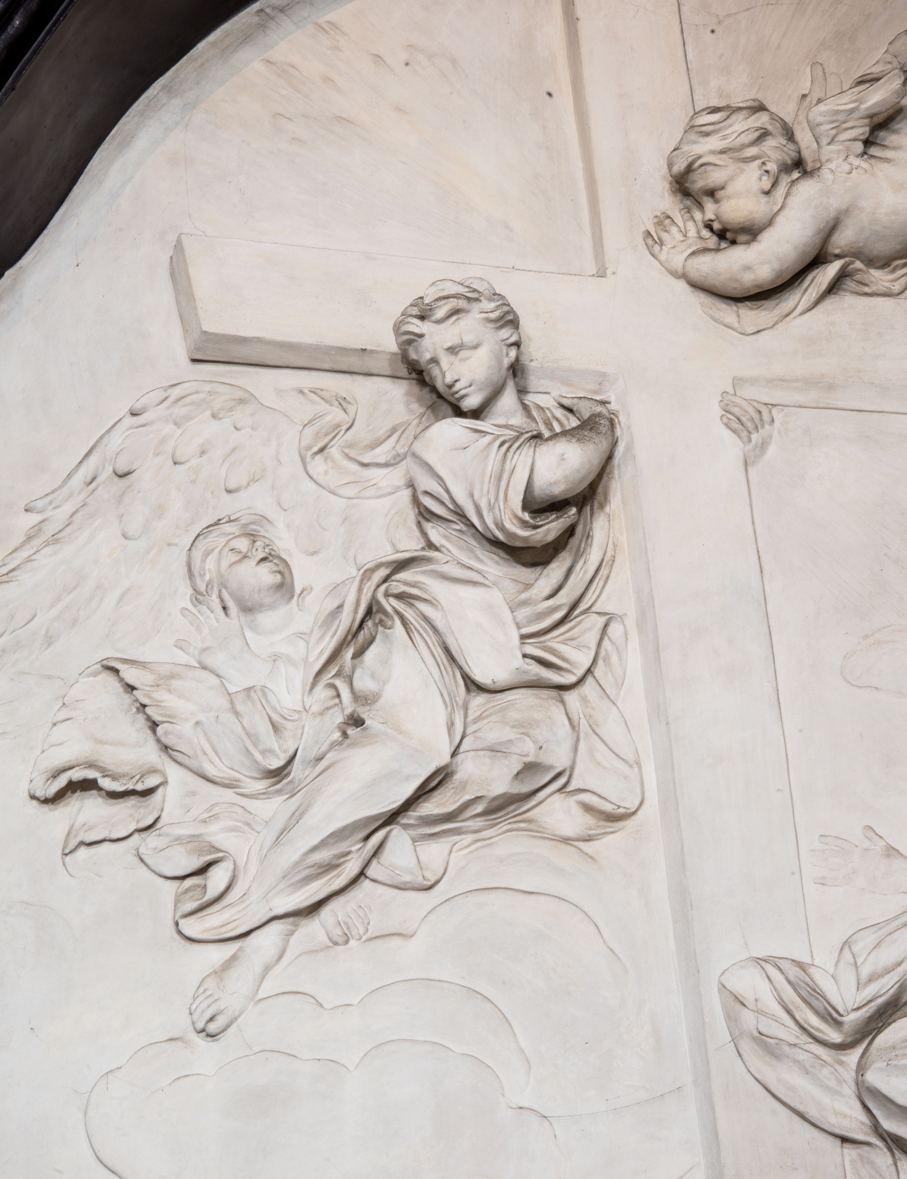 The Holy Cross altar (created in 1698–1703) is the work of a workshop managed by Baltazar Fontana. It is an example of the reception of Roman works by Giovanni Lorenzo Bernini in terms of the expressive treatment of drapery and imitation of Roman works. In the scene of the Glory of the Cross with Virgin Mary and deceased Christ lying on her lap and the cross raised by angels, the artist was inspired by Domenico Guidi's work – an altar in the chapel of the Palazzo del Monte di Pietà in Rome. Pietà itself evokes a painting of another Roman artist, the painter Annibale Carracci. The altar is one of the most outstanding Fontana's works and one of the most interesting examples of the reception of Roman sculpture in Poland.