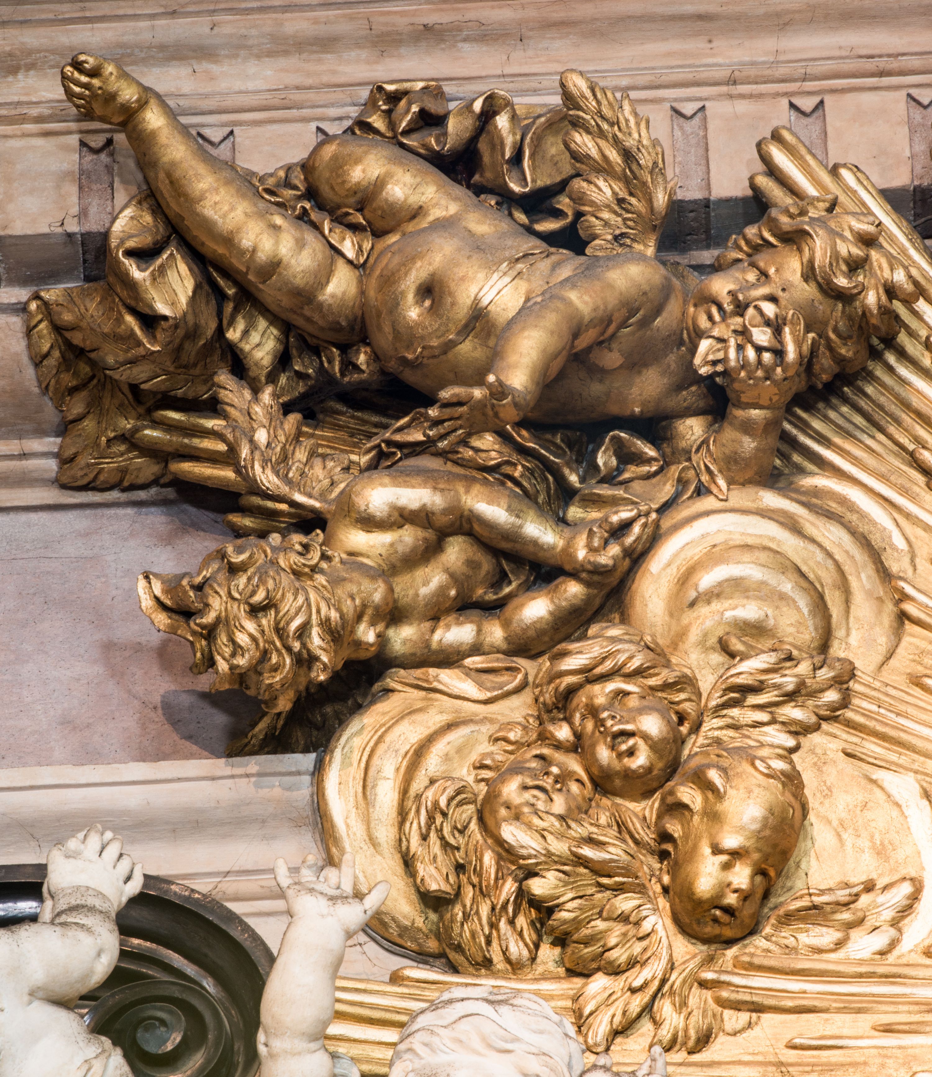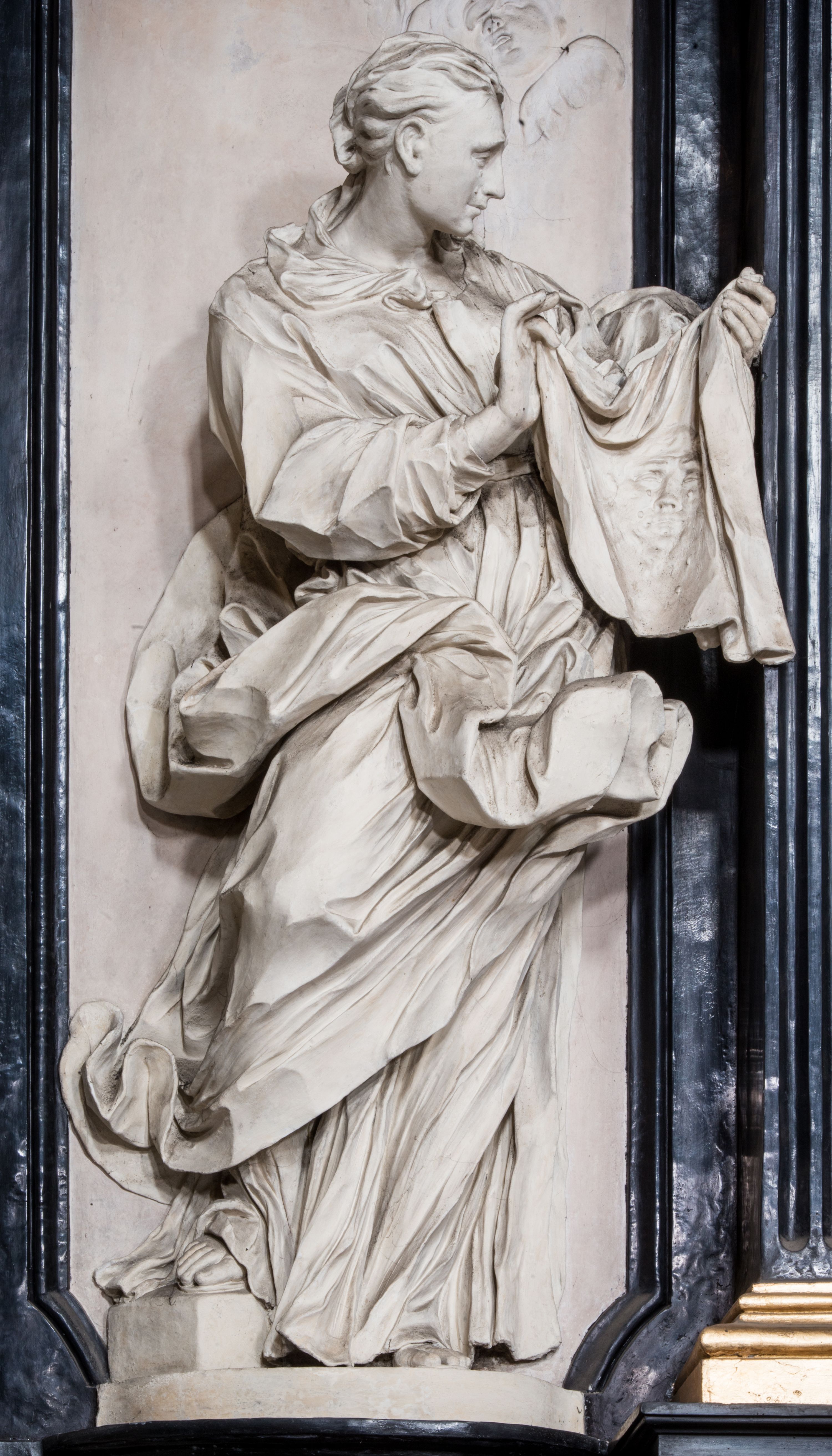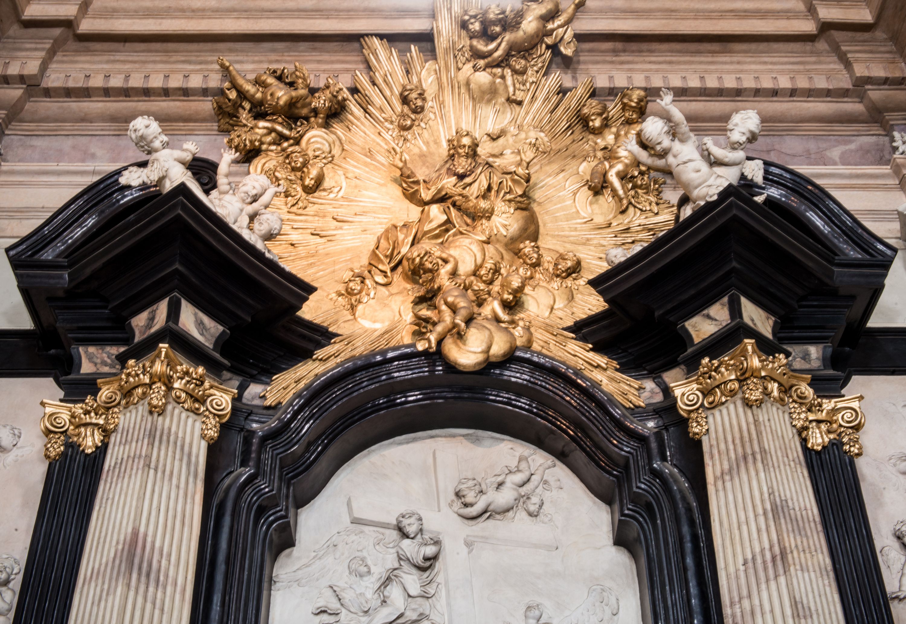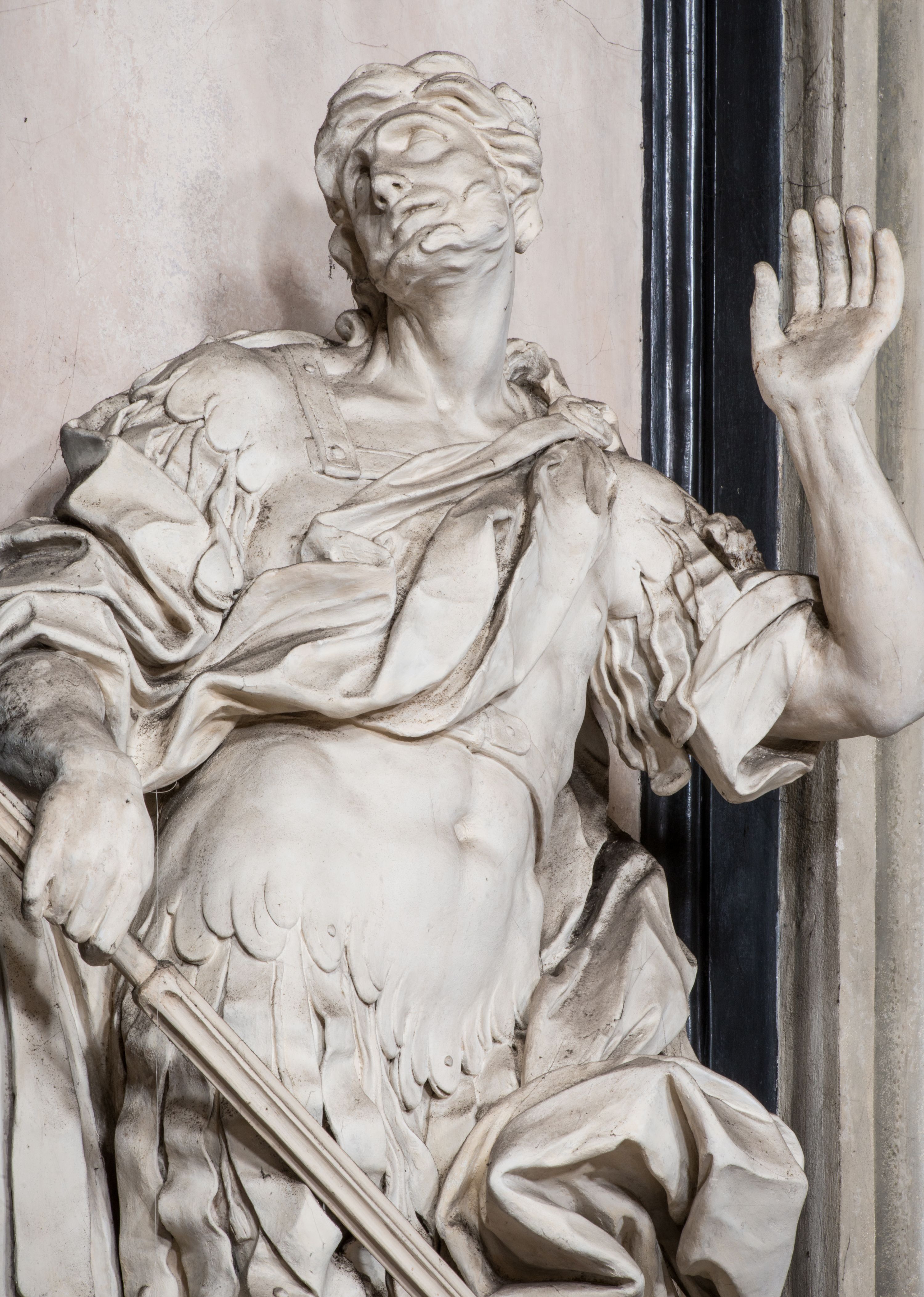 The Holy Cross altar (created in 1698–1703) is the work of a workshop managed by Baltazar Fontana. It is an example of the reception of Roman works by Giovanni Lorenzo Bernini in terms of the expressive treatment of drapery and imitation of Roman works. In the scene of the Glory of the Cross with Virgin Mary and deceased Christ lying on her lap and the cross raised by angels, the artist was inspired by Domenico Guidi's work – an altar in the chapel of the Palazzo del Monte di Pietà in Rome. Pietà itself evokes a painting of another Roman artist, the painter Annibale Carracci. The altar is one of the most outstanding Fontana's works and one of the most interesting examples of the reception of Roman sculpture in Poland.