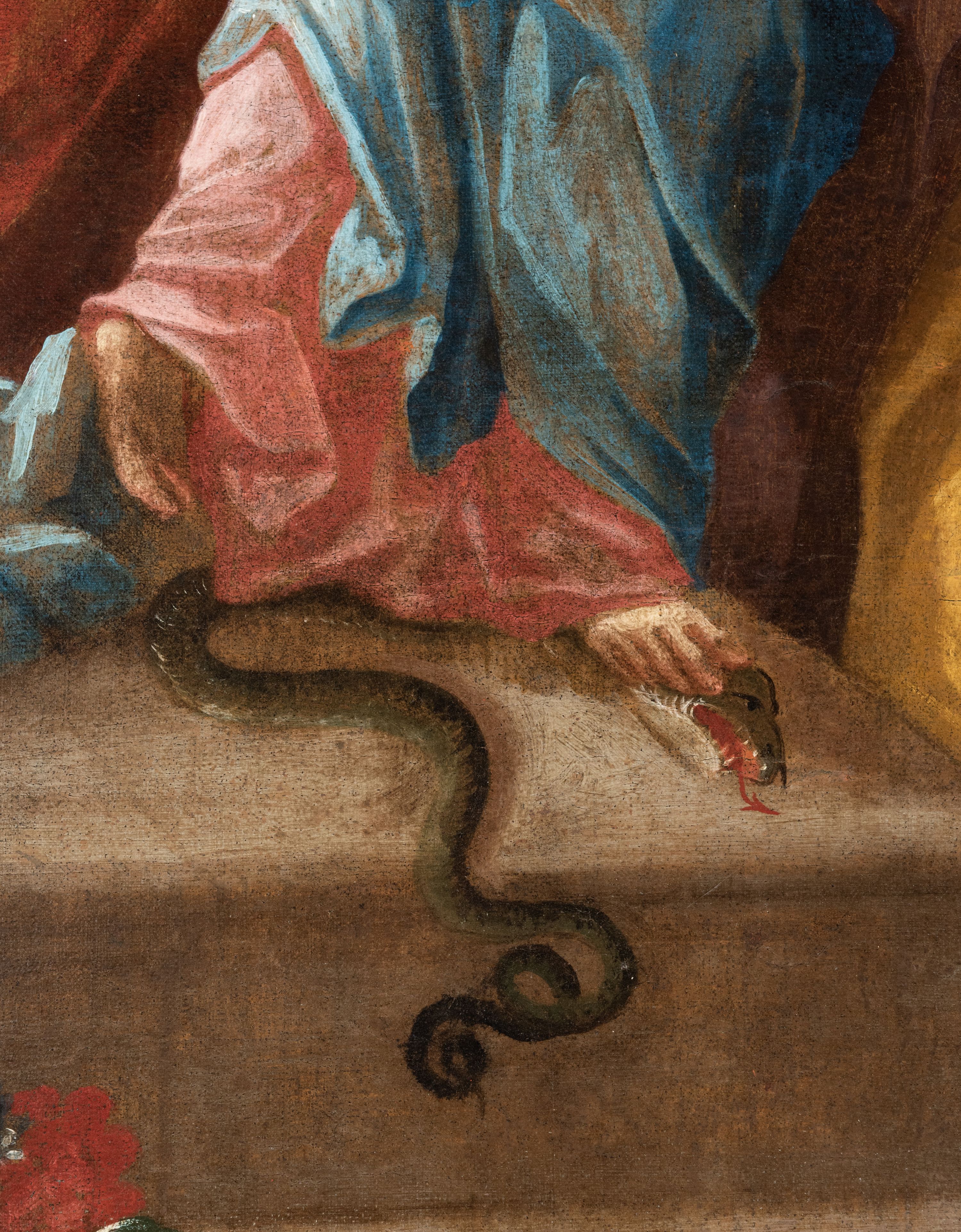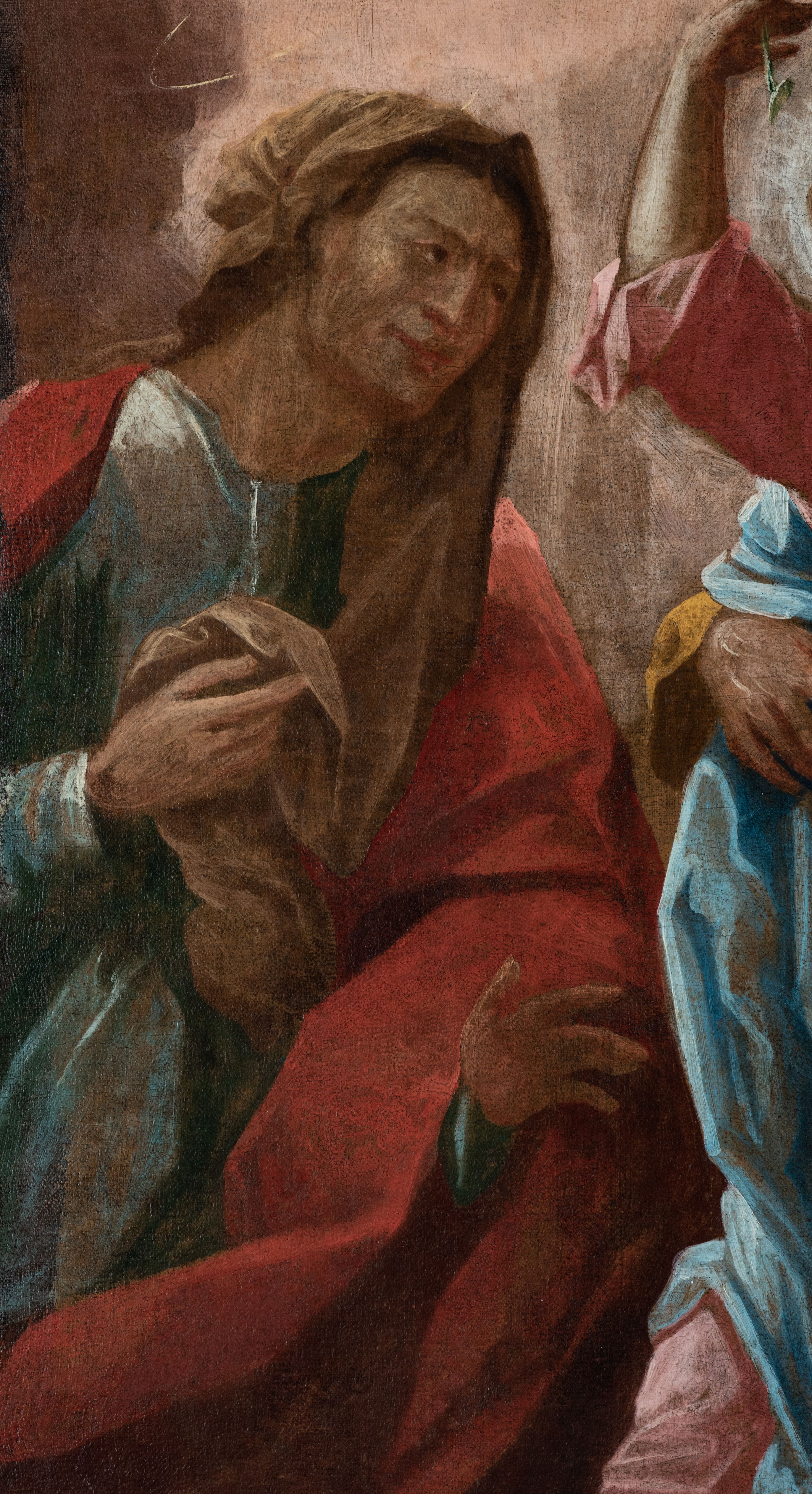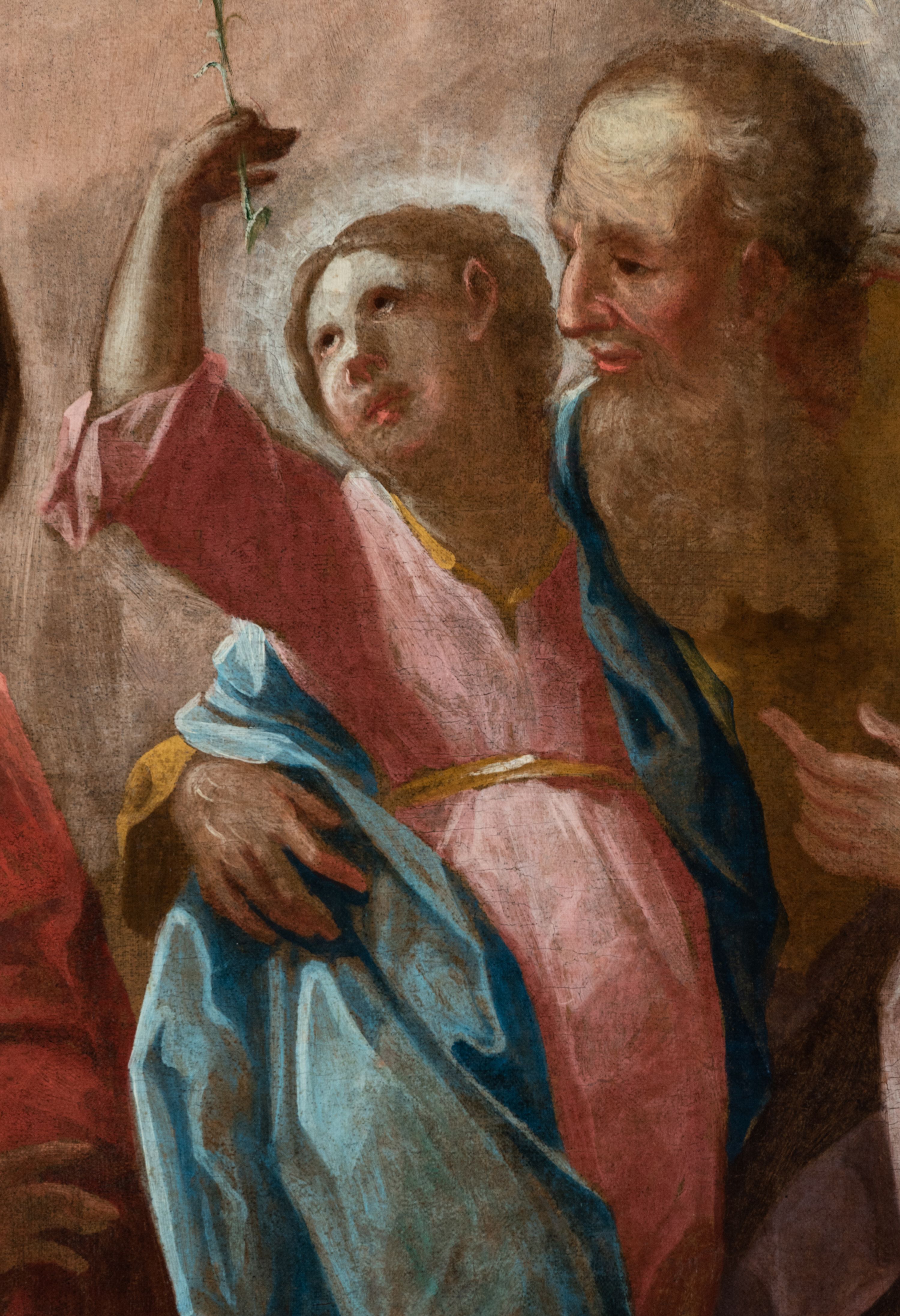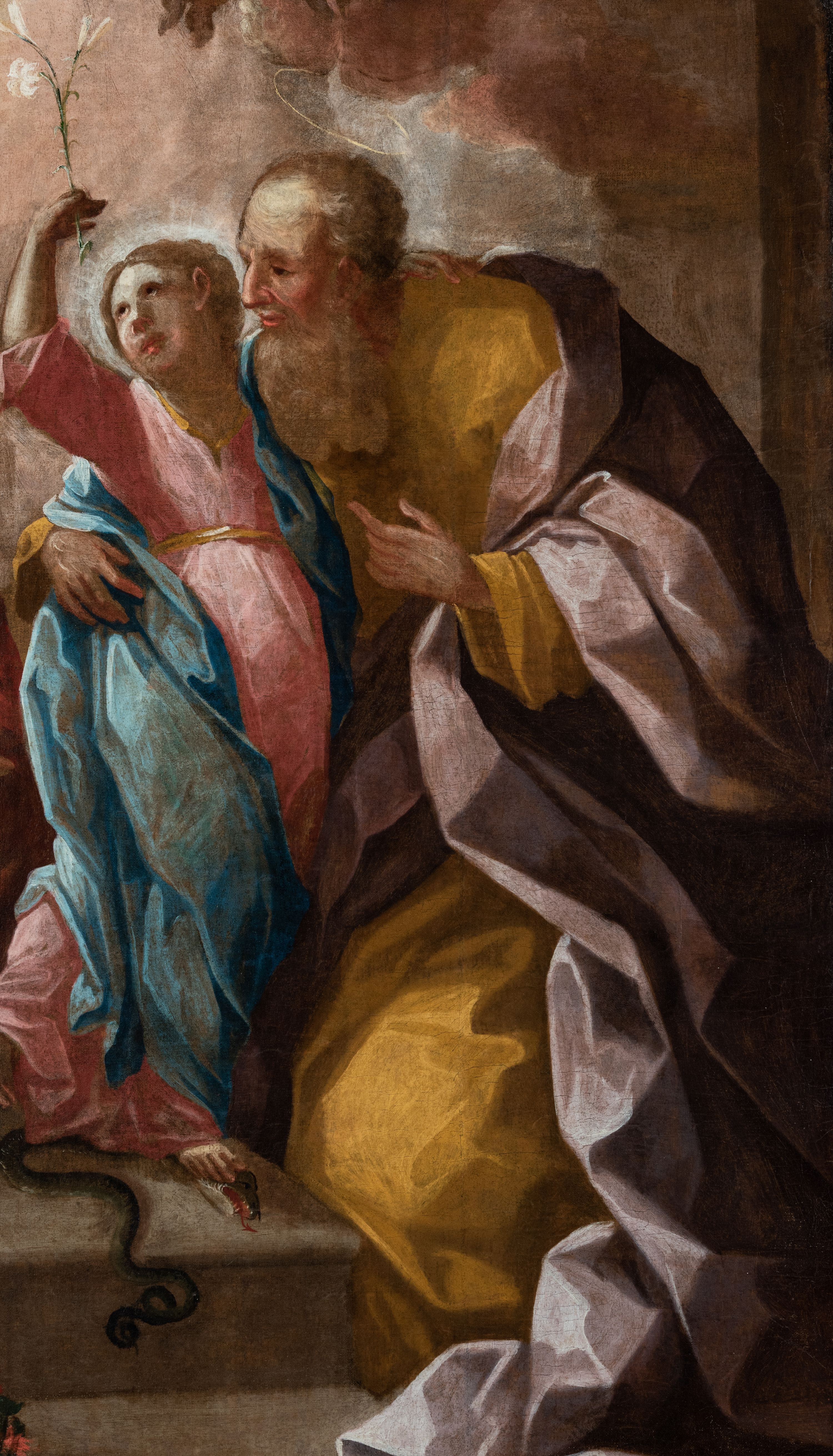 The altar of Saint Joachim and Saint Anne, together with the twin altar of Saint Joseph, was created at the beginning of the 18th century, before 1728. The title painting in the altar of Saint Joachim and Saint Anne presents a youthful Mary in the company of her parents, Anne and Joachim, i.e. an iconographic theme called the Holy Kinship. Unfortunately, the author is unknown. Although the painting appears to be contemporary in terms of form, the research carried out during the last restoration of the altar has shown that it was not originally intended for it. It was re-cropped and adapted to the dimensions of the hole in the altar in question. Mary was portrayed as a young girl equipped with the attributes of Our Lady of the Immaculate Conception. The snake at her feet refers to the words in the Book of Genesis announcing the coming of Christ: "And I will put enmity between you and the woman, and between your offspring and hers; he will crush your head, and you will strike his heel" (Gen 3:15).