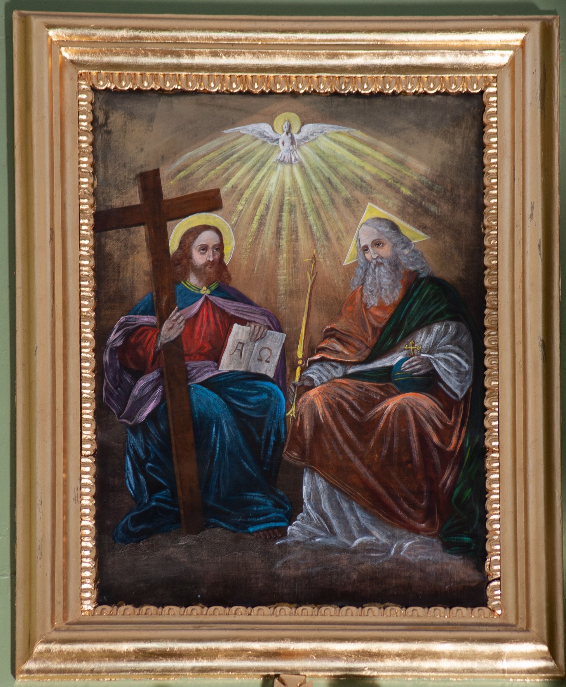 The history of the painting in question and the altar where it is placed remain unknown. The work may have been created at the end of the 19th century. Its author remains unknown. The Holy Trinity is depicted in the traditional iconographic type in which God the Father is showed as an old man with a triangular halo, Christ as a young man with a cross in his hand, visible wounds and an open book with letters "A" and "Ω", and the Holy Spirit as a dove hovering over them.
