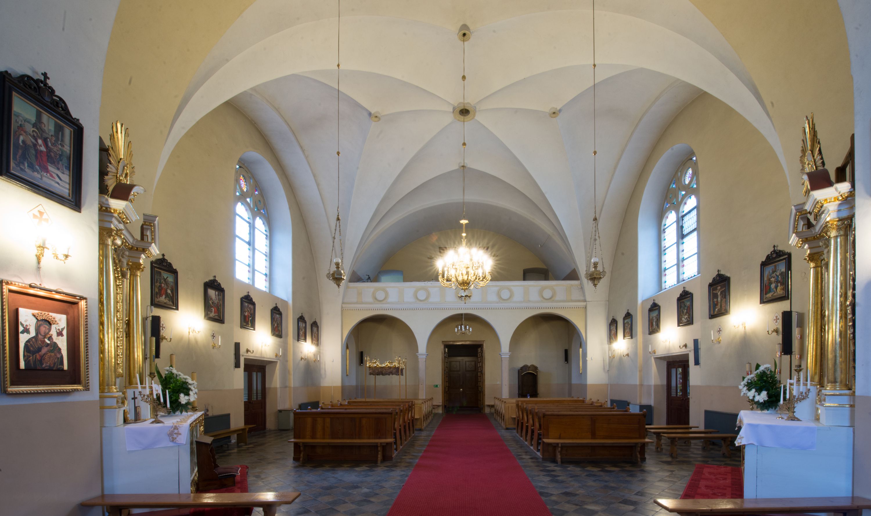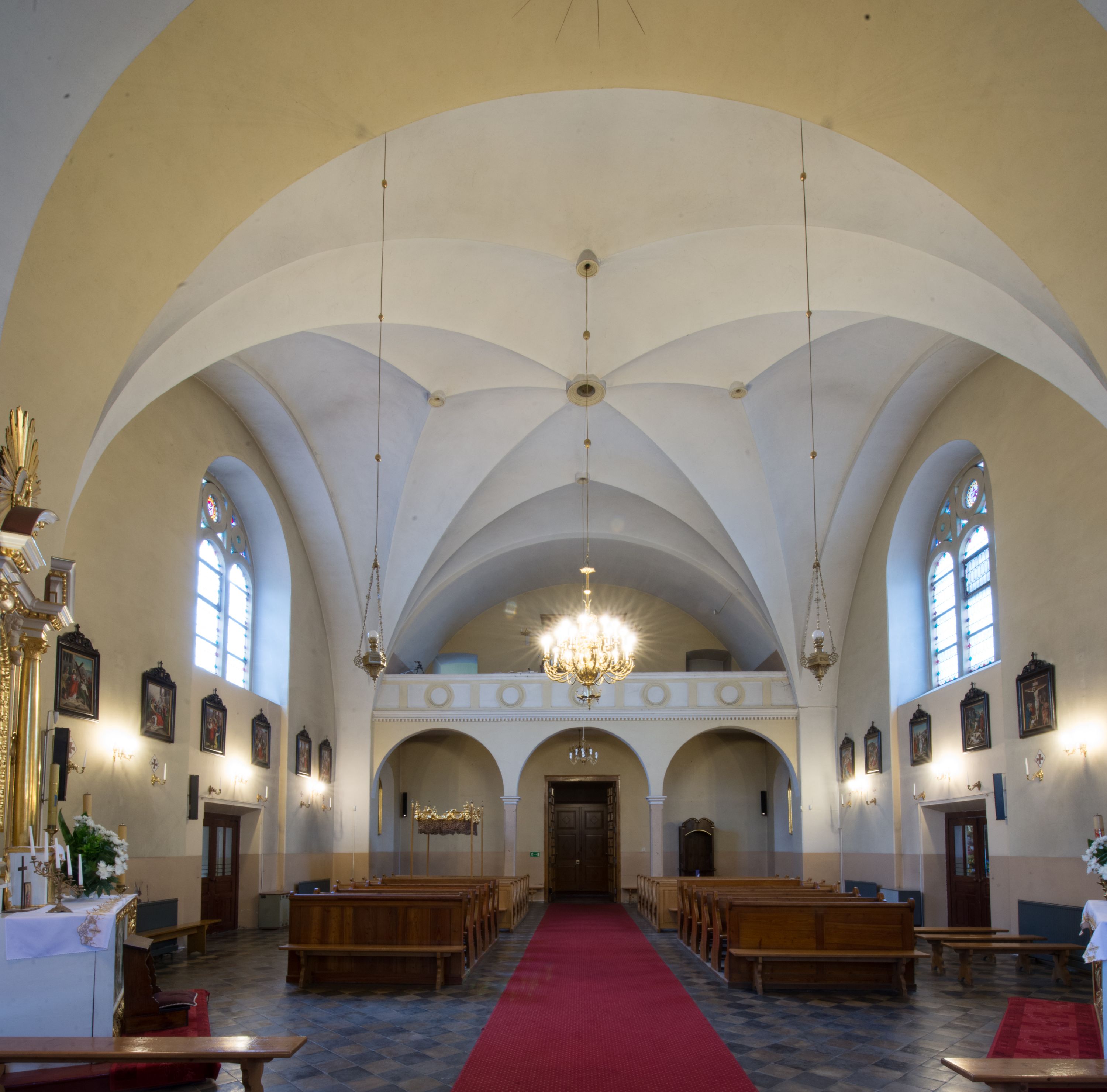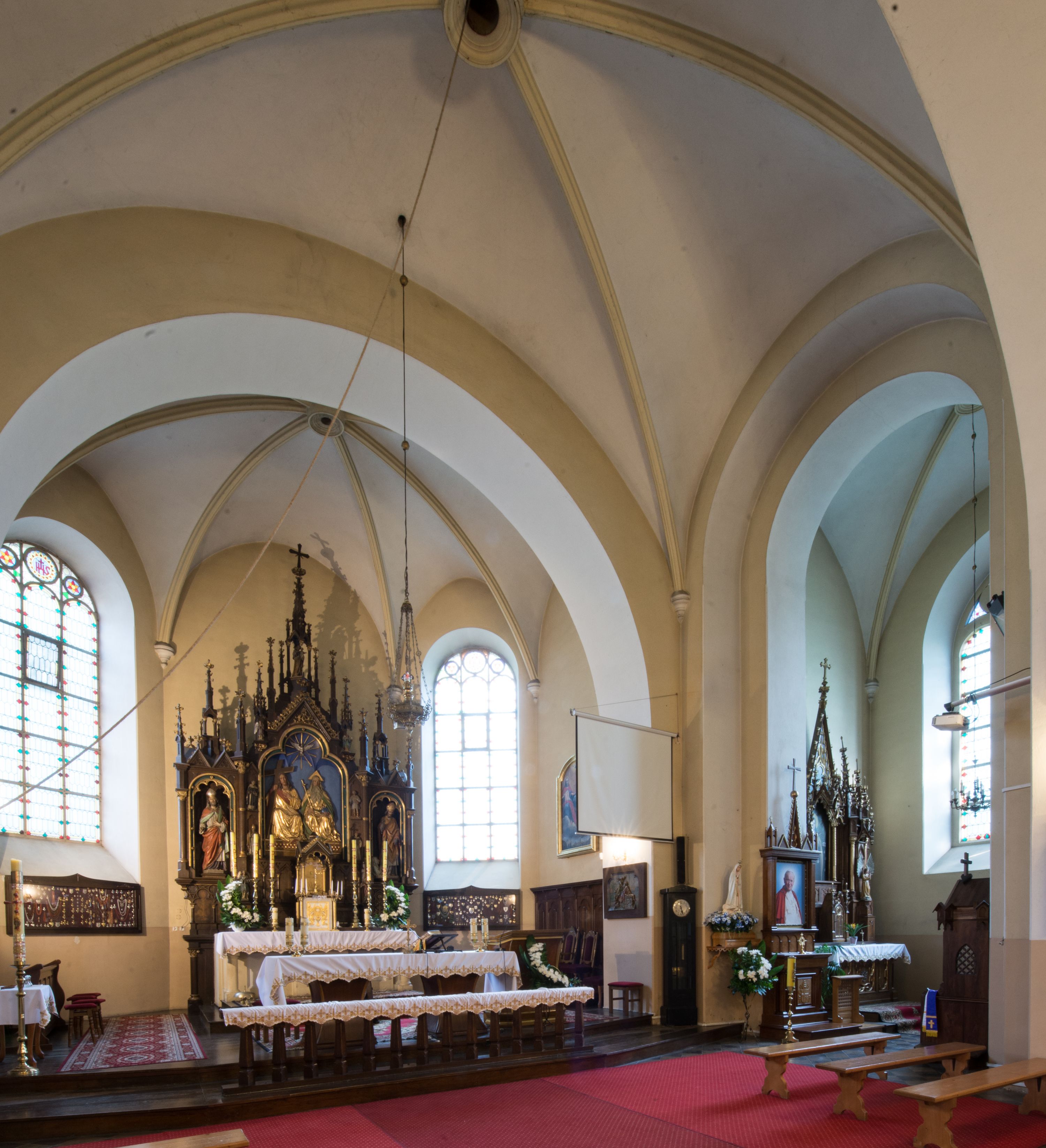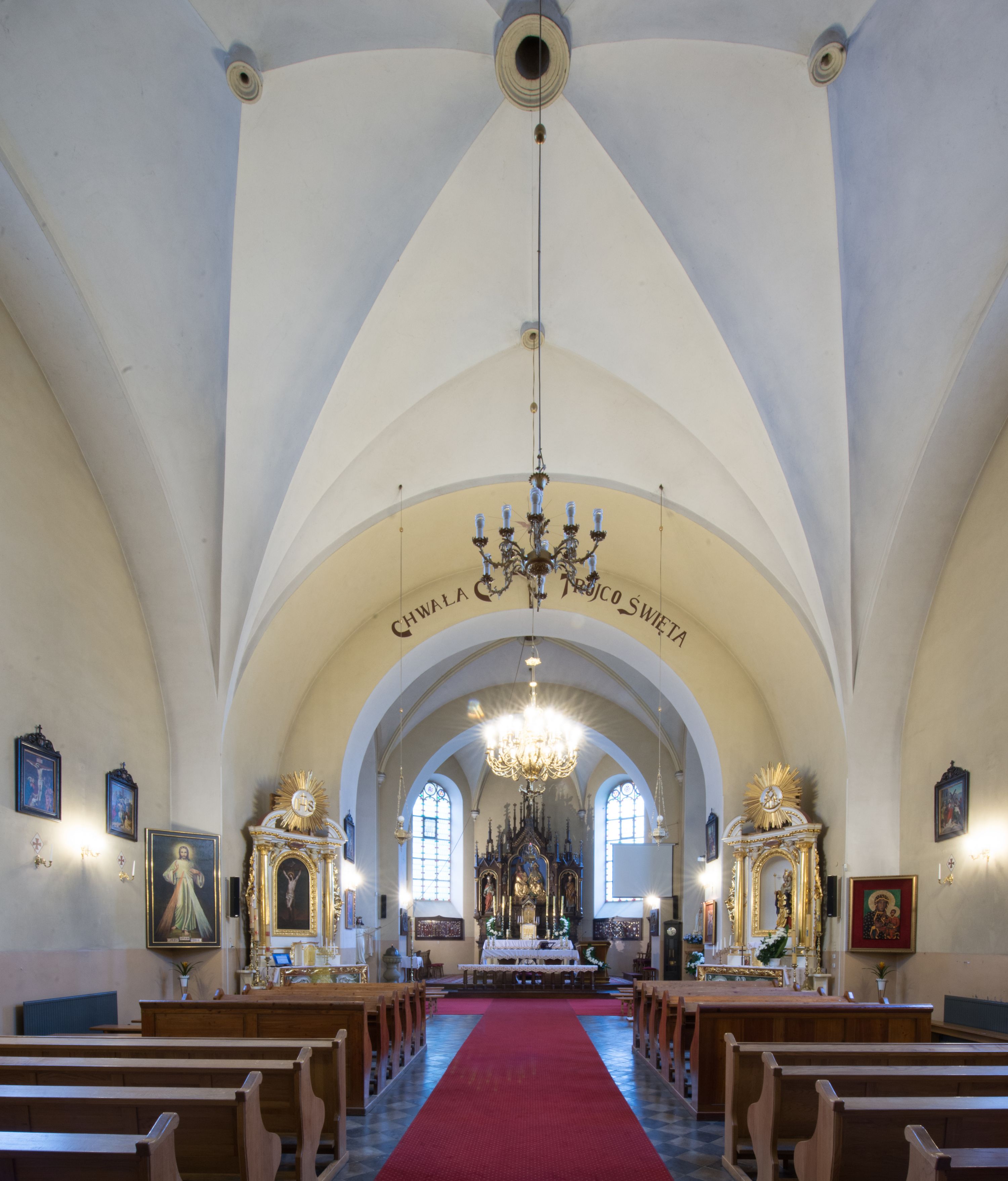 As the number of churchgoers began to outgrow the size of the old temple in Krzywaczka, the cornerstone for a new church was laid on June 27, 1911 and the construction of a new neo-gothic temple designed by Stefal Muller commenced. The new temple was built in the place of the old, wooden church. In 1924, the temple was consecrated by bishop Anatol Nowak. In the 1970s, the church interior was repainted white, thus covering the polychrome which had been created right after the church was built. The historical pulpit was also taken down. In 2006, the temple's leaking roof was replaced after 95 years, and documents related to the life of the parish were placed in one of the spheres crowning the roof. The high altar of the church in Krzywaczka was created in Władysław Druciak's sculpture workshop in 1914. The artist signed a contract with the then parish priest, Józef Nowak, in 1913. The Madonna of Częstochowa painting on the sliding panel was created by the painter Szczurowski, and altar works were finished by Józef Małek, a goldsmith. The altar was created in the Neo-Gothic style, reflecting medieval– gothic models and replicating old forms and ornaments, creating a new whole. The triaxial altar combines elements which are typical for Gothic architecture, such as openwork turrets crowned with pinnacles, fleuron ornaments and crockets, pointed arches, gables or traceries. Druciak's creative oeuvre is referred to as an example of historism in sacral sculpture from the beginning of the 20th century. The central niche of the altar in Krzywaczka houses a relief of the Holy Trinity, which is a direct reference to the invocation of the parish, whereas the smaller niches showcase the statues of St. Isidore, St. Ambrose and St. Dominic. The larger niches are devoted to the Polish patrons: St. Stanislaus and St. Adalbert, whereas the altar finial features a statue of Joseph with Infant Jesus. Placed in the side chapel, the neo-gothic altar was also created in the first quarter of the 20th century. A painting of St. Therese of Lisieux is placed in the central area. Apart from the main one, the temple boasts two other altars. One of them features an extremely valuable sculpture of the Madonna and the Child, which was created in the 1420s or 1430s. The statue was created in the region of Lesser Poland, which was proved in old literature and subsequently confirmed in contemporary references, where it was related to the sculpture from Jarząbka Nowa from ca. 1440, which was classified by Henryk Mędrek as an example of the so-called Pilsen type, as well as to the statue from Janowice. Information obtained during the monument's last conservation was used to restore the original appearance of the sculpture which has undergone multiple transformations throughout the ages, particularly in terms of form. Visiting the temple in Krzywaczka, make sure to marvel its Rococo procession ciborium which is one of few existing examples of this branch of artistic craft, which, made of perishable materials, failed to survive until the present day. The ciborium was created in the third quarter of the 18th century. The piece is a characteristic combination of abundantly sculpted, openwork frame decorated with Rocaille elements, with a material Intrados and suspended sides. The ciborium in Krzywaczka is additionally ornamented in the corners with four flaming vases which magnify the expression of the piece.