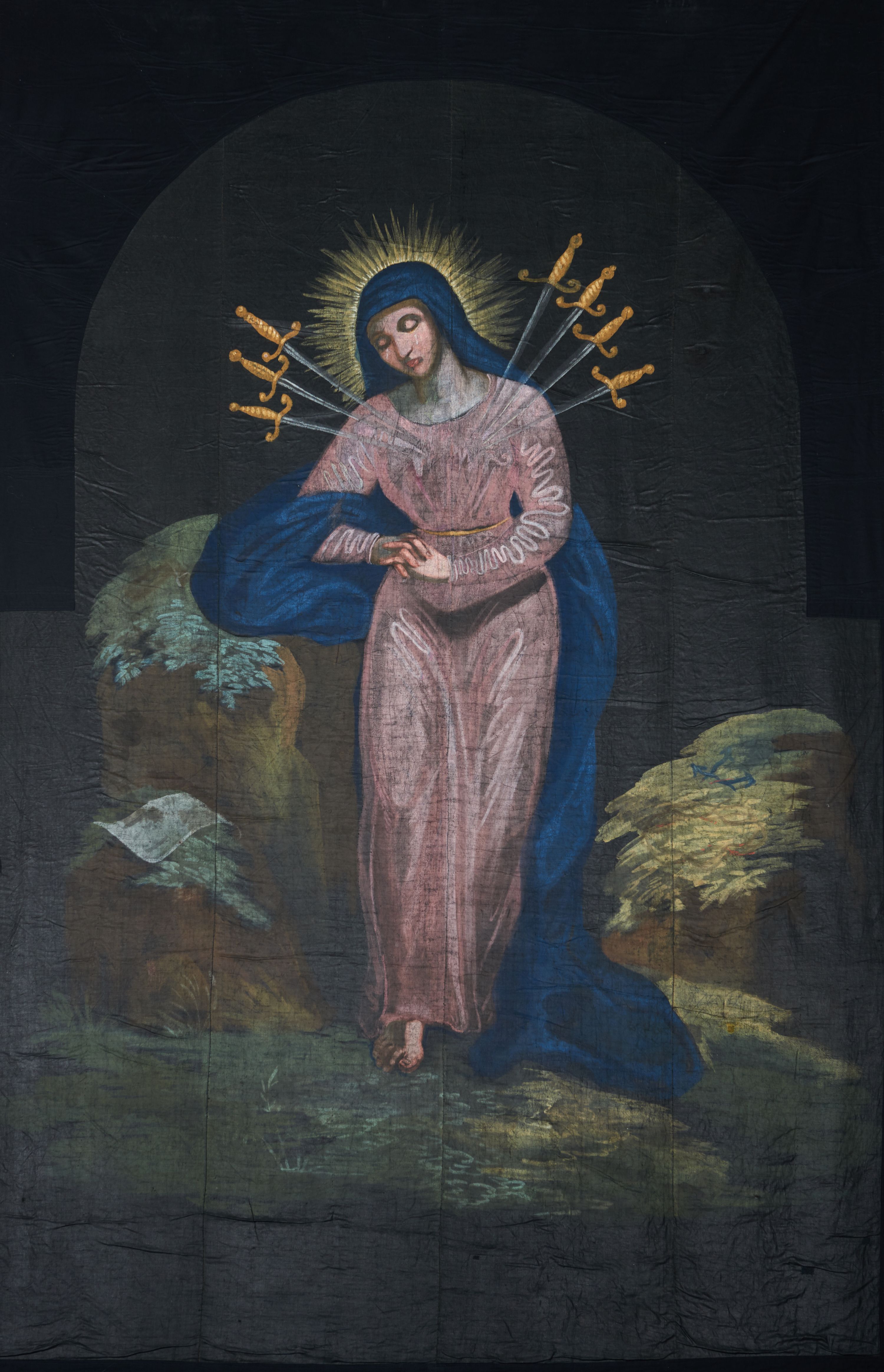 Lenten cloth with the representation of Our Lady of Sorrows was made in the 18th century and it is one of the types of Lenten veil (Einszeniger Typ). It constitutes a coherent set with clothes illustrating: the Flagellation of Christ and St. Mary Magdalene. The image is an illustration of a fragment of the Gospel of St. Luke, in which the old man Simeon prophesied to Mary that her soul would be pierced by the sword of sorrows.