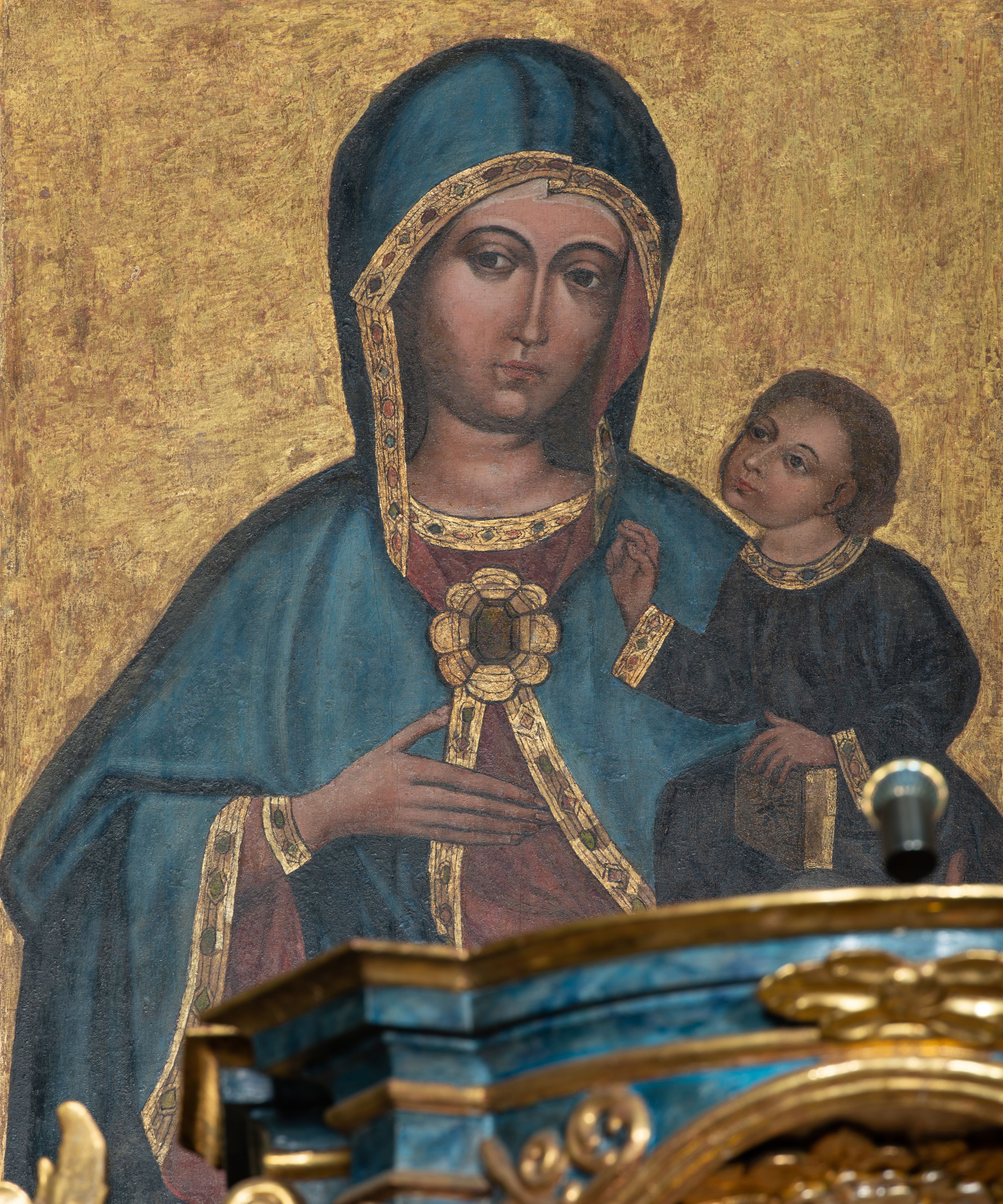 The image of the Mother of God in the high altar of the church in Lachowice is a copy of the miraculous image in the church in nearby Rychwałd, which imitates the medieval type of the Madonna of Doudleby, known in Poland as Madonna of Piekary. It represents the iconographic type of the oldest cult of the Mary's image called Hodegetria.