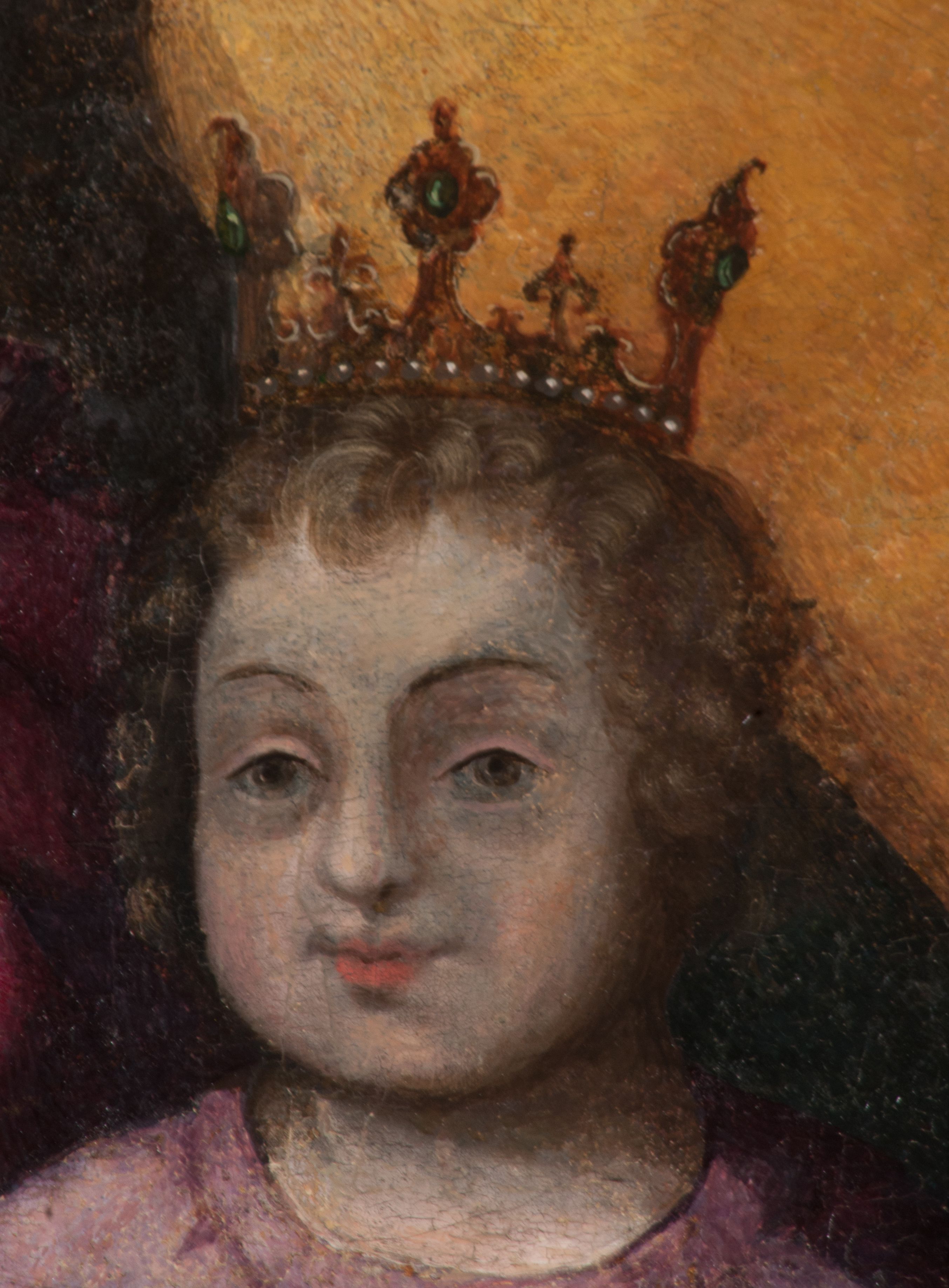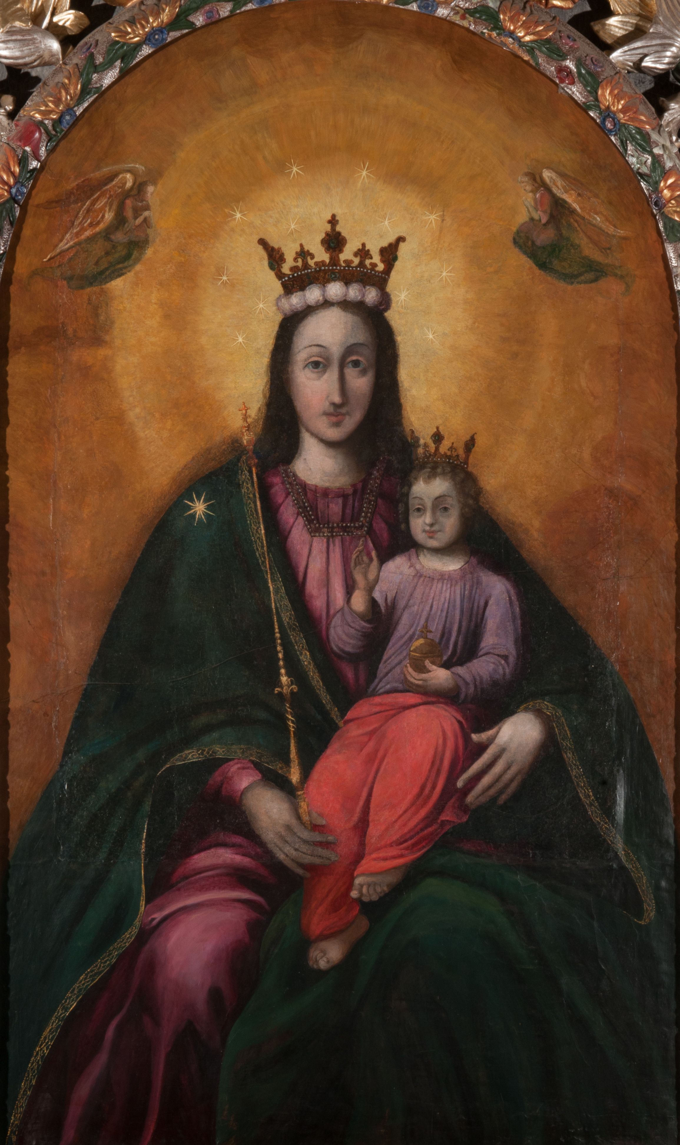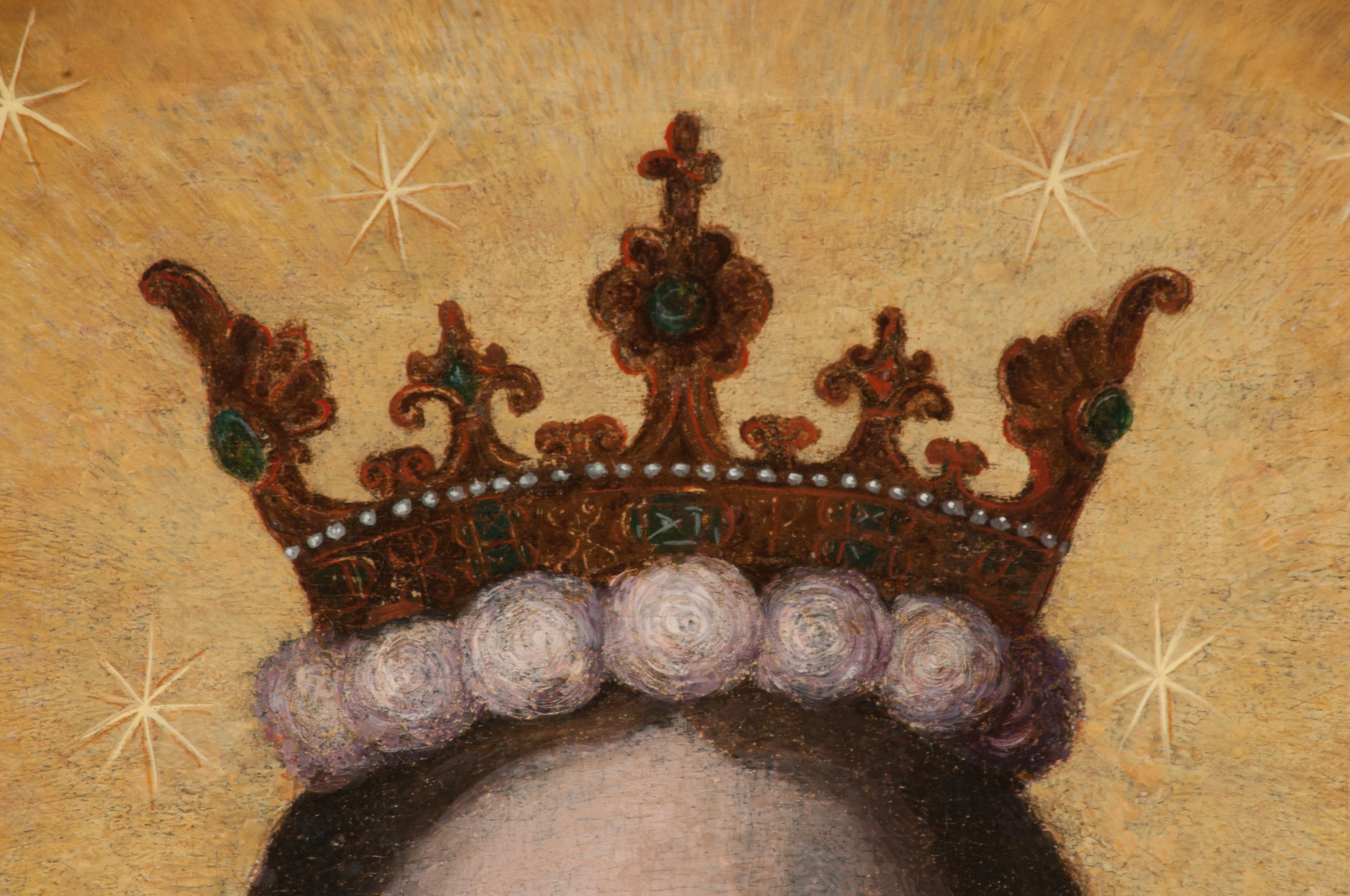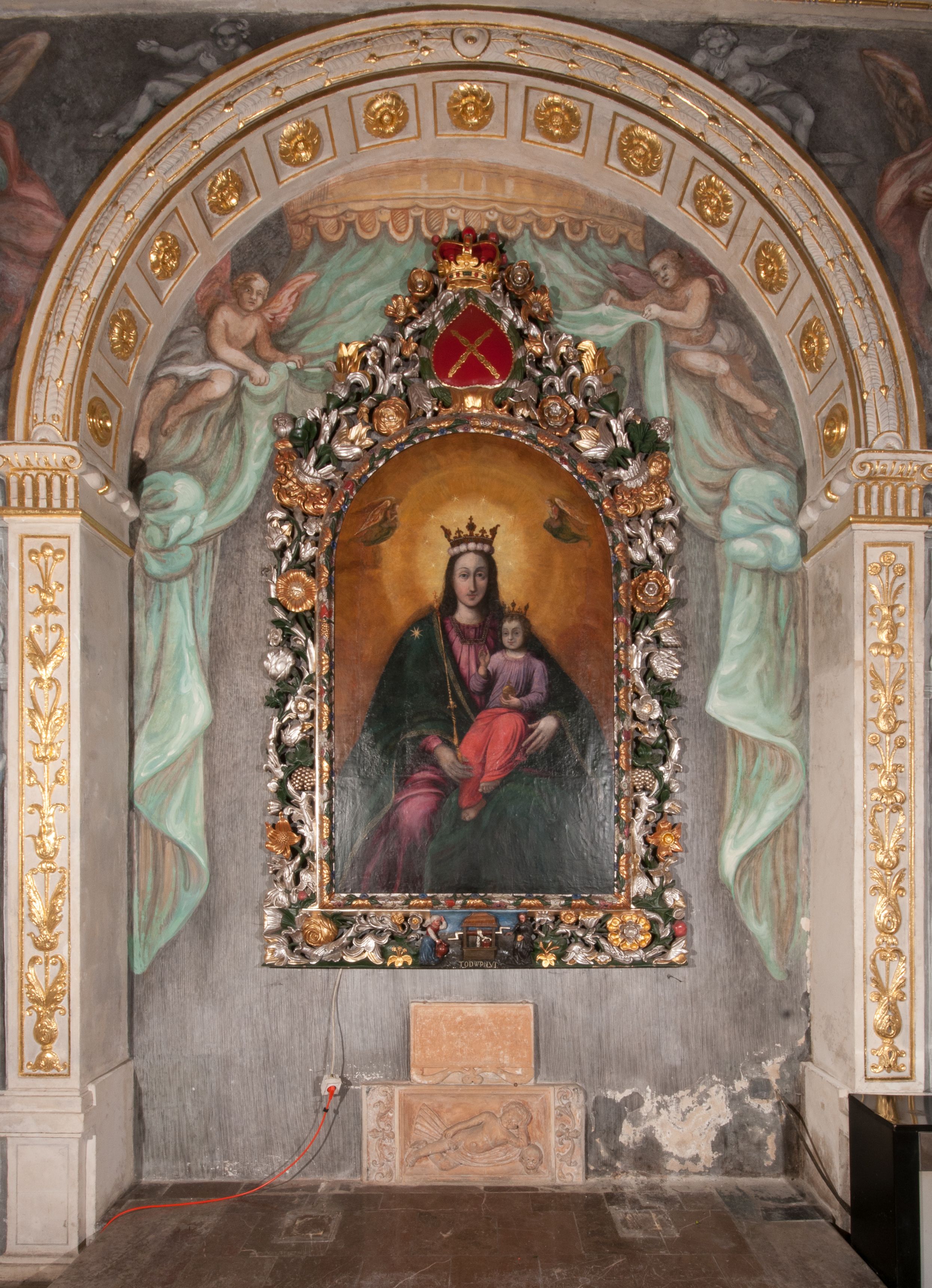 The painting of Madonna and the Child was probably created in the 17th century. Originally, it was much smaller in size (later a large part of the canvas was added and painted). In the 18th century, it was placed into the altar, and after 1964 it was set back to an ornamental frame. Perhaps it was funded by Jan Klemens Branicki (died in 1673). Madonna and the Child is depicted as the Queen of Heaven, as evidenced by attributes such as the crown on her head and the sceptre in her hand or the orb held by the Child.