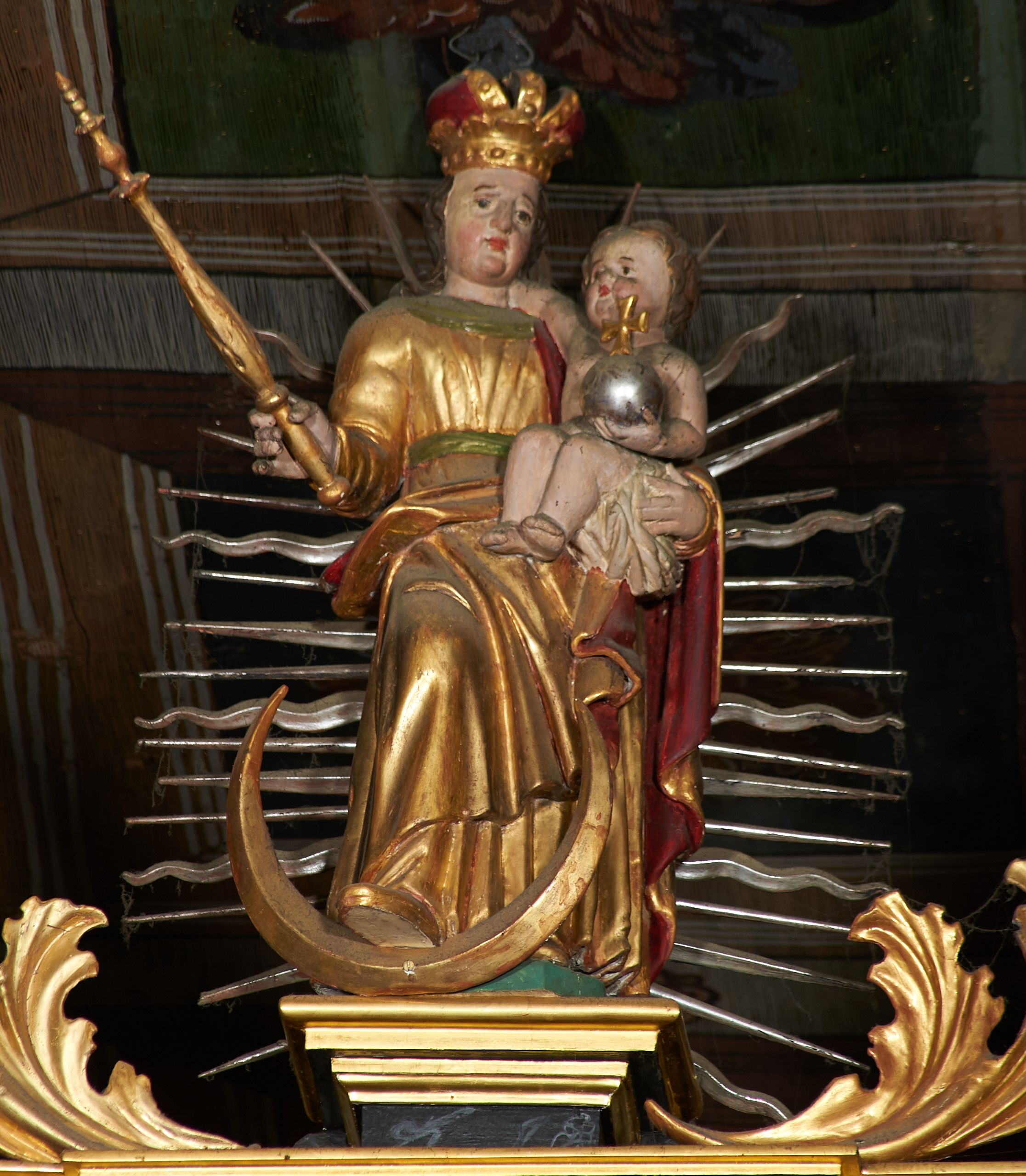 The sculpture "Madonna and the Child" has formal features similar to the 17th-century works. Unfortunately, its author is unknown. It depicts the Virgin Mary in a traditional iconographic convention, i.e. in the type of the Immaculata with a crescent under her feet.