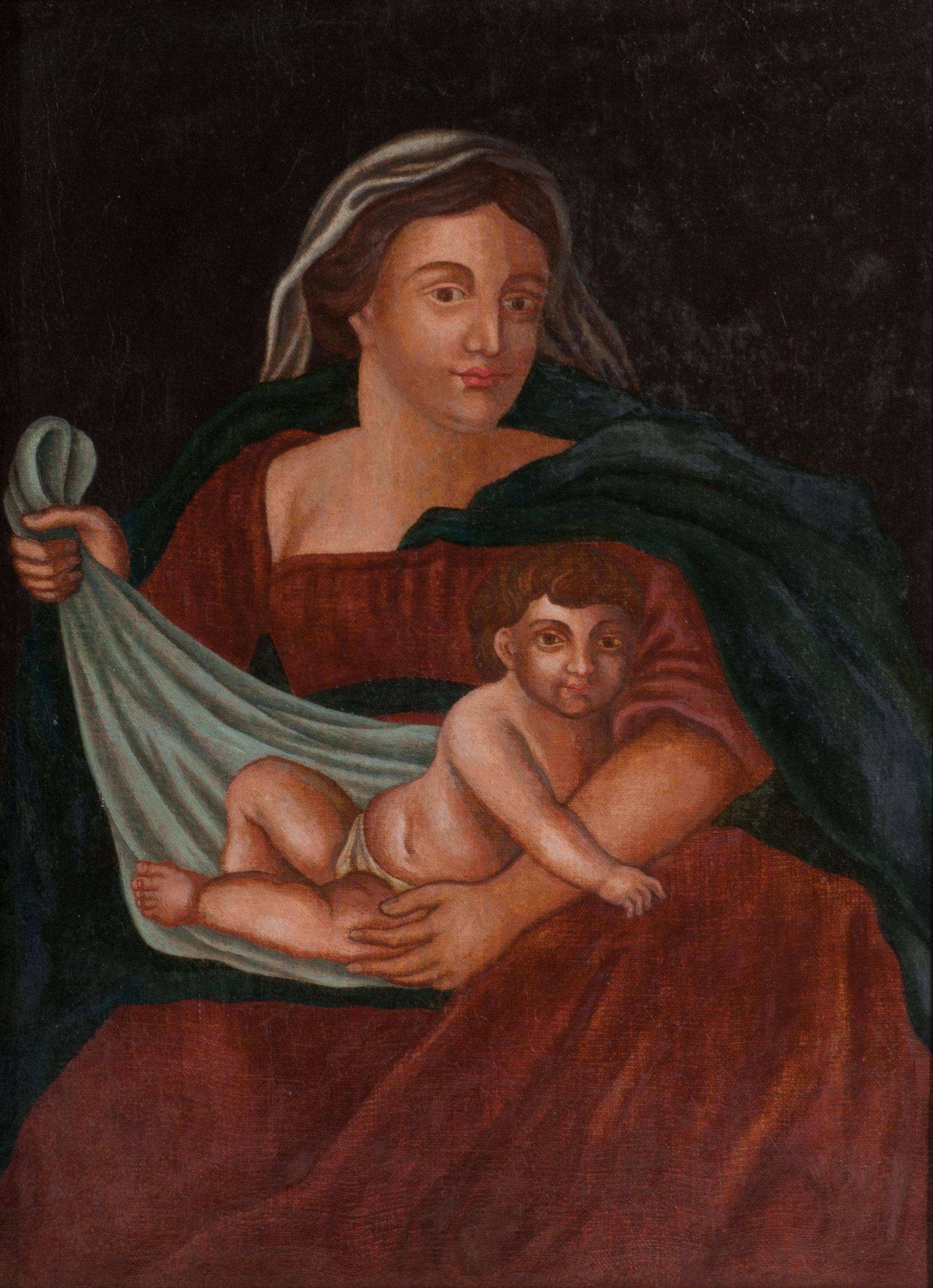 The painting of Madonna and the Child was made in the second half of the 19th century or in the first half of the 20th century. The work belongs to folklore. It depicts a tender relationship of mother and child, strongly emphasising the aspect of the Virgin Mary's motherhood.