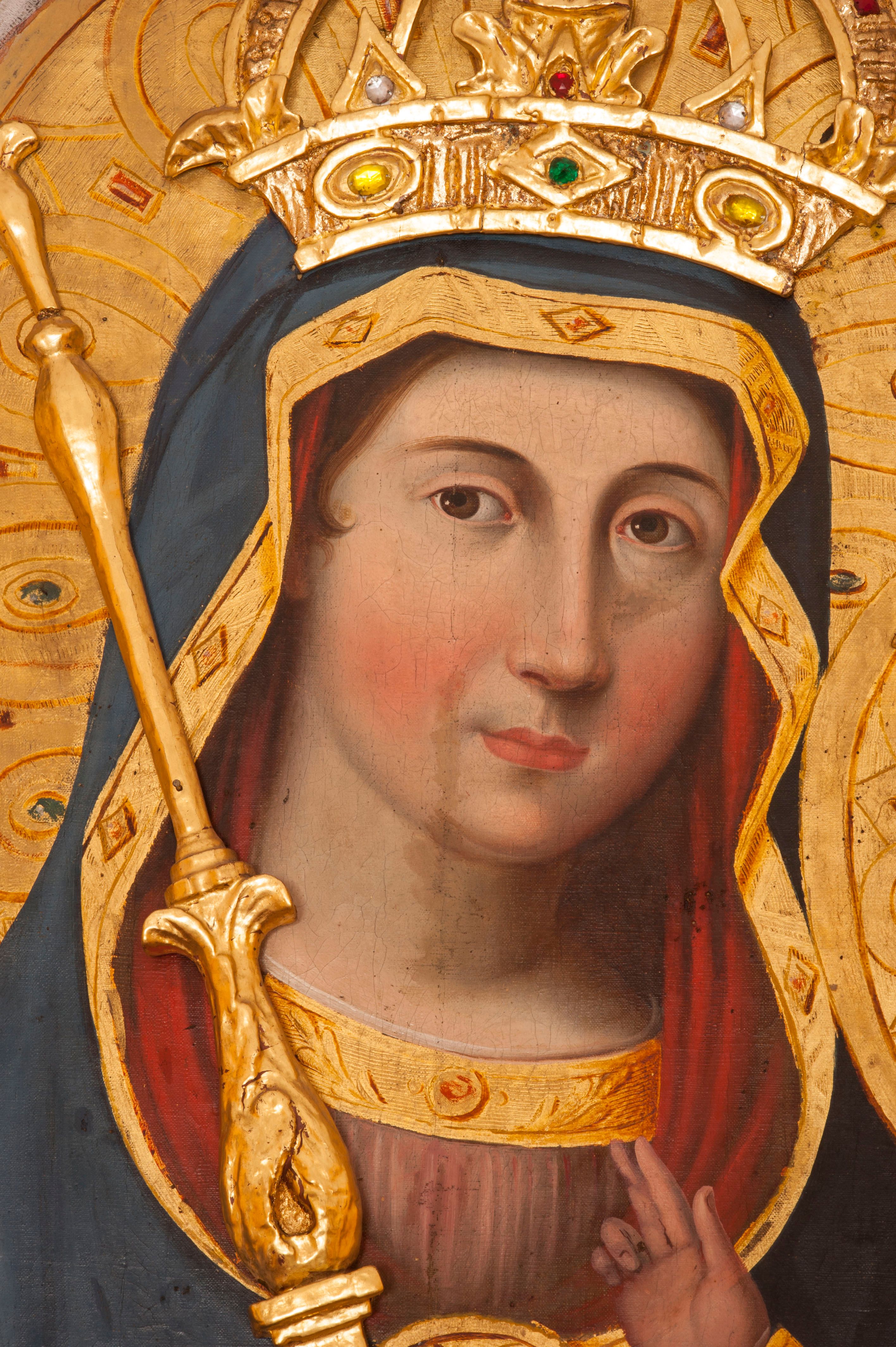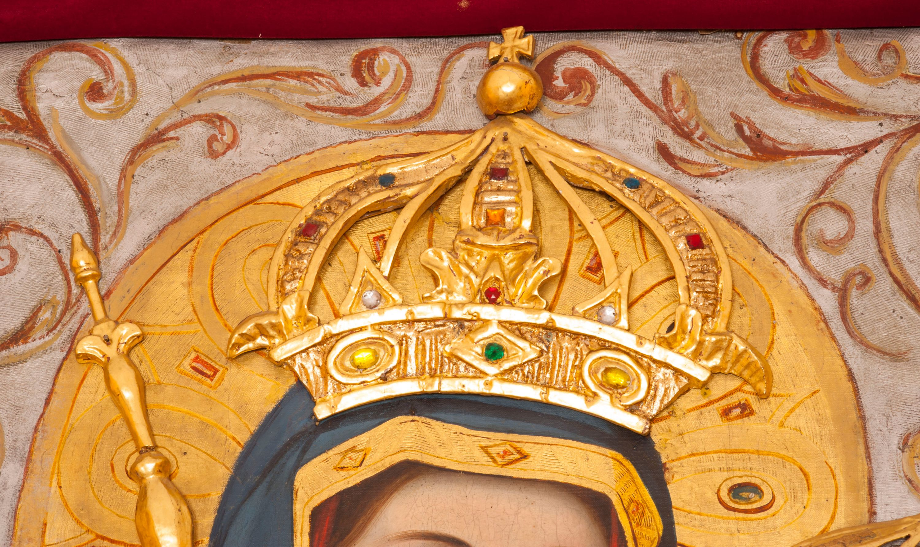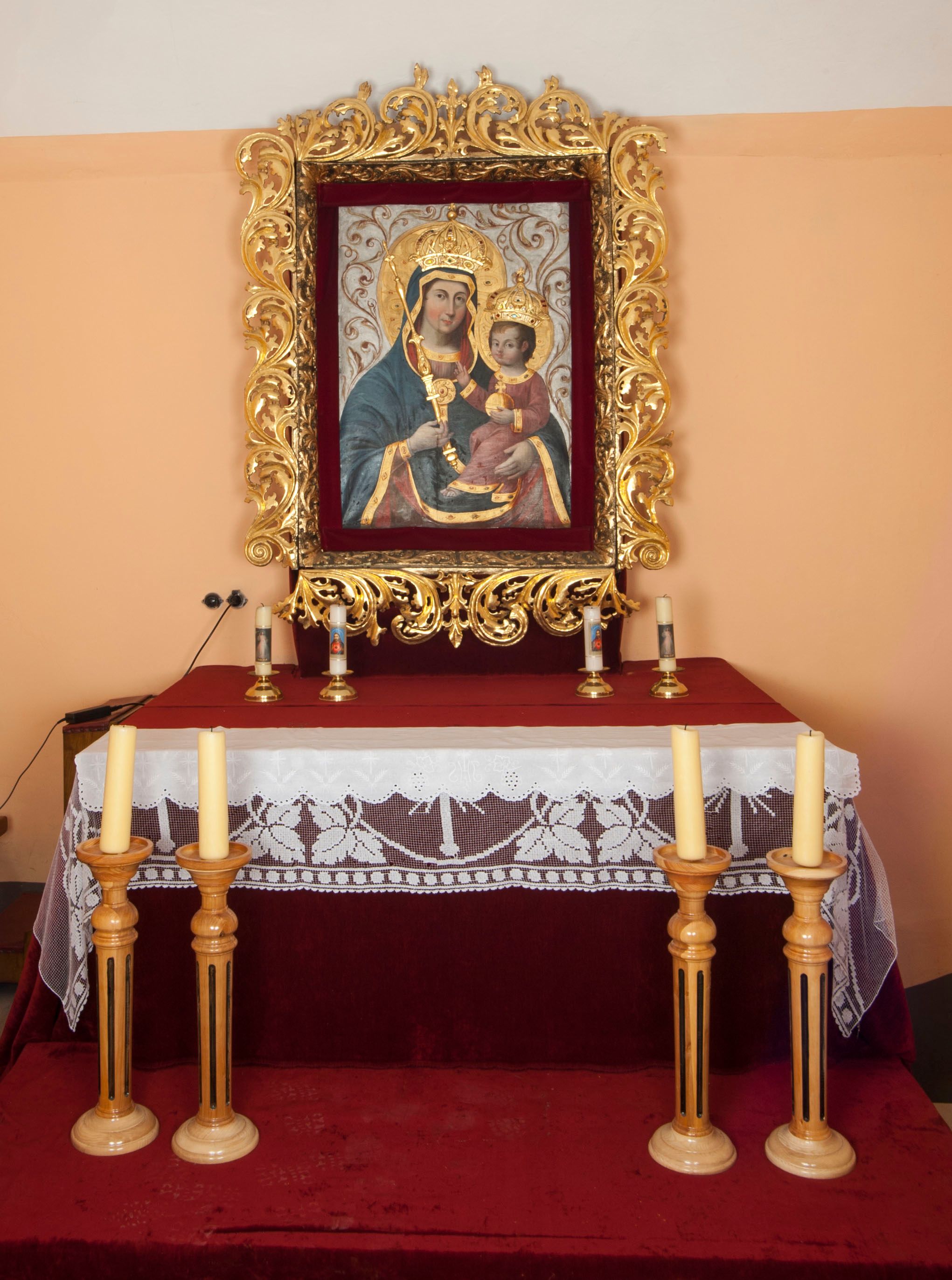 The painting of Madonna and the Child was made in the first half of the 19th century (before 1845). In the years 1845 - 1956 it could be found by the high altar, nailed and pulled over the old painting of Madonna of Gaj. After 1956 it was moved to the chapel of Virgin Mary. The discussed painting was supposed to be a reproduction of the 15th-century painting of Madonna of Gaj, but both works are different and represent two iconographic types.