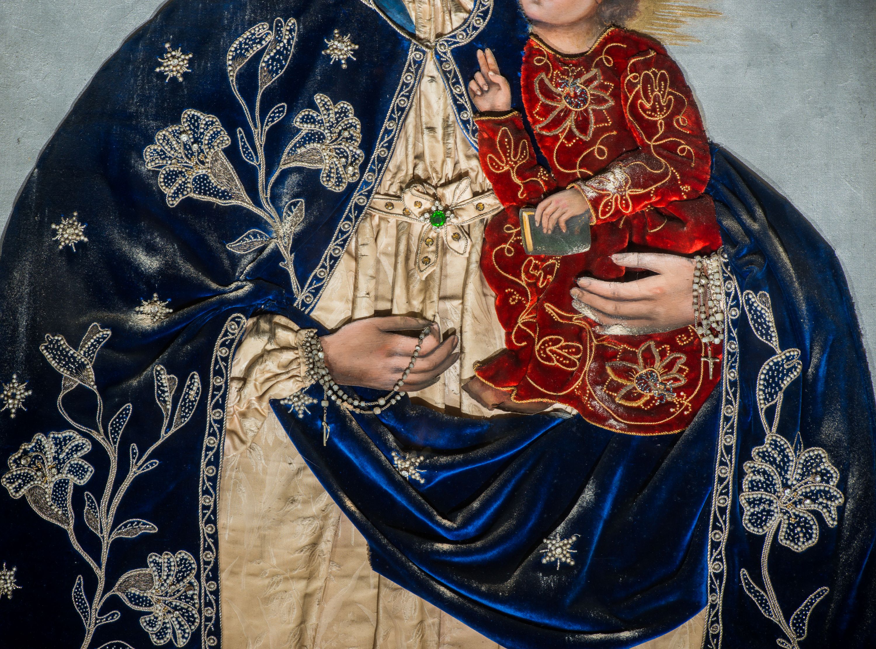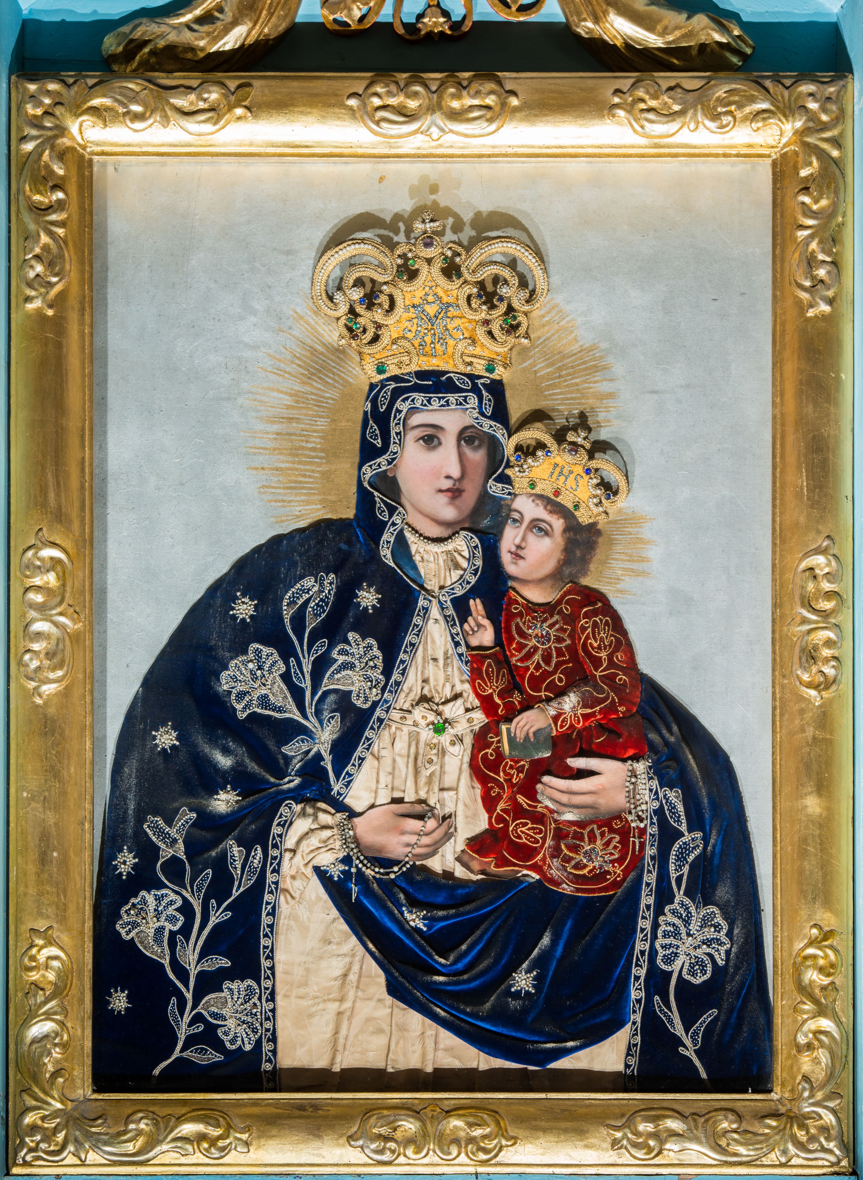 Madonna and the Child – the image in the altar of the side chapel in Trzebunia was painted in the 19th or 20th century and is a modern version of the iconographic type of Hodegetria (also Our Lady of the Way) – Mary as a guide pointing to Jesus. Body parts are painted, the rest of the figure is covered with richly decorated robes and crowns.