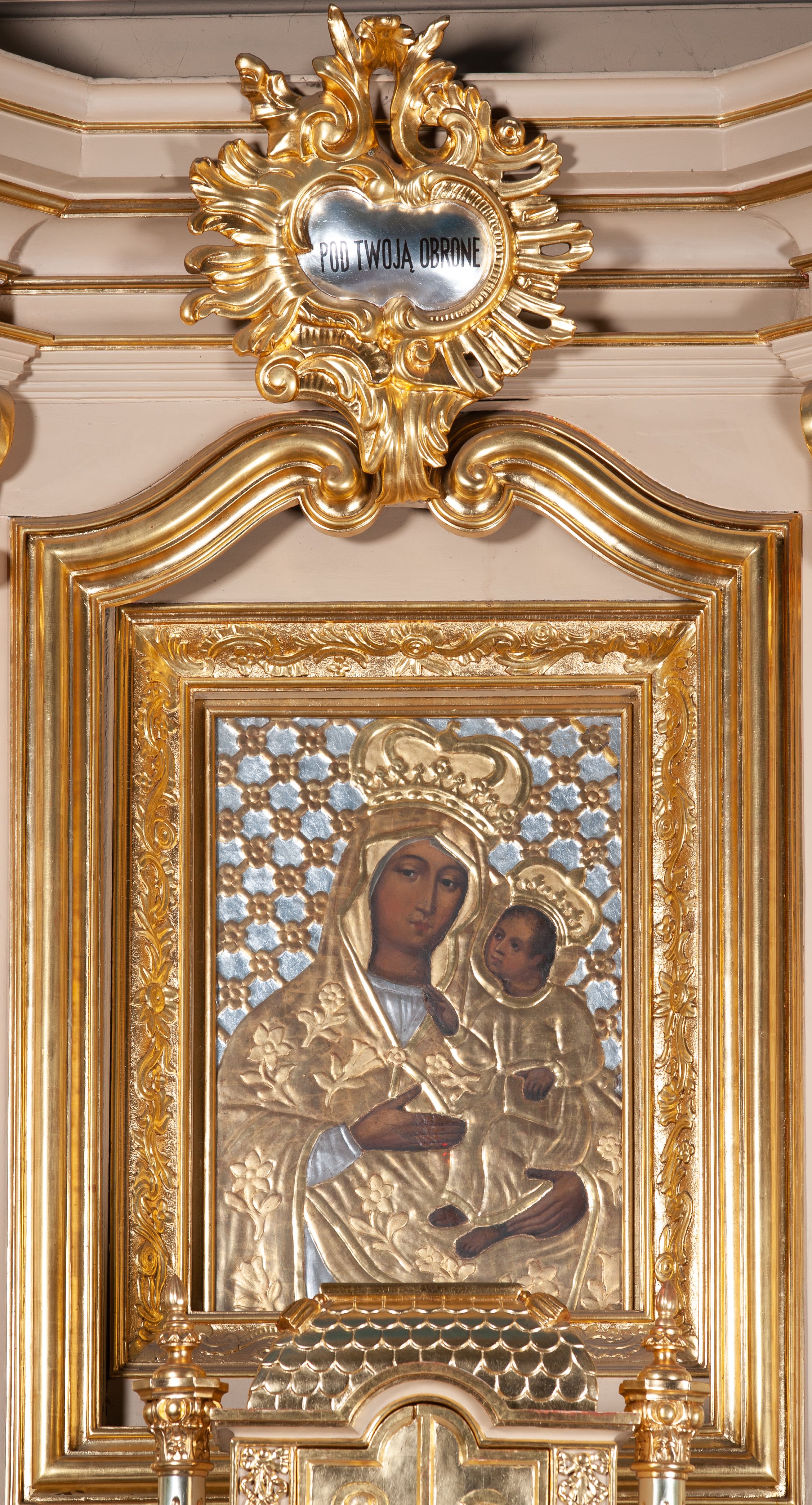 The painting from 1520 depicting the Madonna and the Child, located in the high altar of the Krzęcin church, is based on the representation of Madonna of Doudleby (Piekary), whose reproductions were widespread in Poland in the 15th century.