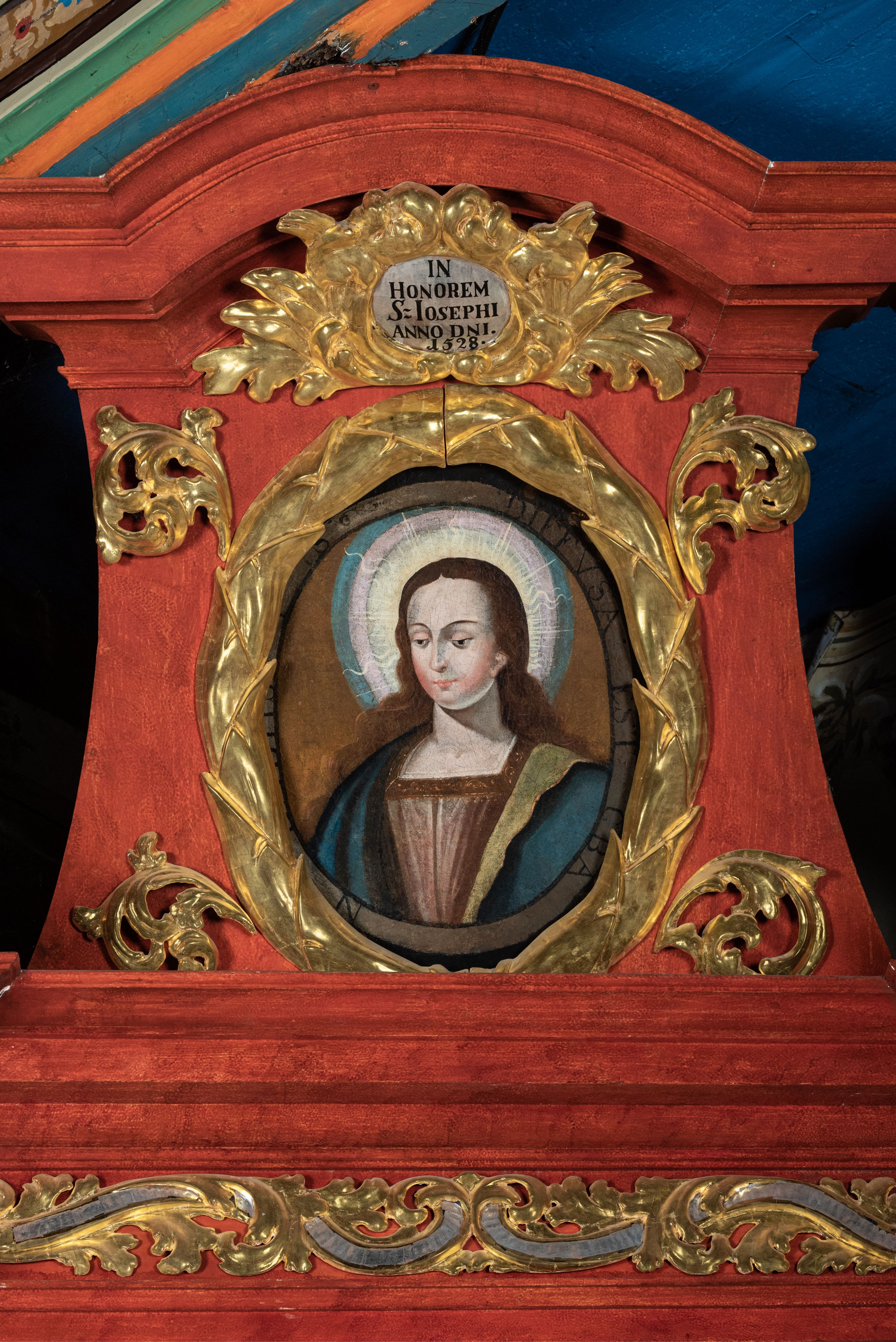 The altar of Saint Joseph with the second twin side altar of Saint Joachim and Saint Anne was created at the beginning of the 18th century, before 1728. It was consecrated in 1771 by the suffragan bishop of Chełm, Dominik Józef Kiełczewski. The painting in the finial of the altar was mentioned for the first time in the church inventory made in 1833 as "a small picture of Saint John". Also in the inventories from 1842 and 1860 it was noted as a presentation of Saint John. In 1851, the altar and paintings were renovated by the painter and gilder Wojciech Dembowski. At the turn of 1994 and 1995 it was conserved in the workshop of Filip Kowalczyk in Cracow. Research carried out during restoration has shown that the painting was not originally intended for the altar of Saint Joseph. Its dimensions have been adapted to the frame in which it was placed. Although the painting in question in the church inventories was described as a representation of Saint John, according to Teresa Małkowska-Holcerowa the work should be identified as the image of Mary, whose presence "ideally completes the scene of the title image."