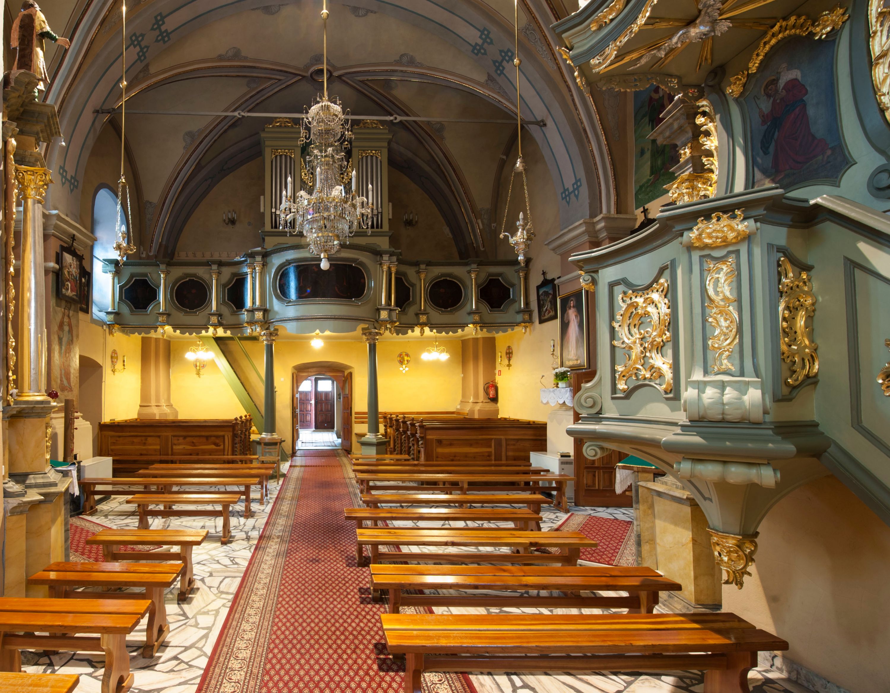 The music choir was created in the late Baroque style with the concave-convex balustrade pattern - typical of that period. According to records form the parish chronicle, it was created in 1744. Painted decorations in the form of stylized flower compositions on a black background, located in the area of windowsills are much later, probably created in the 19th century.