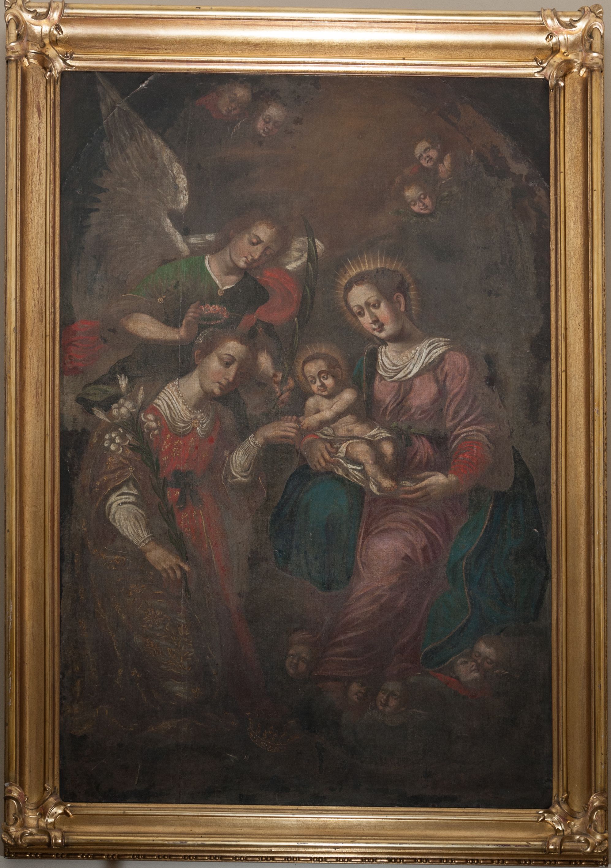 The painting that depicts Mystical Wedding of Saint Catherine was originally located in the high altar of previous church under the invocation of Saint Catherine in Krzeszów. Similarly to two other works in this church (paintings of Saint Stephen and of Virgin and Child with Saint Anne), it was created in the second half of 17th century in an unknown painting workshop. The scene presented there is an expression of very interesting form of devotion -mystical one, based on attempt to directly contact God through personal experience.