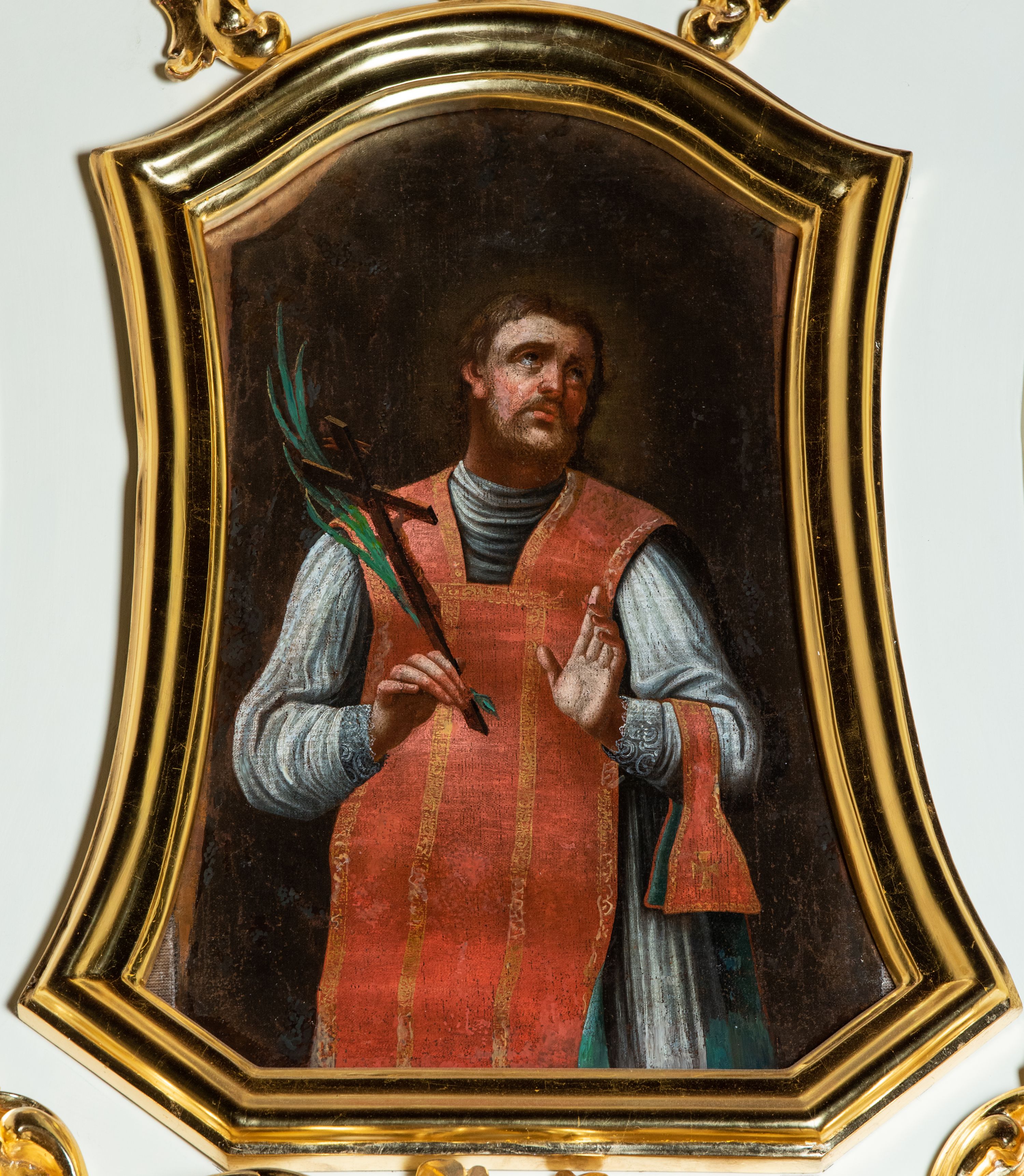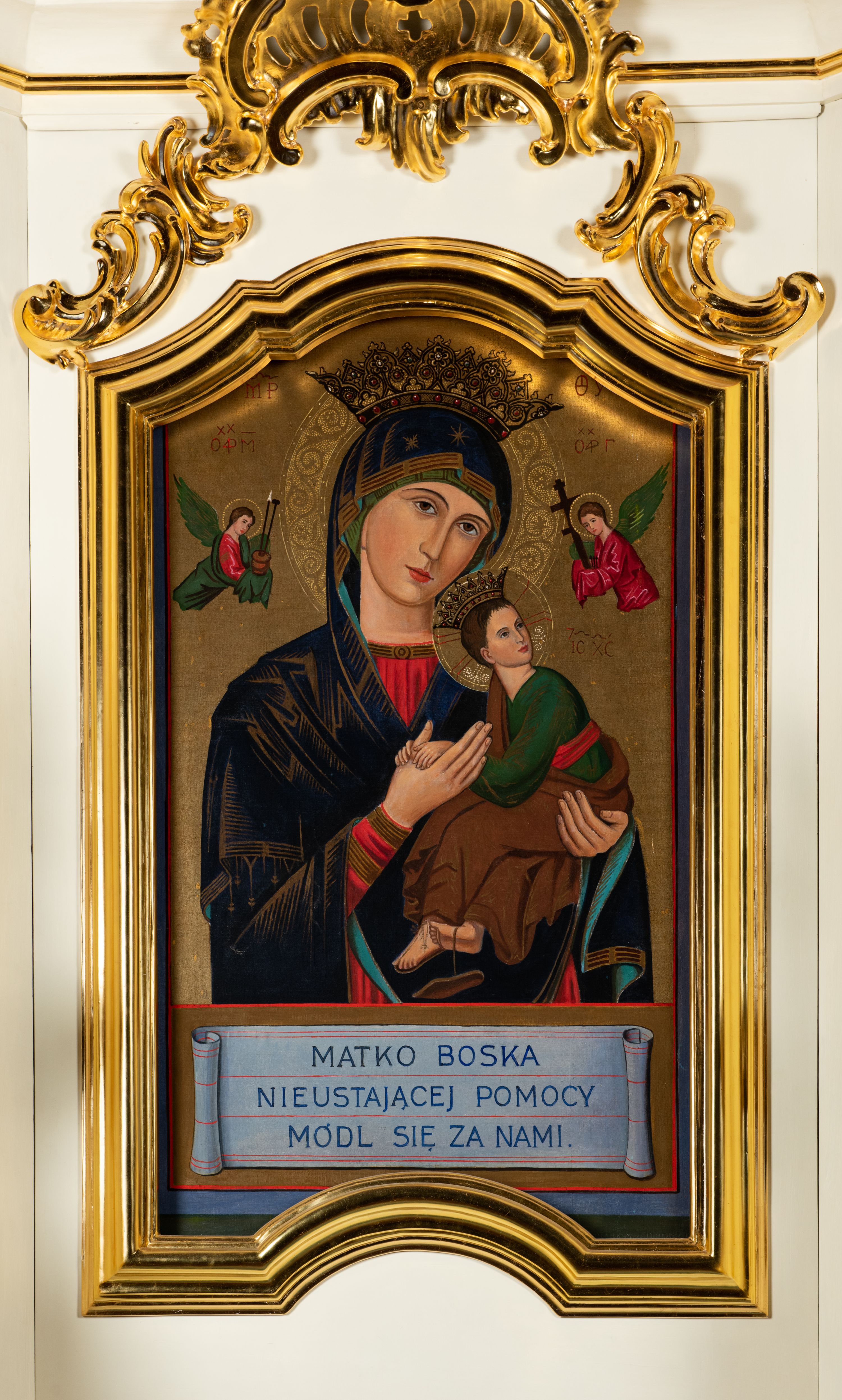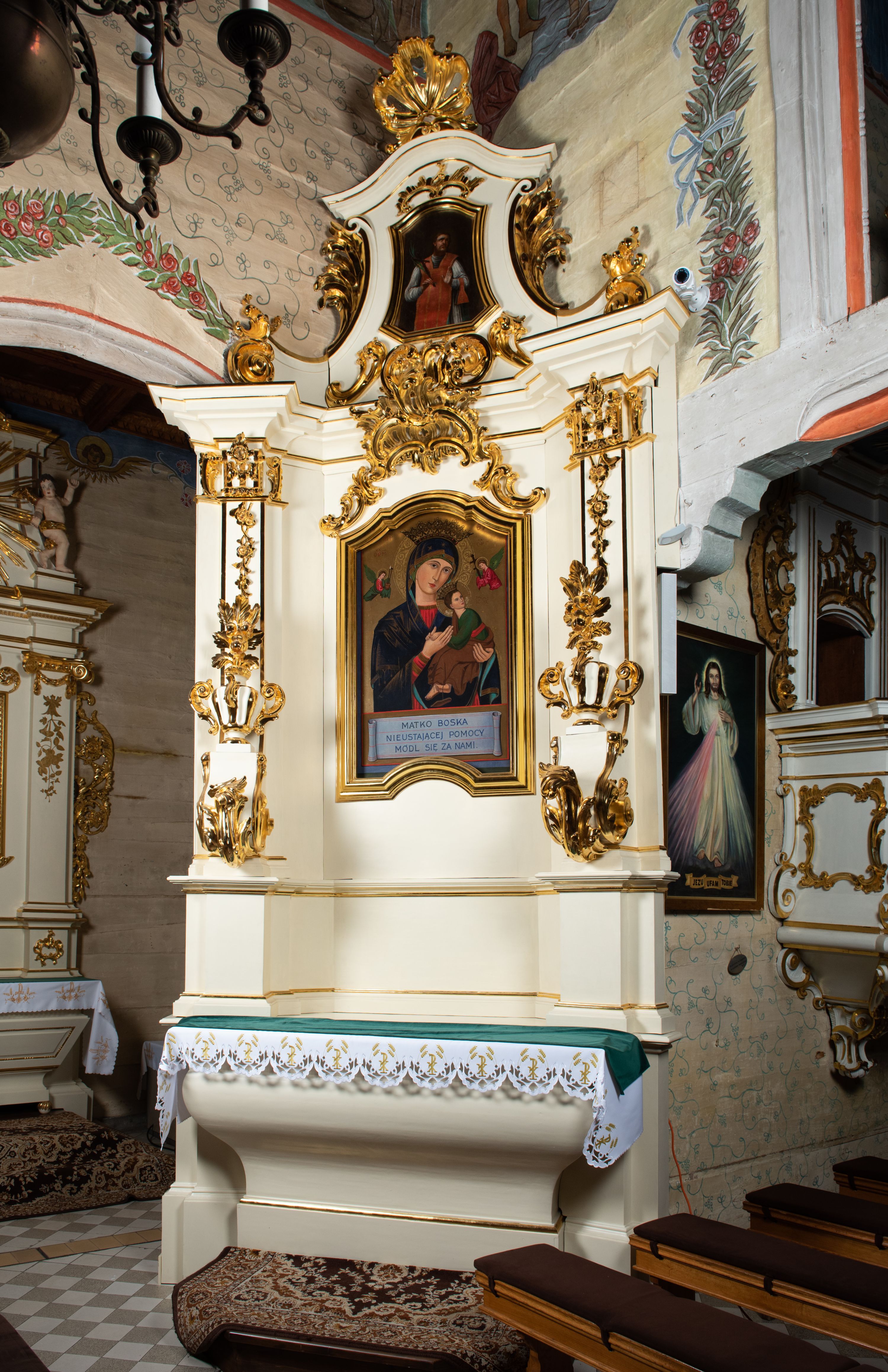 The side altar in the church in Marcyporęba was made in Rococo style probably by an anonymous employee of Antoni Gegenbaur in the second half of the 18th century. In the middle area there is a painting of Our Lady of Perpetual Help, and in the altar finial there is a painting of Saint Valentine.